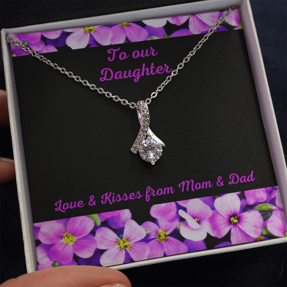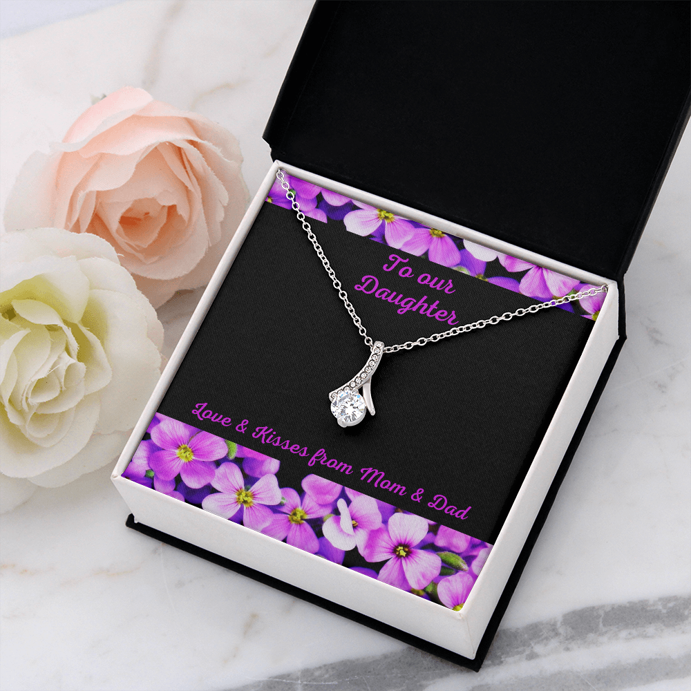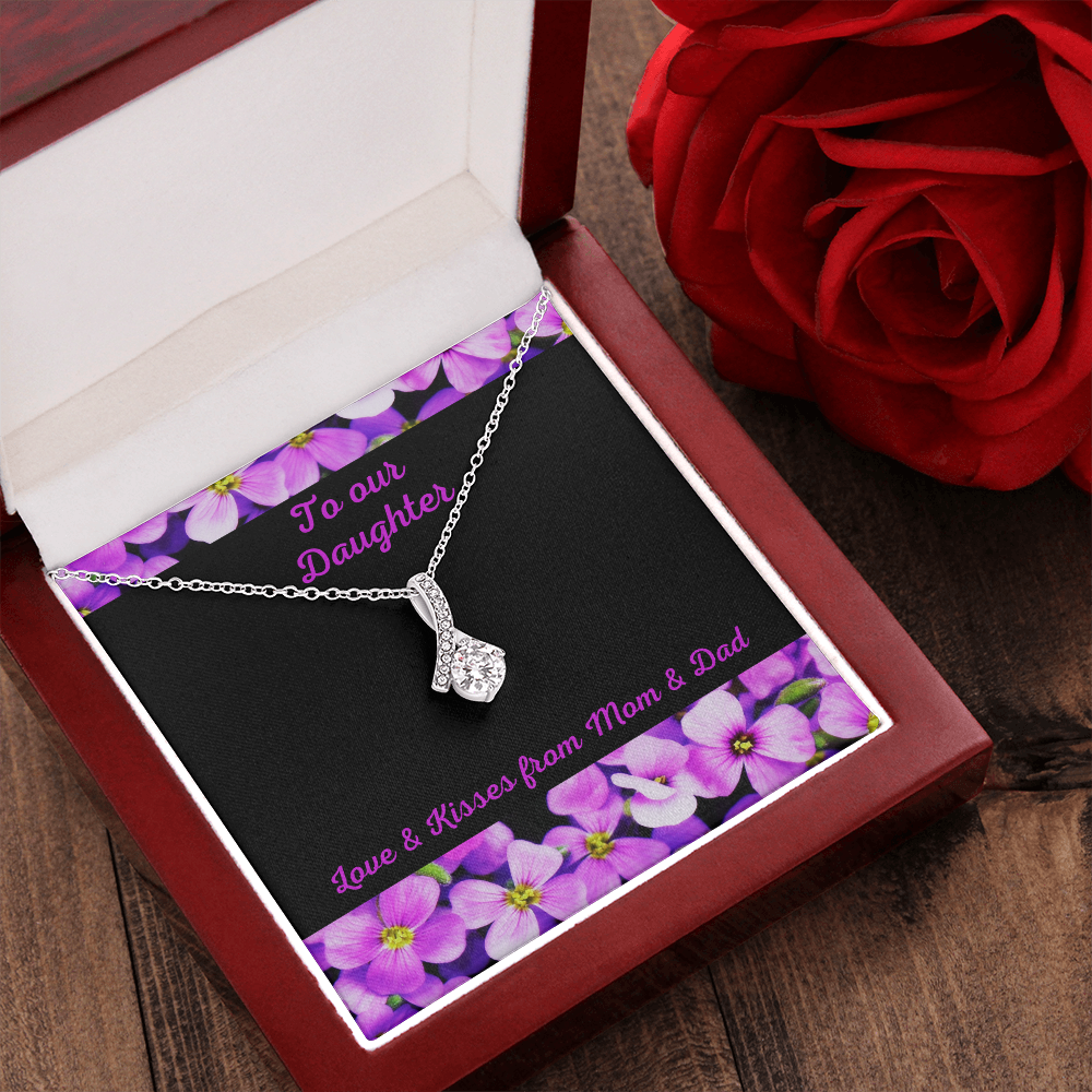 Melt her heart with this ALLURING BEAUTY necklace gift! The petite ribbon shaped pendant is finished with 14K white gold over stainless steel, and is embellished with dainty clear crystals surrounded by a sparkling 7mm round cut Cubic Zirconia.