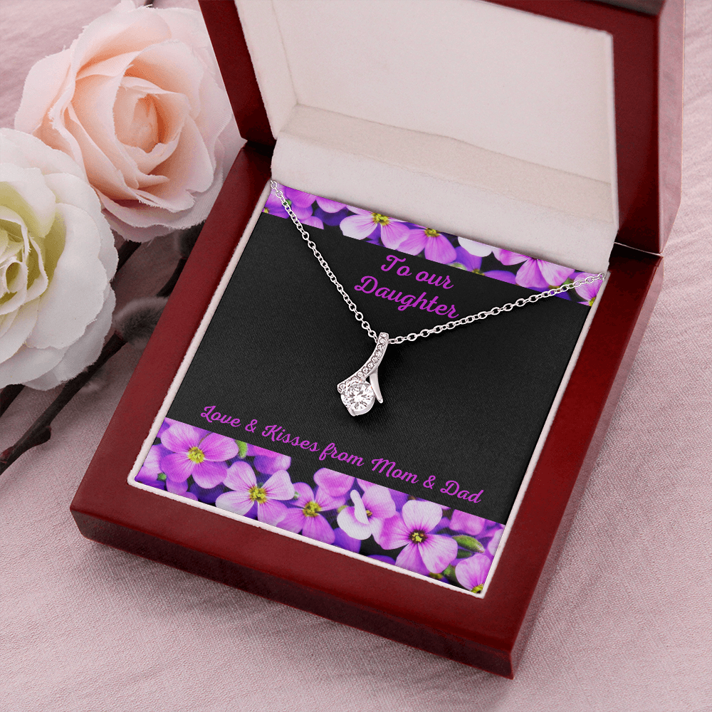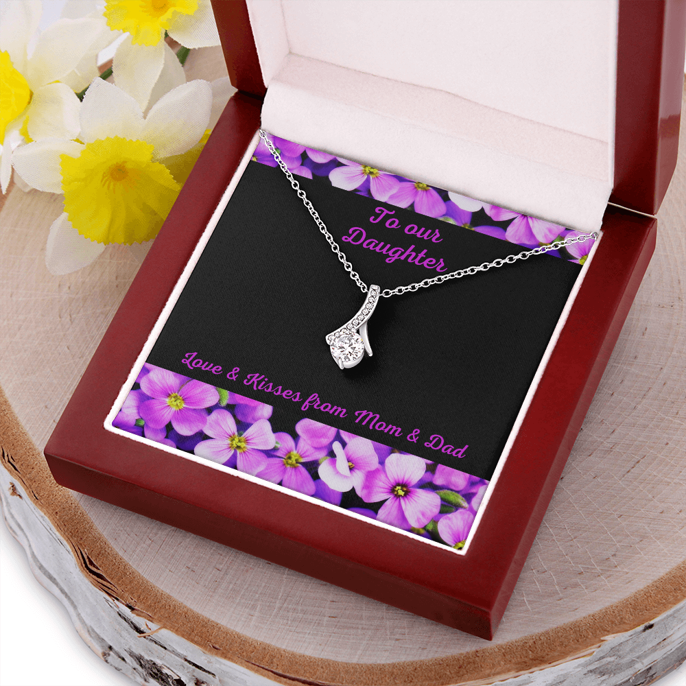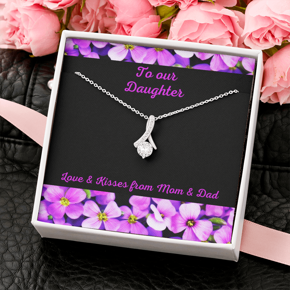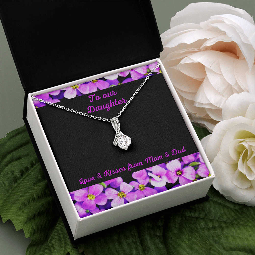 Melt her heart with this ALLURING BEAUTY necklace gift! The petite ribbon shaped pendant is finished with 14K white gold over stainless steel, and is embellished with dainty clear crystals surrounded by a sparkling 7mm round cut Cubic Zirconia.