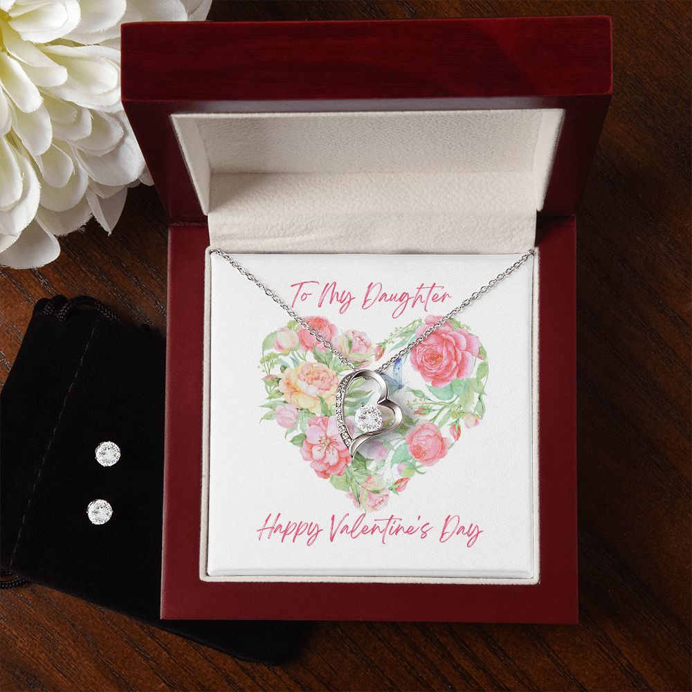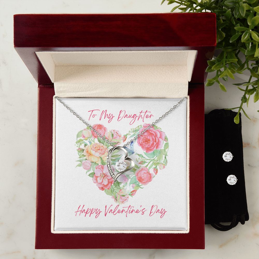 Pink Flower Heart Valentine's Forever Heart Necklace & Cubic Zirconia Earring Set