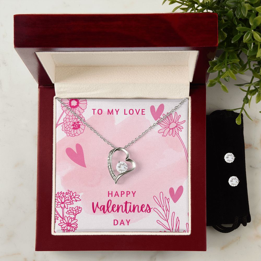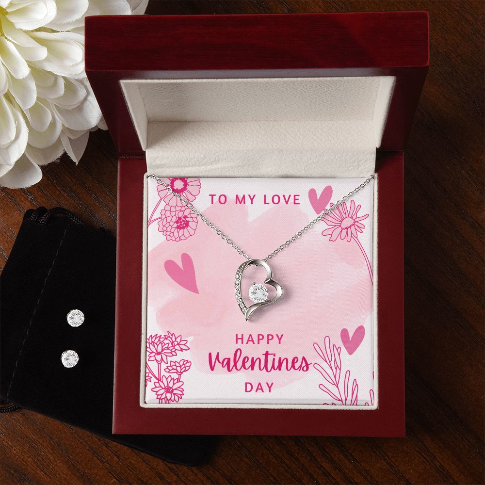 Pink Heart & Flowers Valentine's Forever Heart Necklace & Cubic Zirconia Earring Set