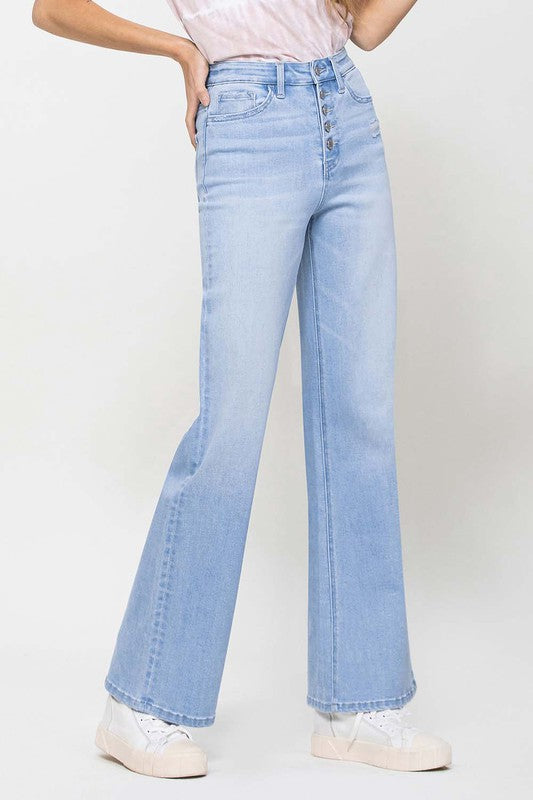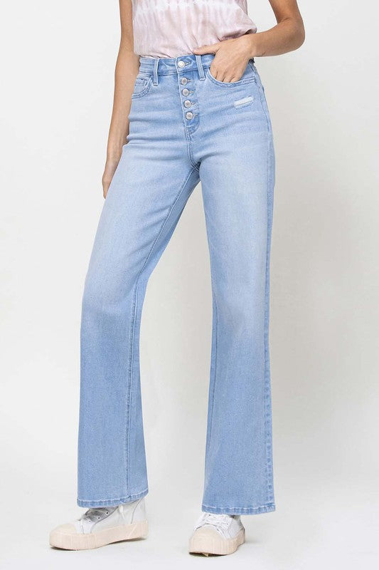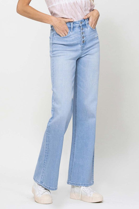 Crafted from comfortable stretch denim, these jeans feature a high waist for a flattering fit. The relaxed and wide legs capture the essence of the 90's with a loose, comfortable feel. The button-up design adds a classic touch, and the full length provides versatility for various styling options. Channel the spirit of the 90's with these vintage-inspired jeans, offering a relaxed fit that embraces both comfort and fashion.