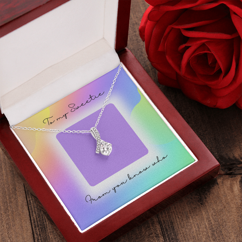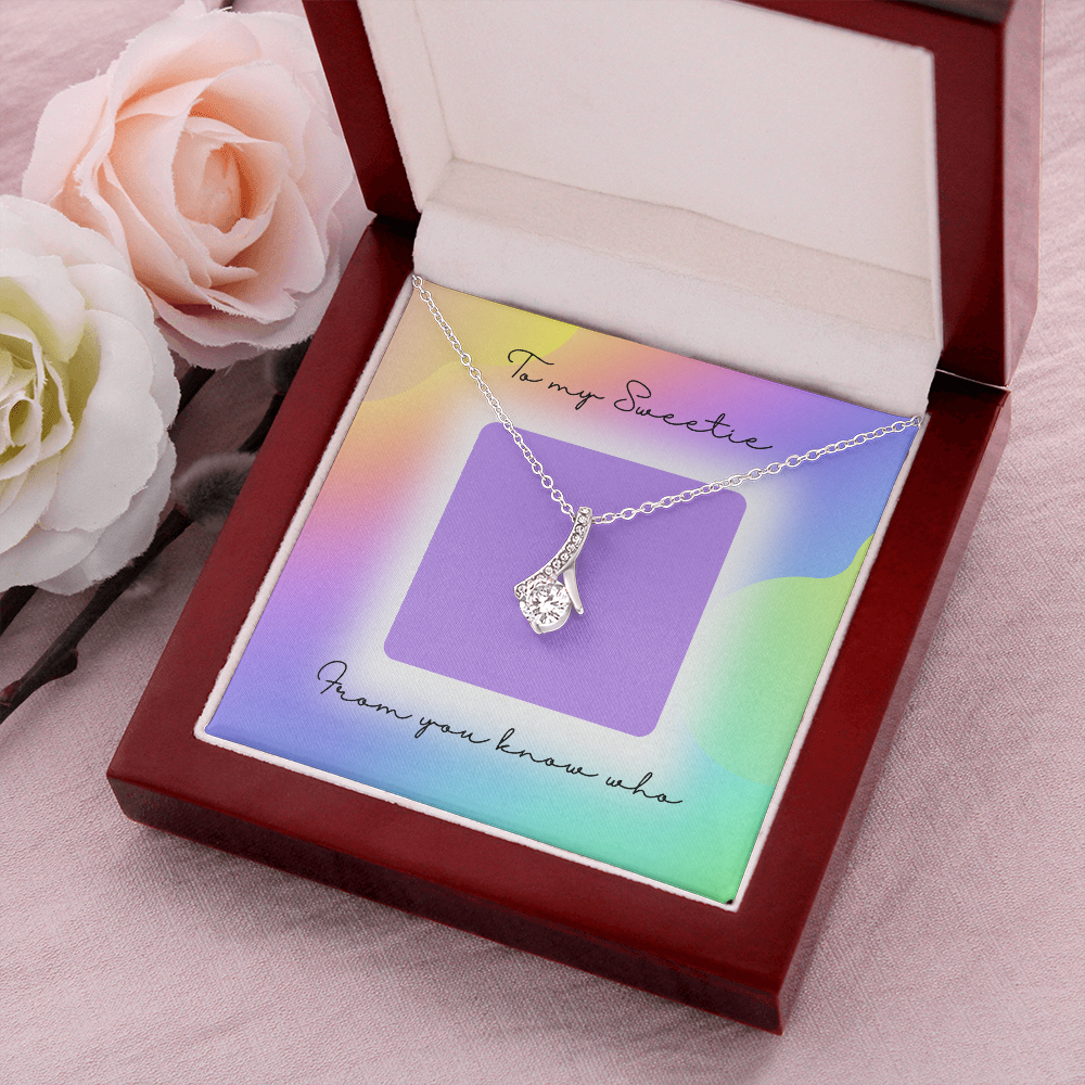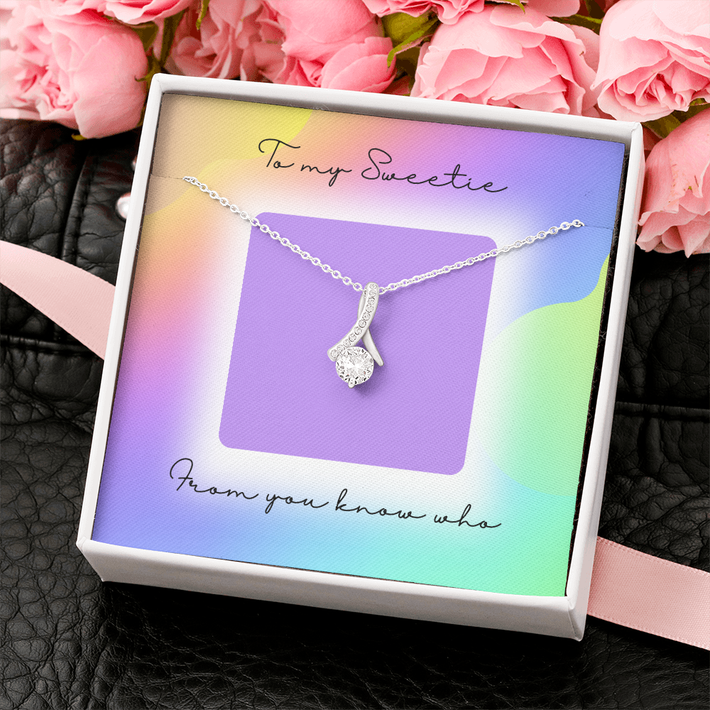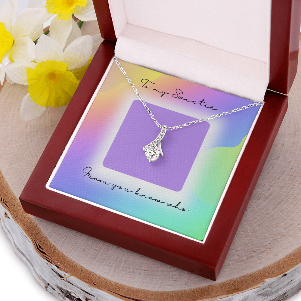 Melt her heart with this ALLURING BEAUTY necklace gift! The petite ribbon shaped pendant is finished with 14K white gold over stainless steel, and is embellished with dainty clear crystals surrounded by a sparkling 7mm round cut Cubic Zirconia.