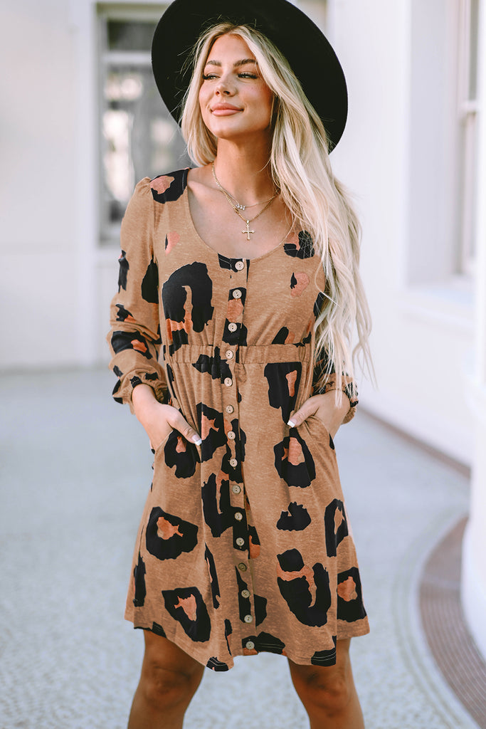 Leopard Print Button Front Bubble Sleeve Loose Knit Dress