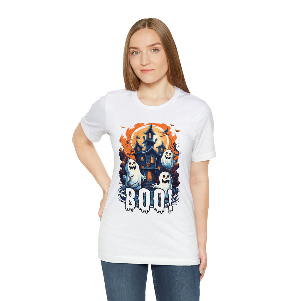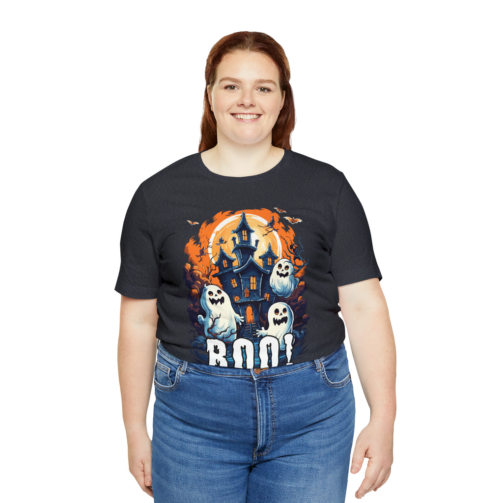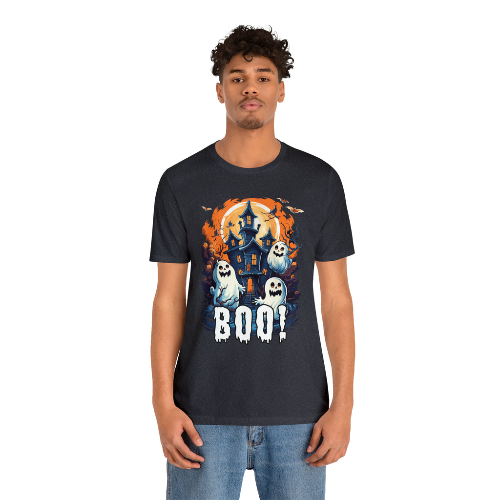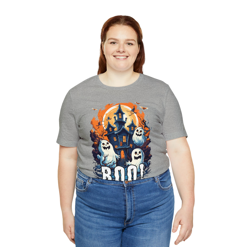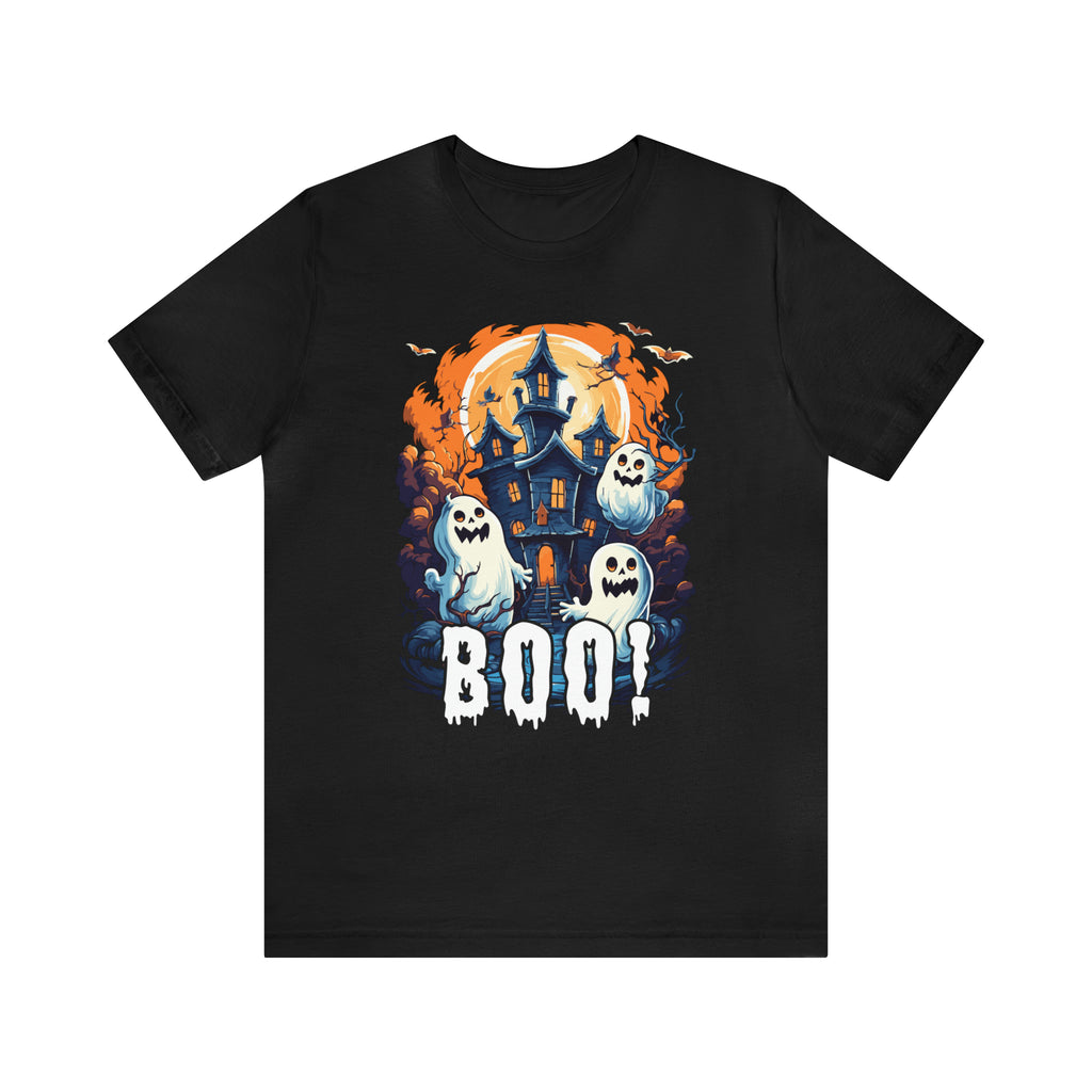 Boo! Haunted House Halloween T-Shirt | Scary House with Ghosts Tee | Bella Canvas 3001Unisex | Spooky Short Sleeve Tshirt