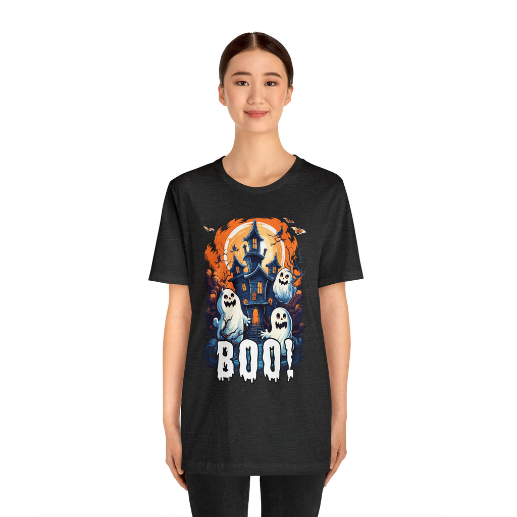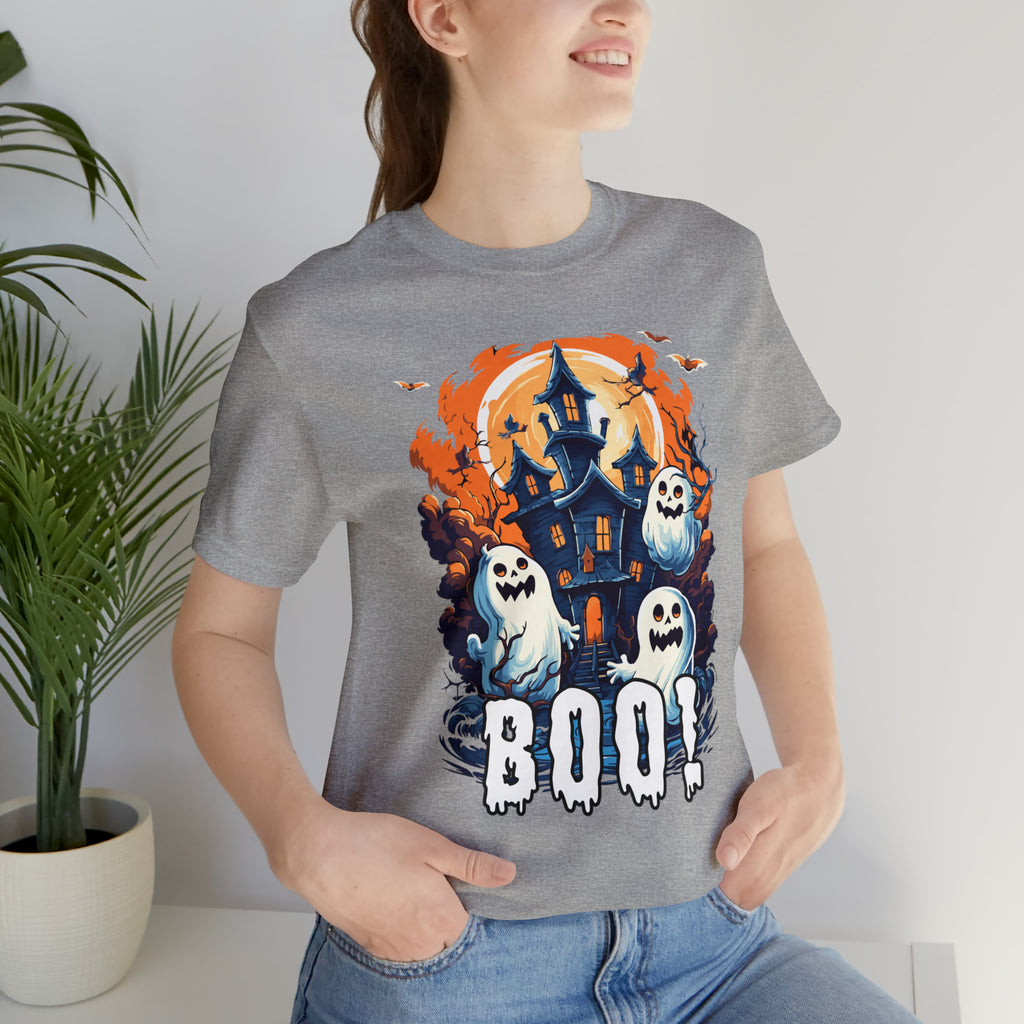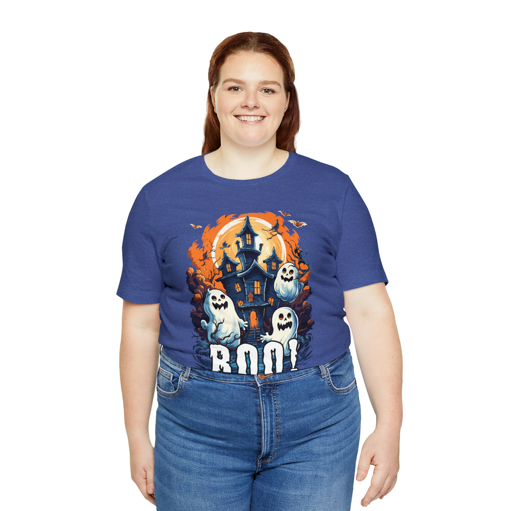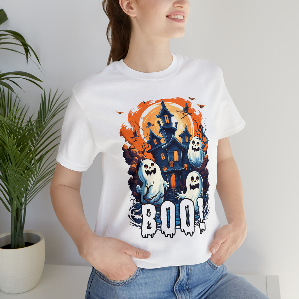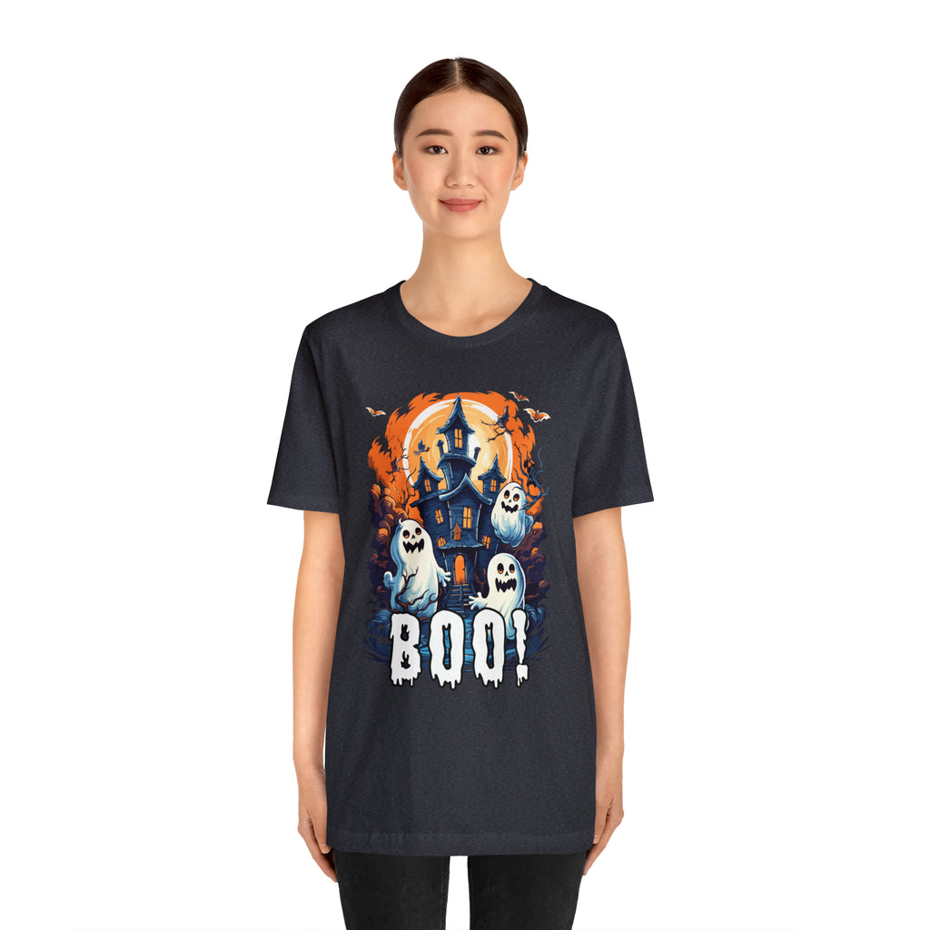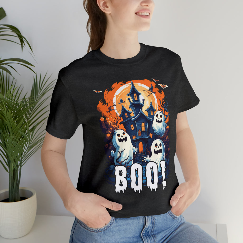 Boo! Haunted House Halloween T-Shirt | Scary House with Ghosts Tee | Bella Canvas 3001Unisex | Spooky Short Sleeve Tshirt