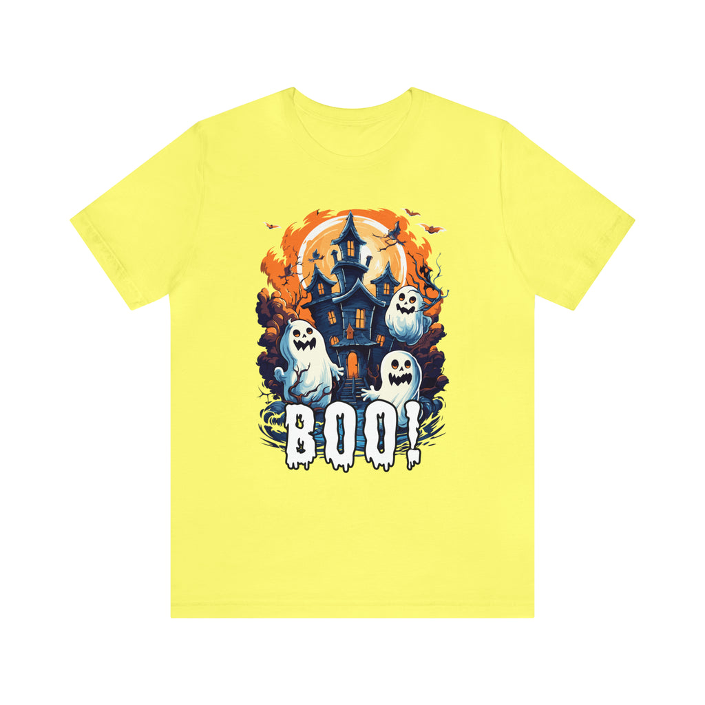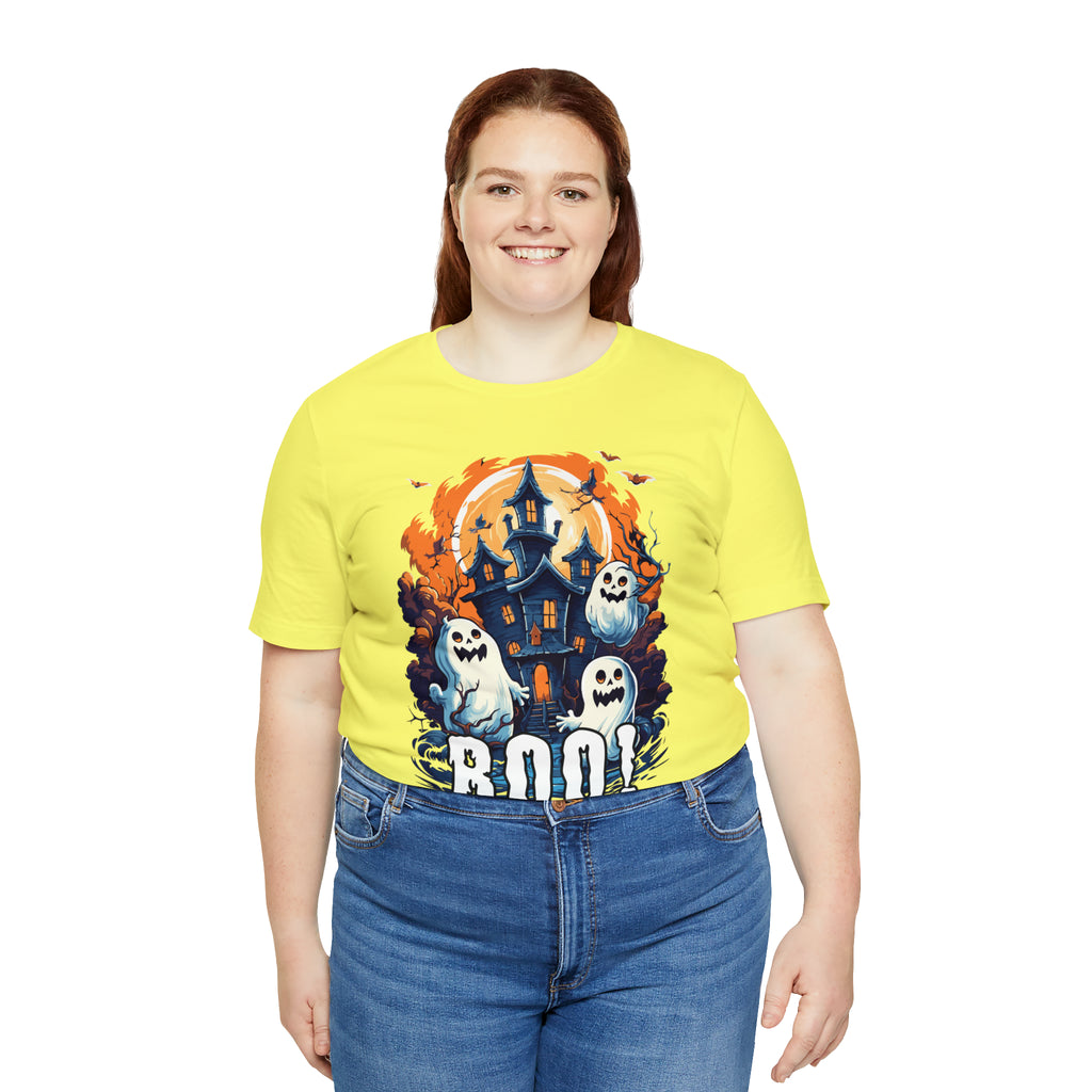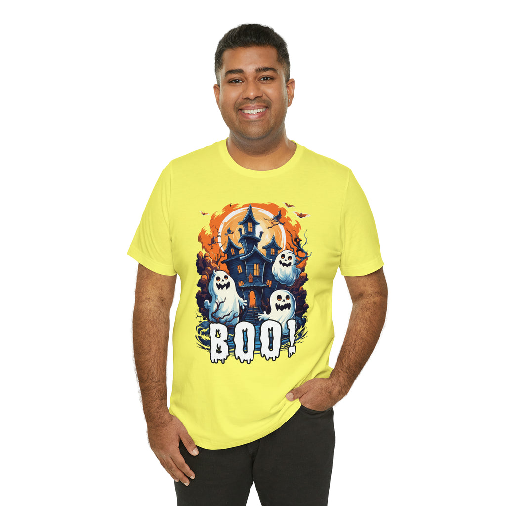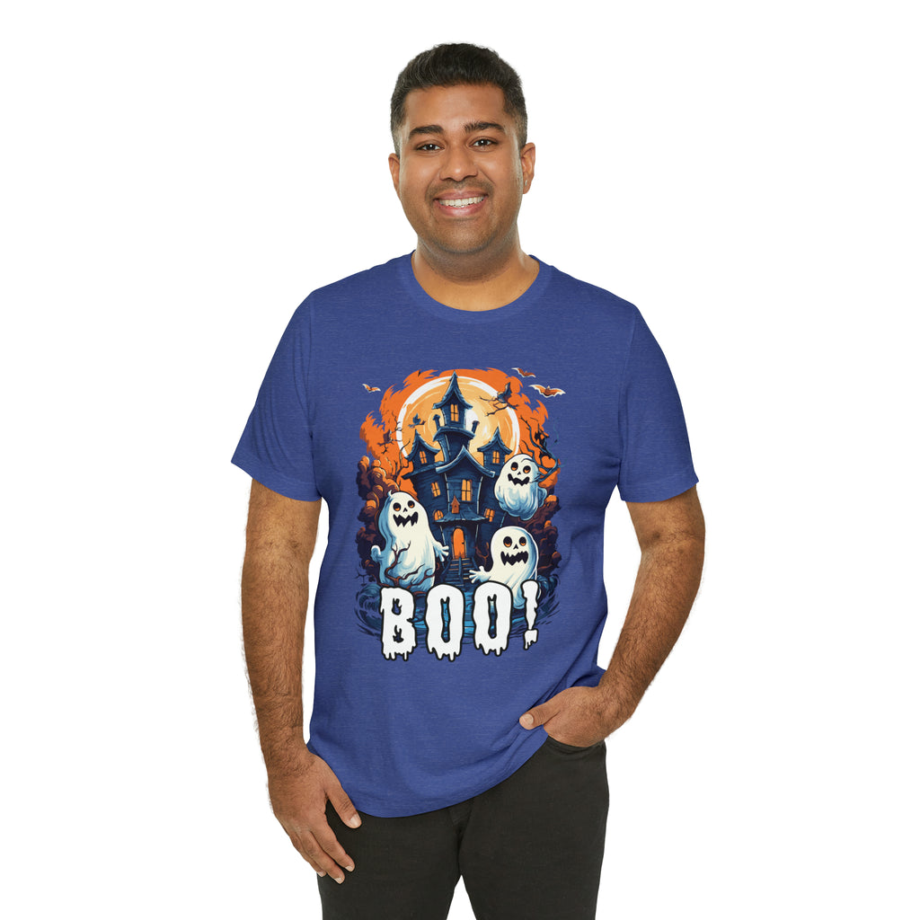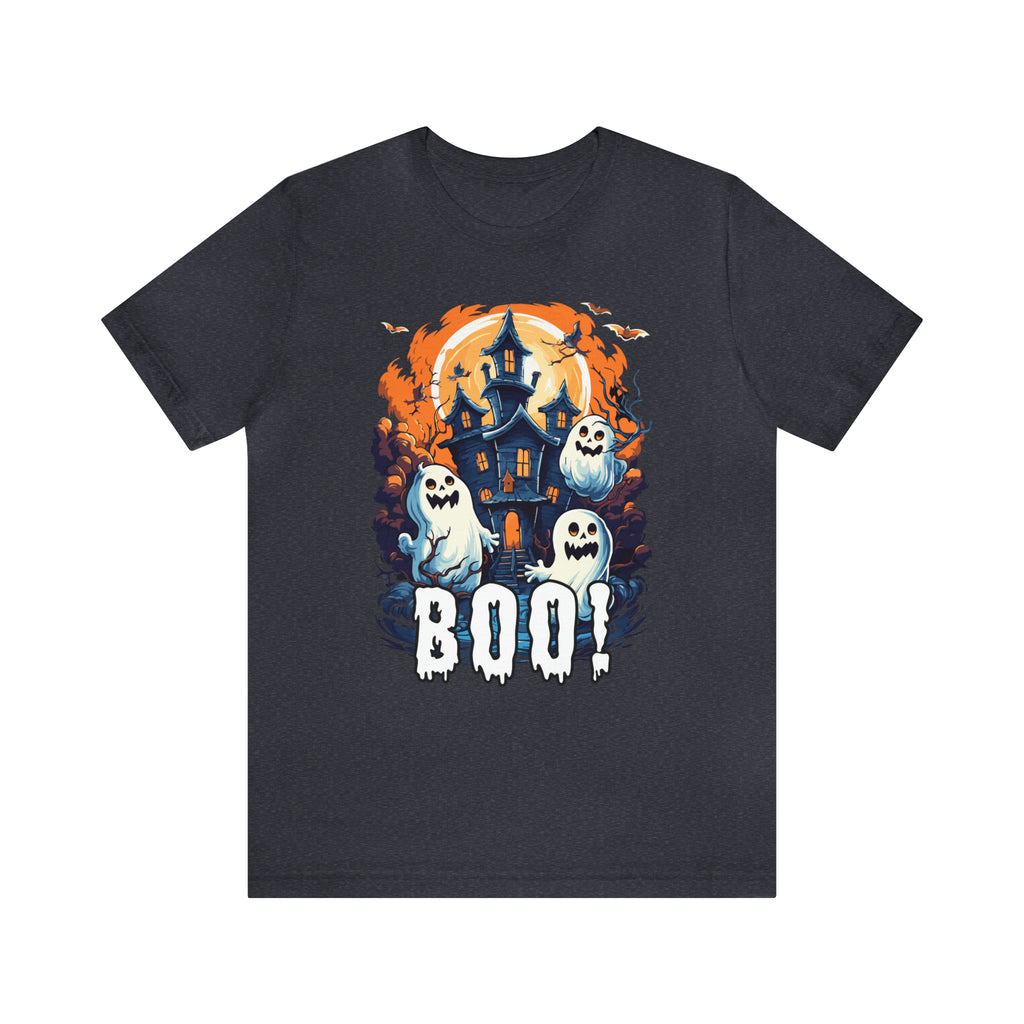 Boo! Haunted House Halloween T-Shirt | Scary House with Ghosts Tee | Bella Canvas 3001Unisex | Spooky Short Sleeve Tshirt