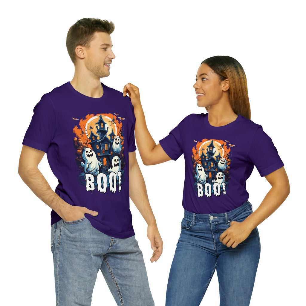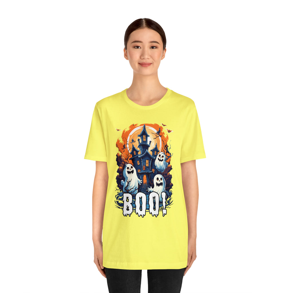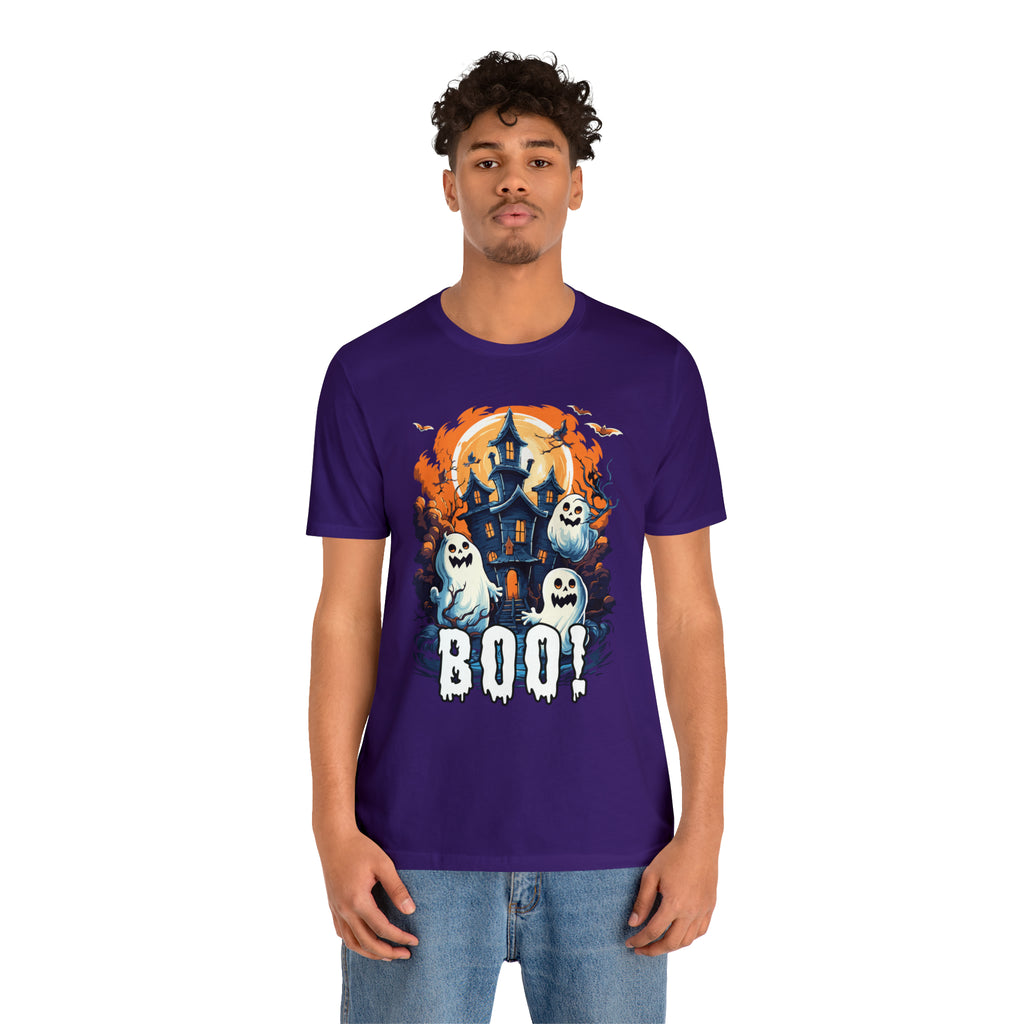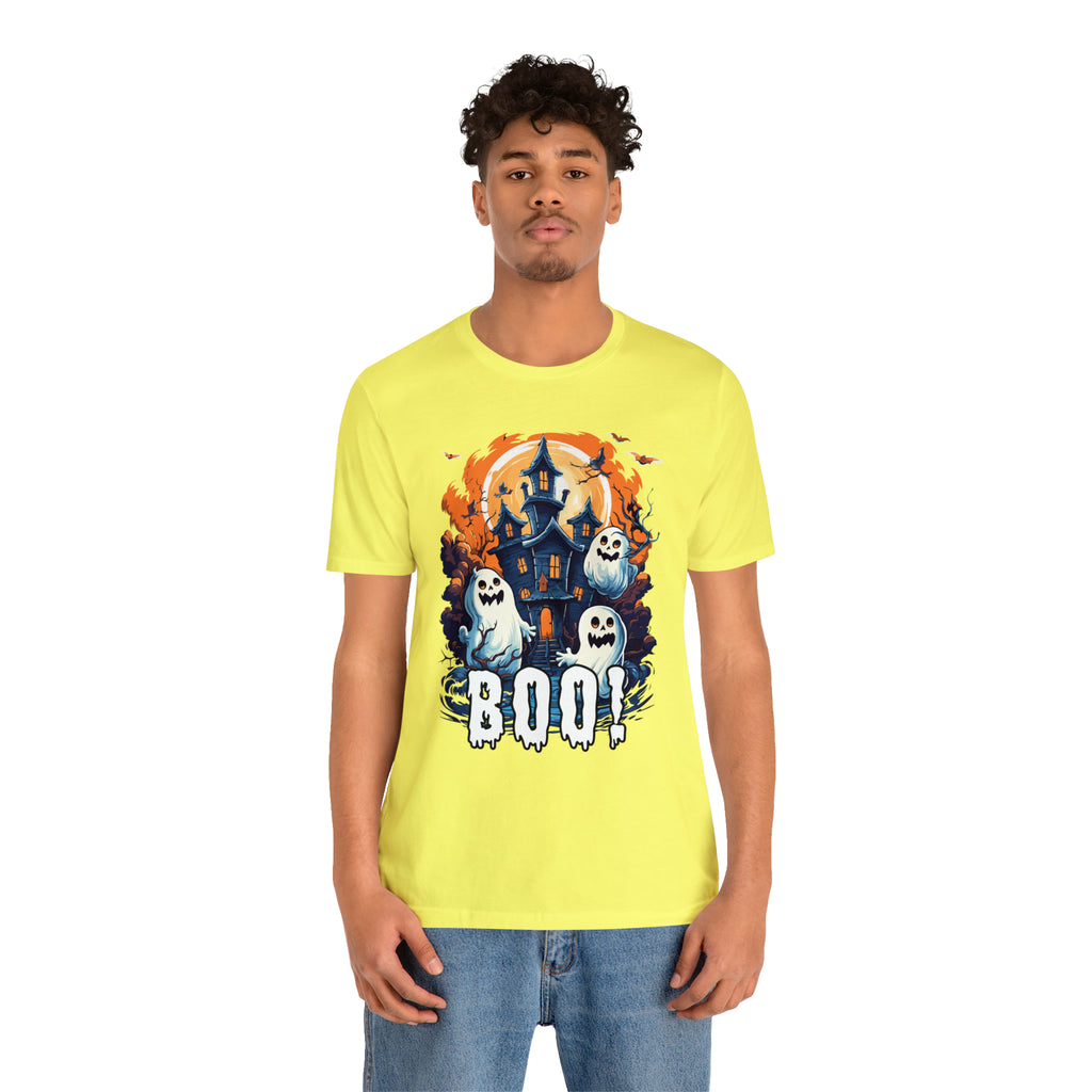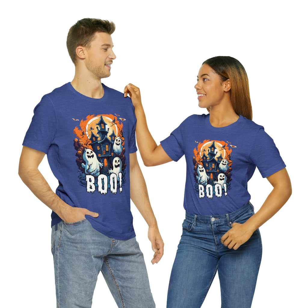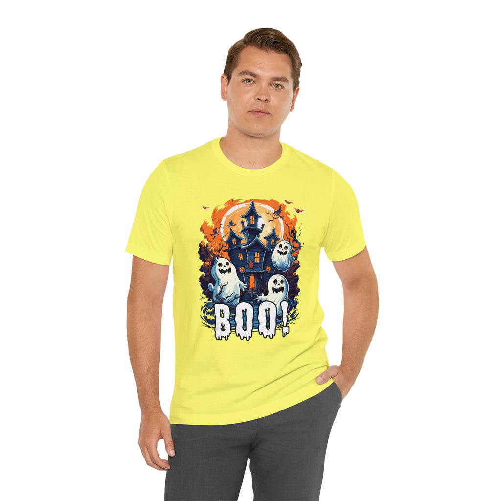Boo! Haunted House Halloween T-Shirt | Scary House with Ghosts Tee | Bella Canvas 3001Unisex | Spooky Short Sleeve Tshirt