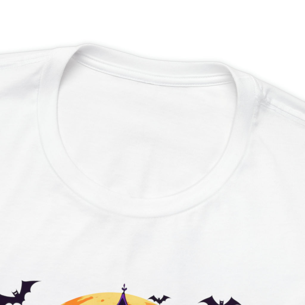 Our "Halloween Haunted House" design showcases a creepy haunted house with bats flying around, exuding an eerie and mysterious aura that perfectly captures the spirit of Halloween. This tee is sure to evoke a sense of thrill and excitement as you join in the Halloween revelry!