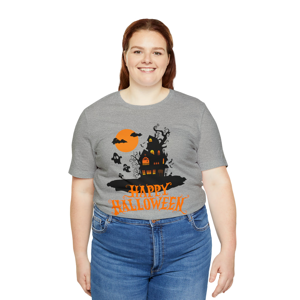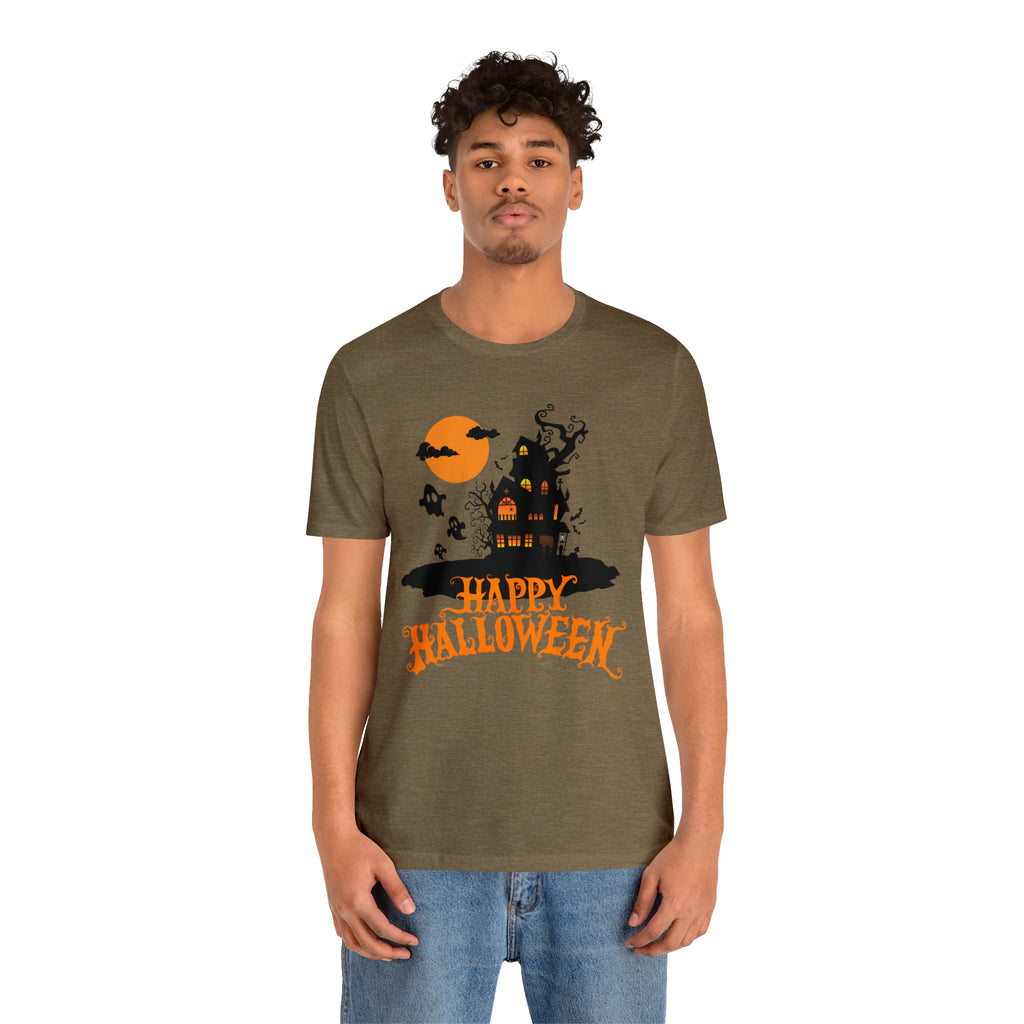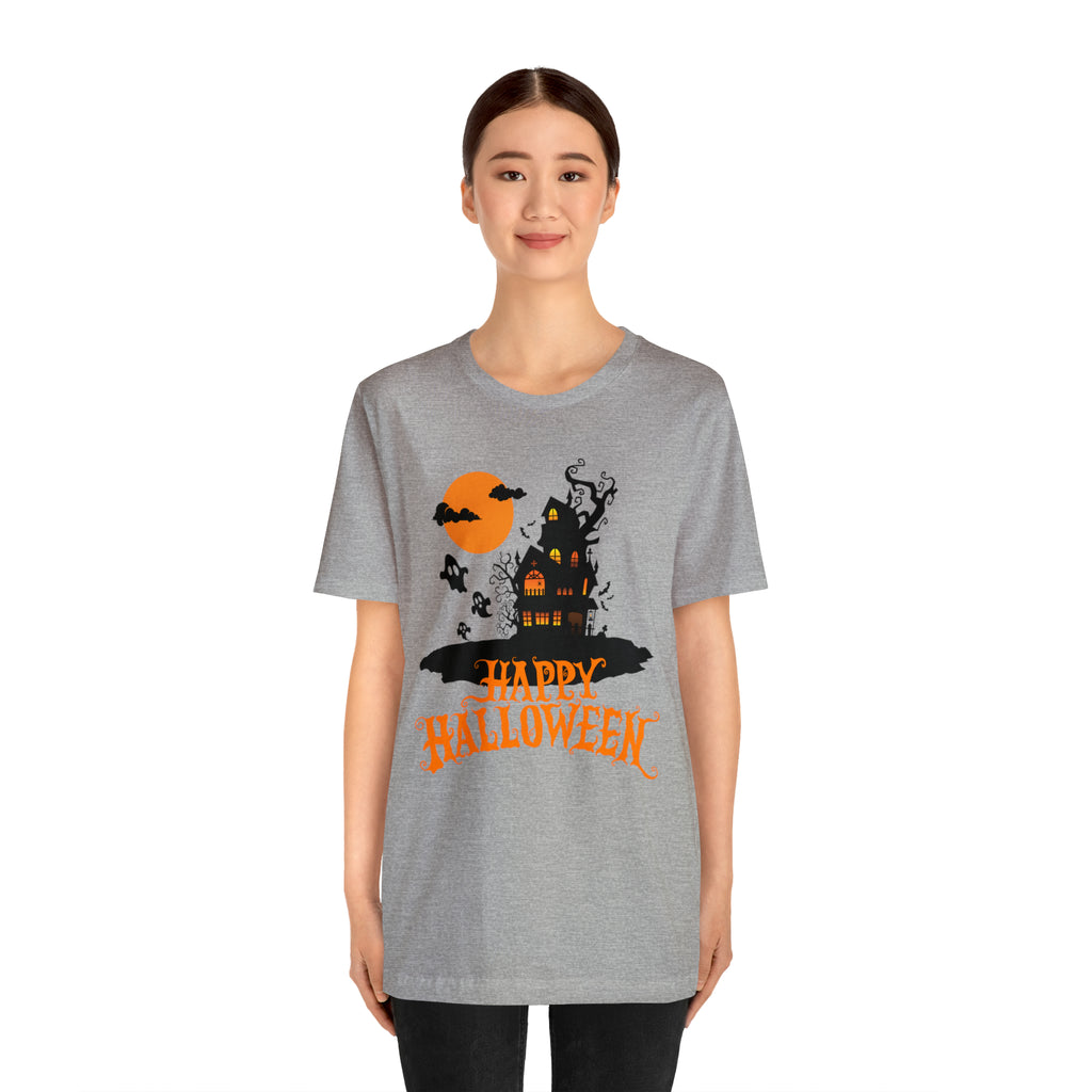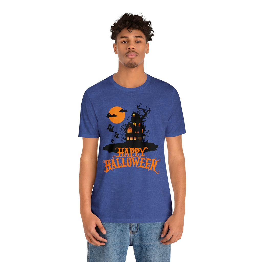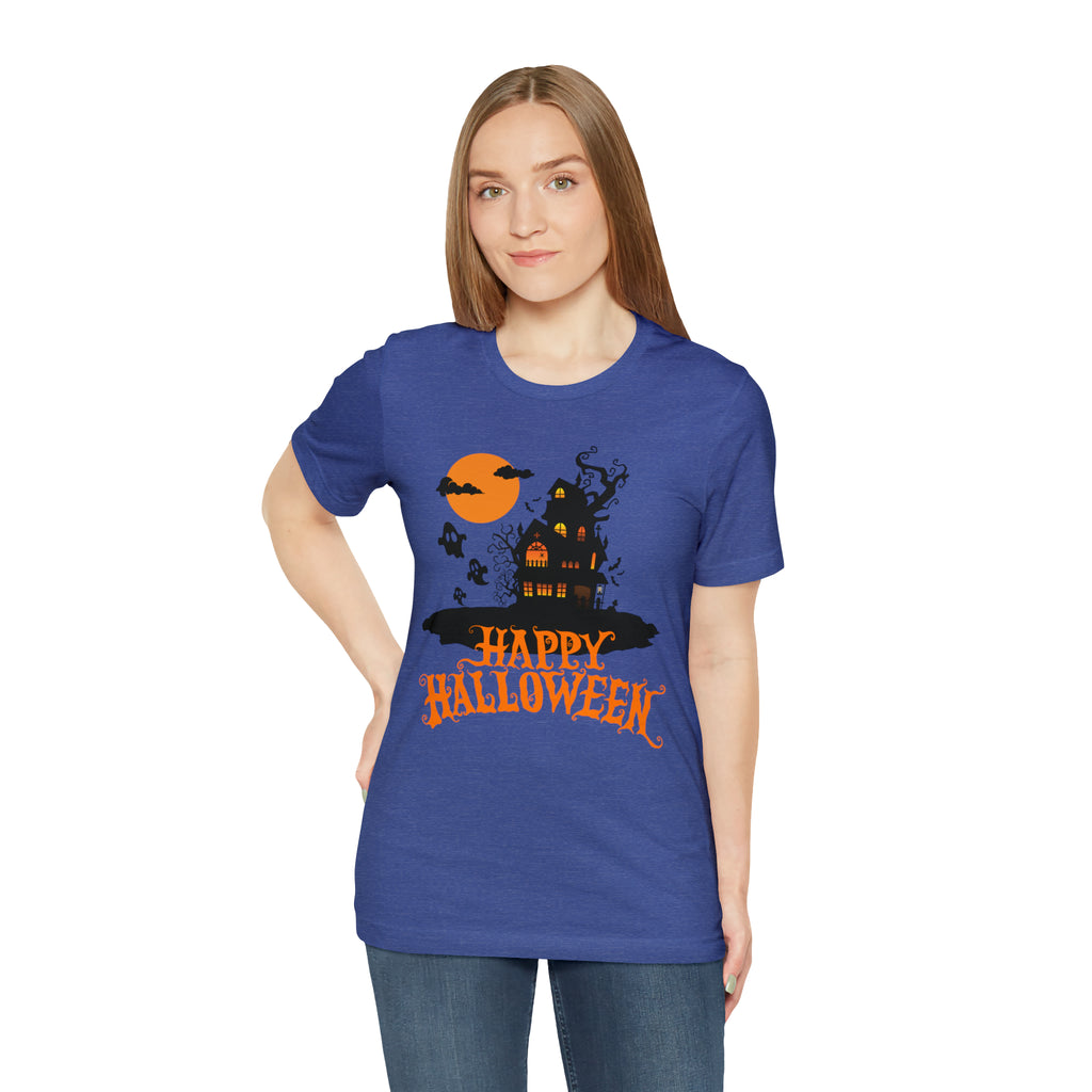 Happy Halloween Haunted House with Bats T-Shirt | Orange and Black Scary Tee | Bella Canvas 3001Unisex | Creepy Short Sleeve Tshirt
