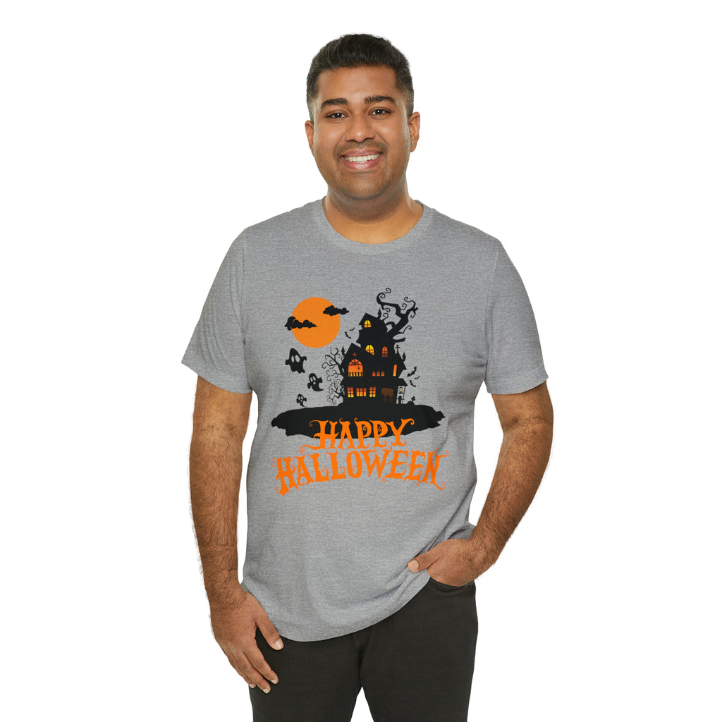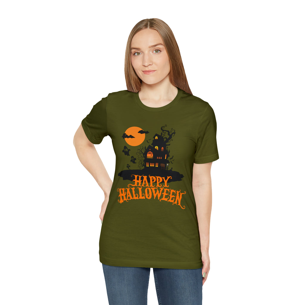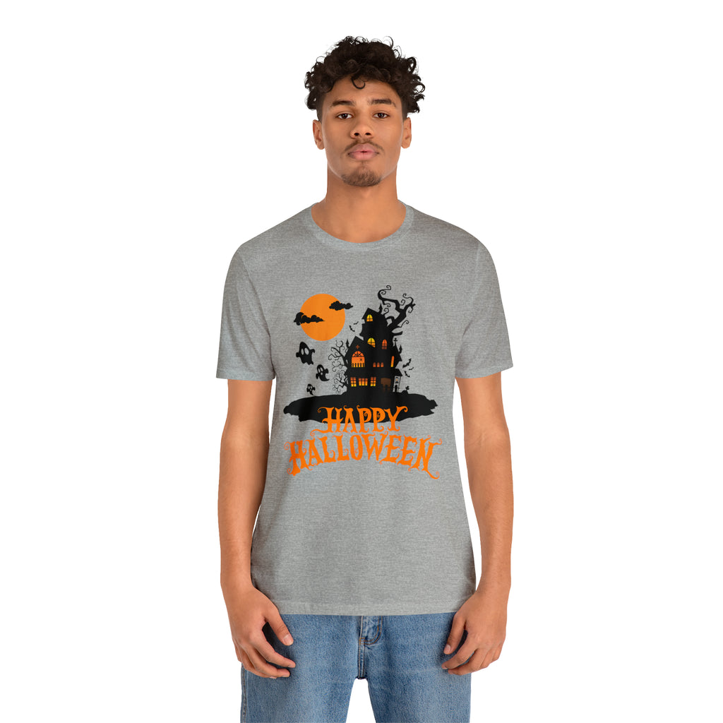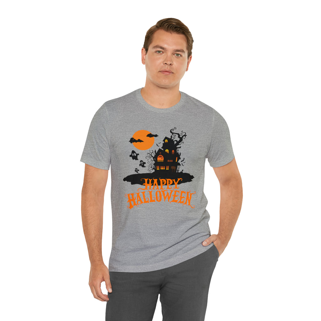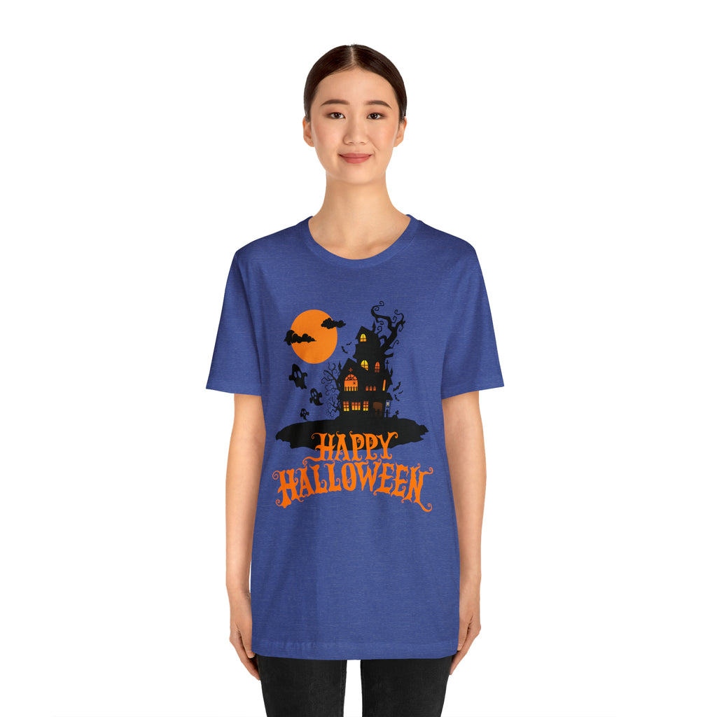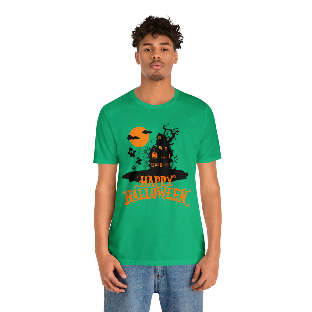 Happy Halloween Haunted House with Bats T-Shirt | Orange and Black Scary Tee | Bella Canvas 3001Unisex | Creepy Short Sleeve Tshirt