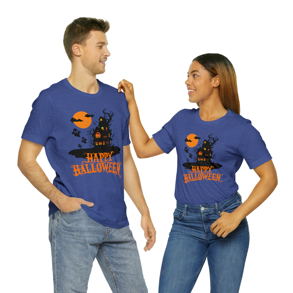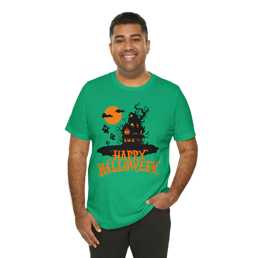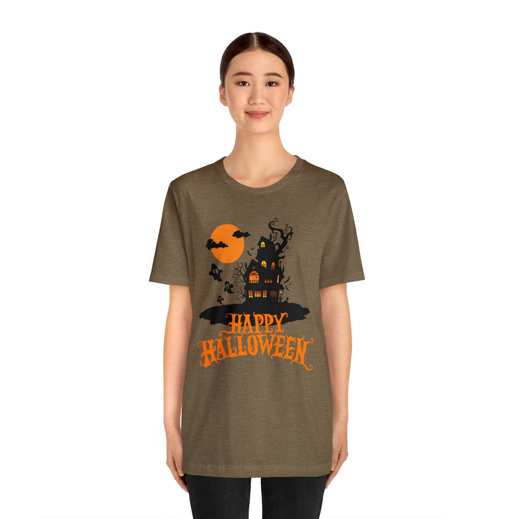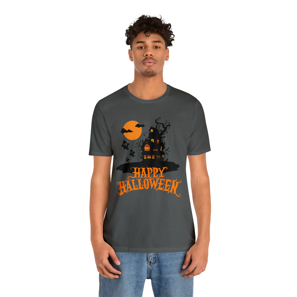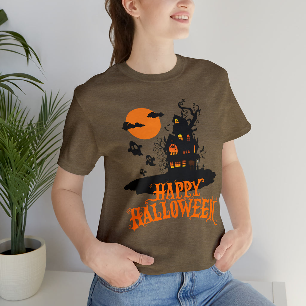 Happy Halloween Haunted House with Bats T-Shirt | Orange and Black Scary Tee | Bella Canvas 3001Unisex | Creepy Short Sleeve Tshirt