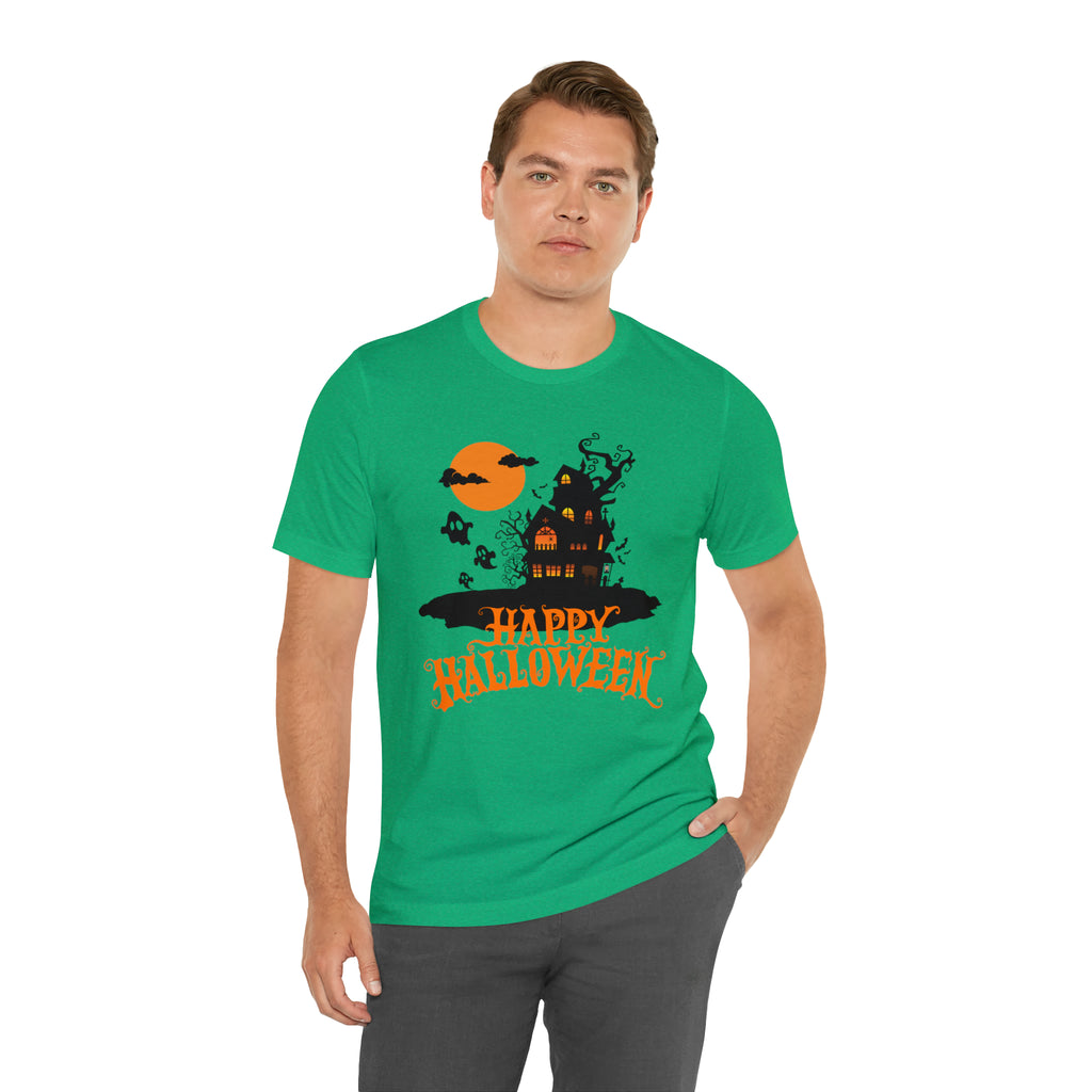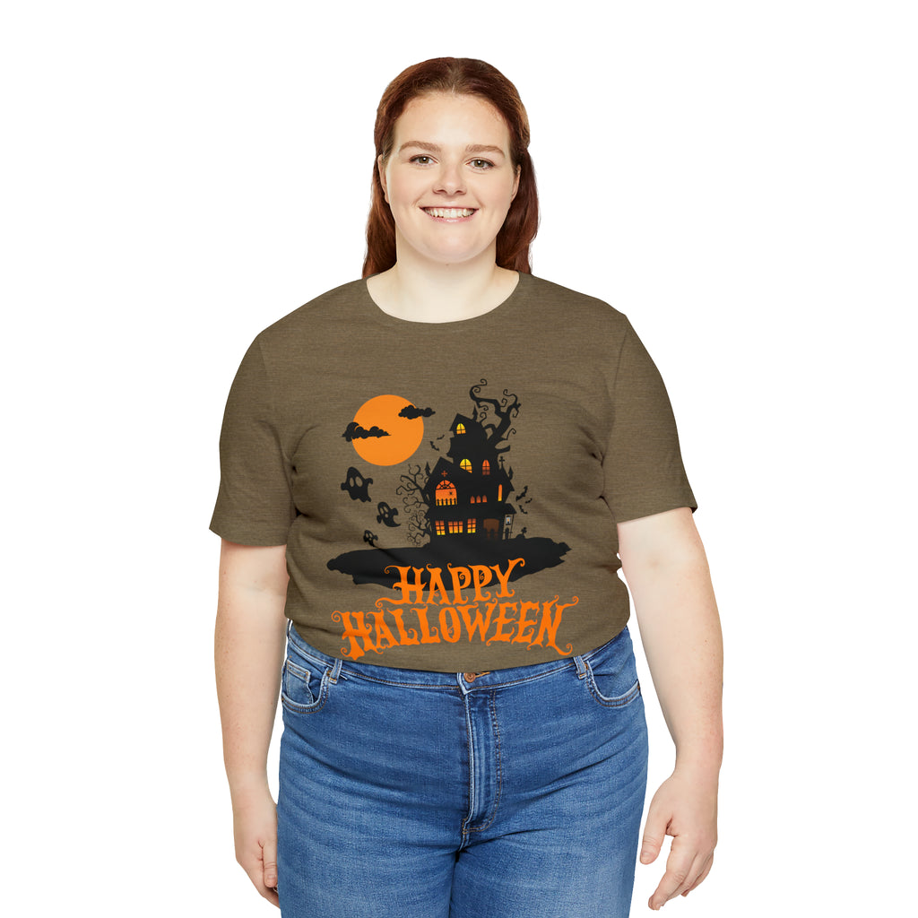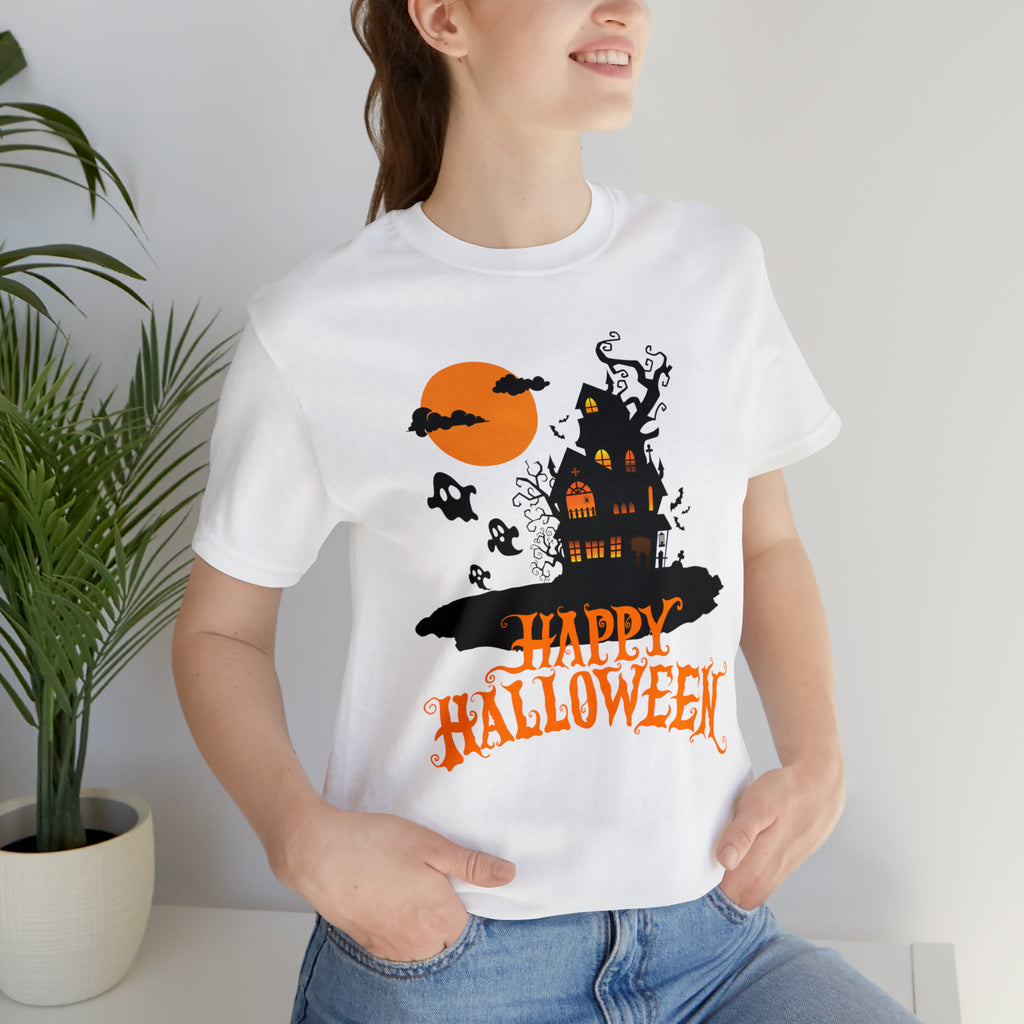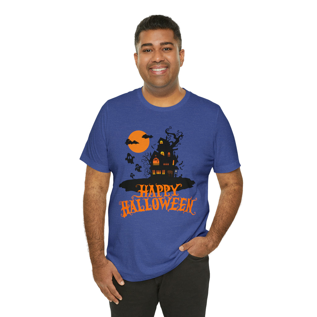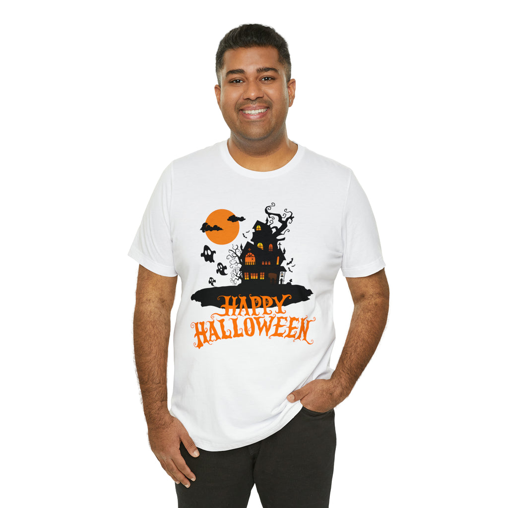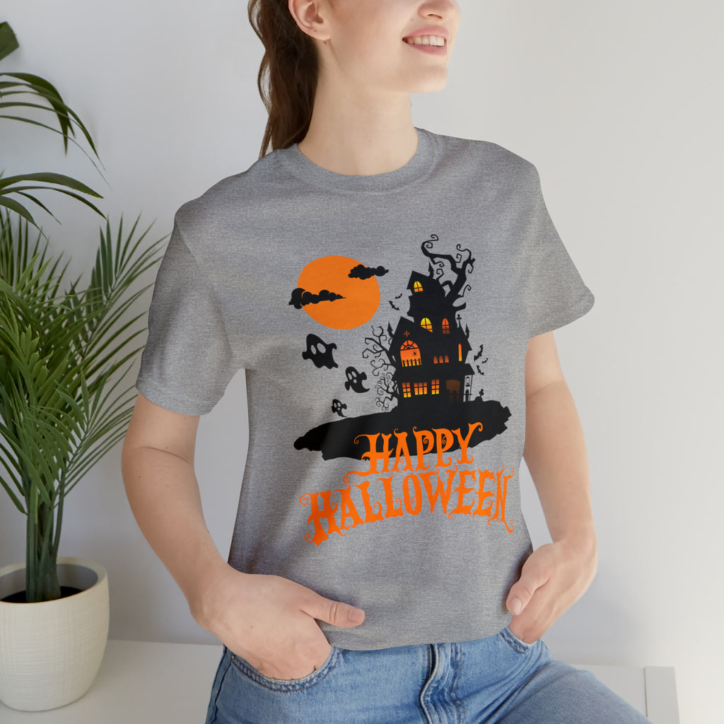 Happy Halloween Haunted House with Bats T-Shirt | Orange and Black Scary Tee | Bella Canvas 3001Unisex | Creepy Short Sleeve Tshirt