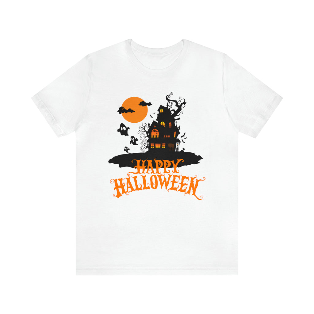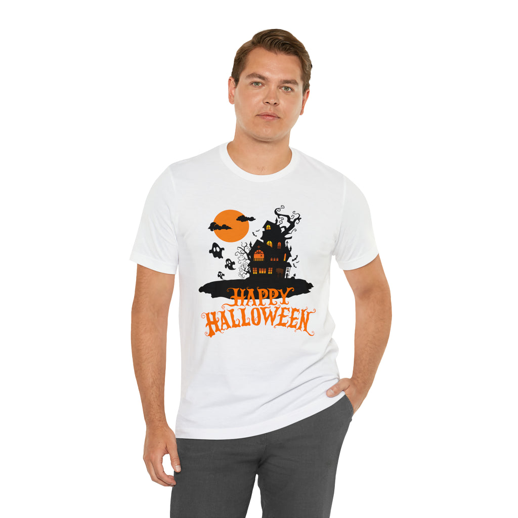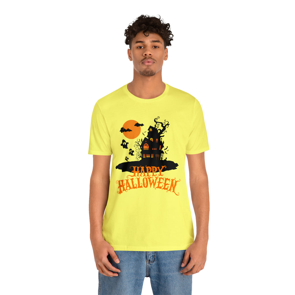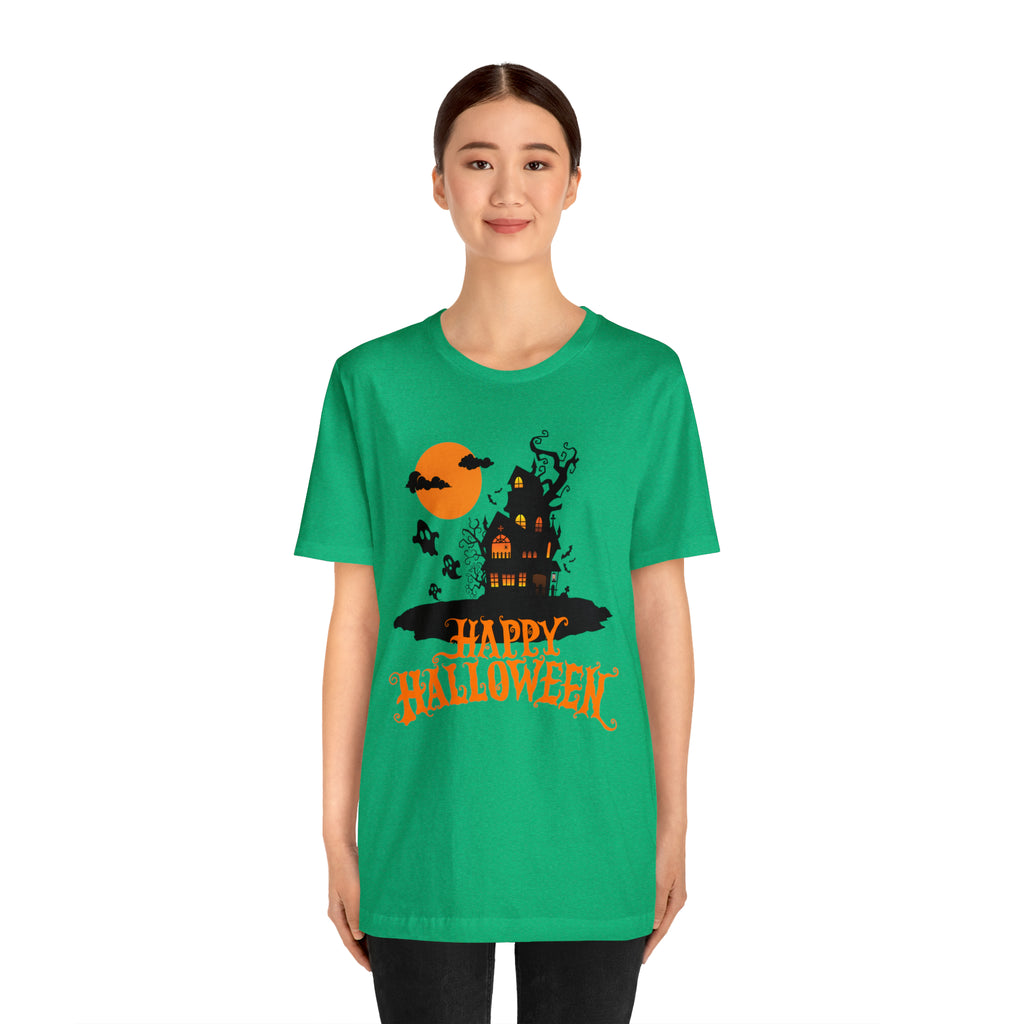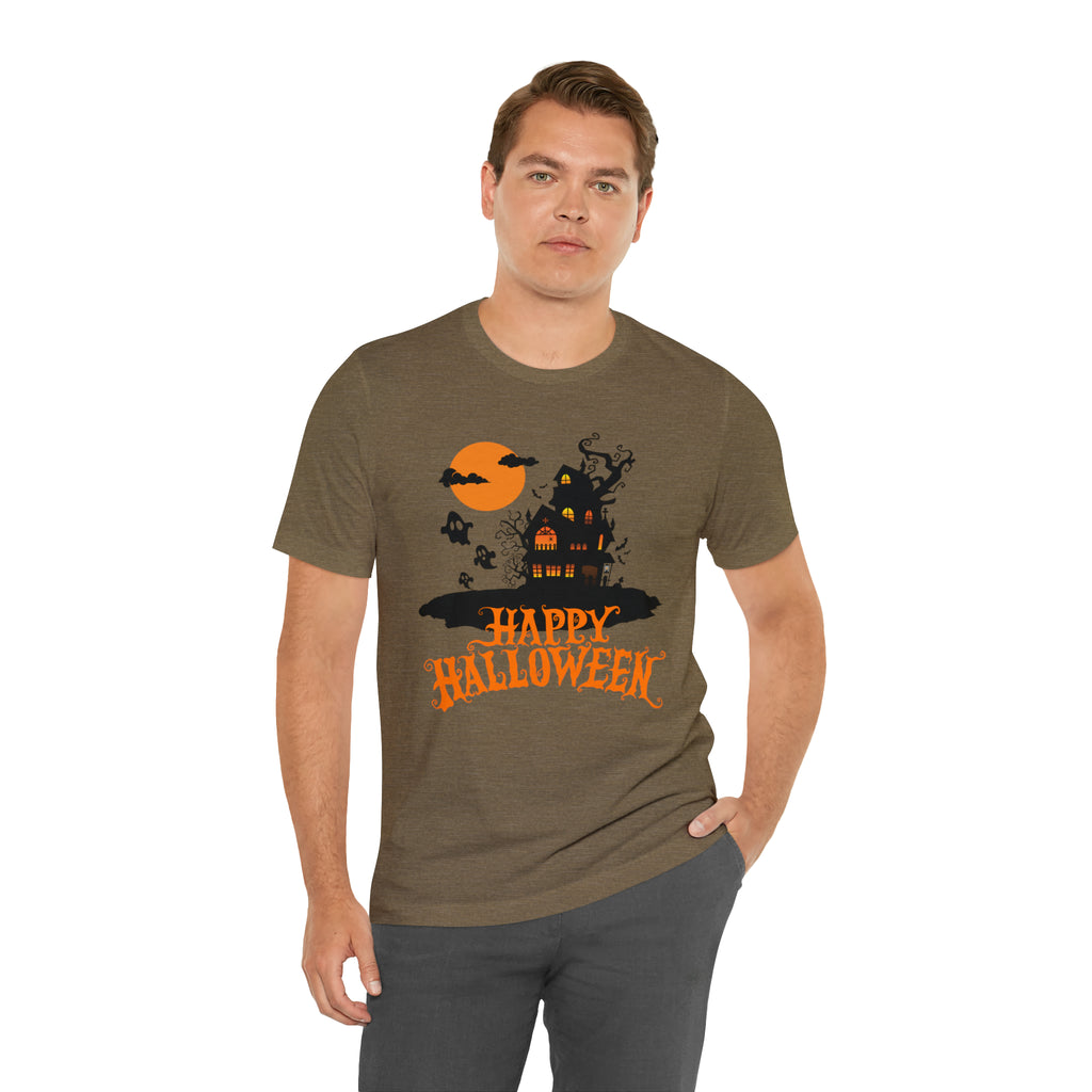 Happy Halloween Haunted House with Bats T-Shirt | Orange and Black Scary Tee | Bella Canvas 3001Unisex | Creepy Short Sleeve Tshirt