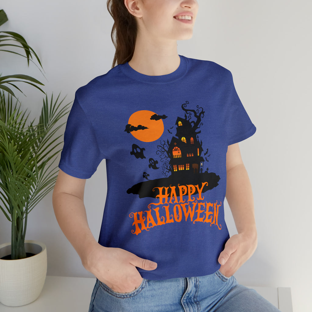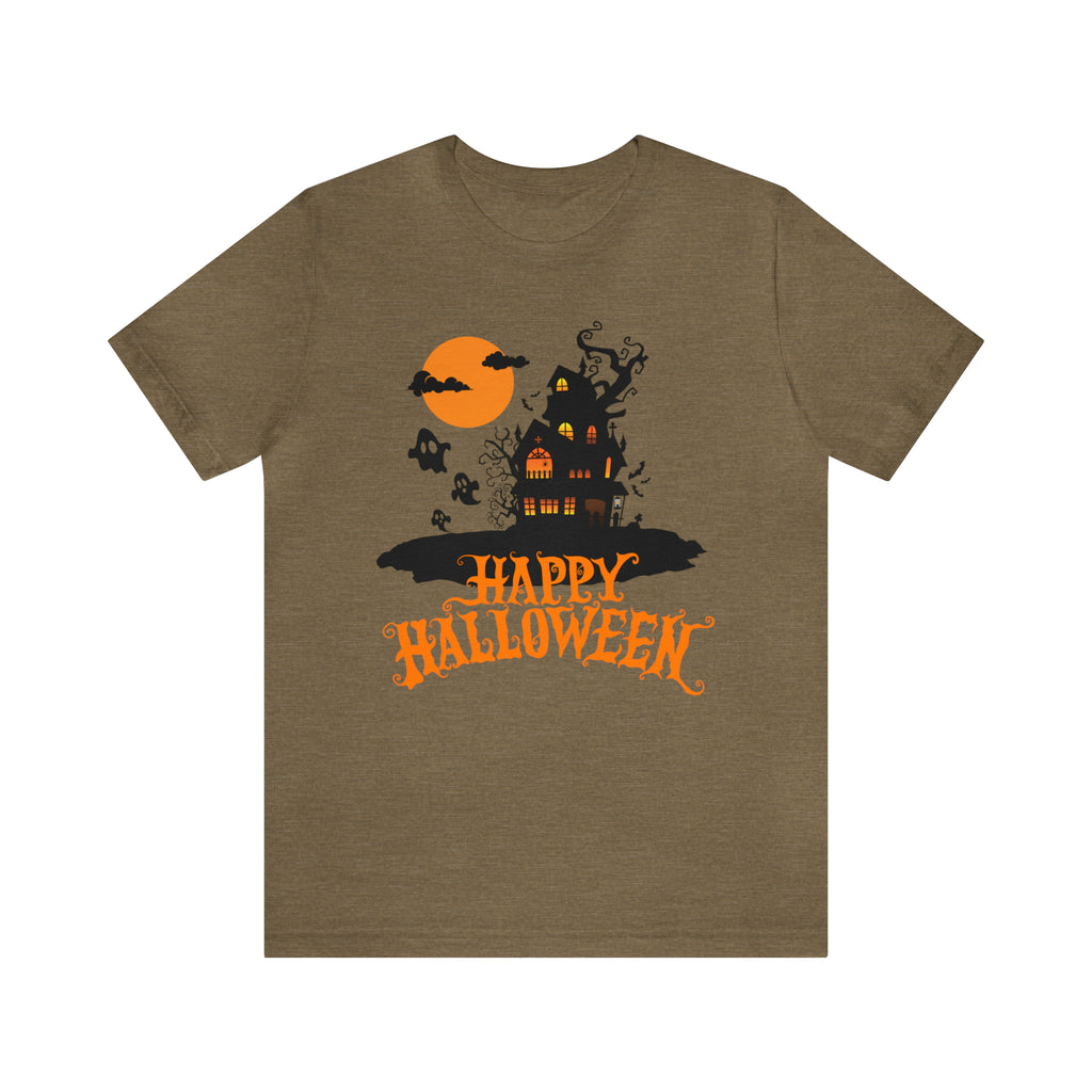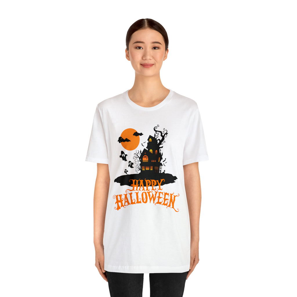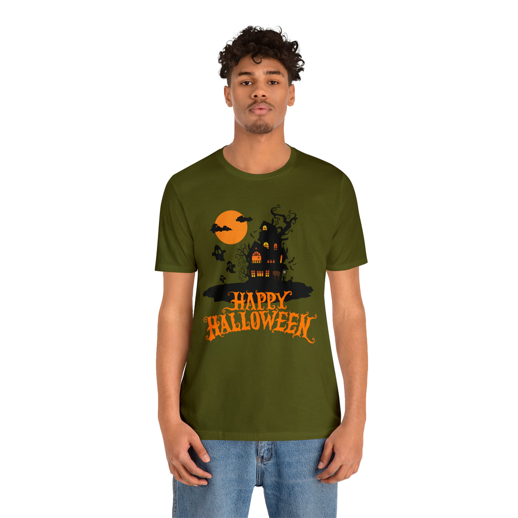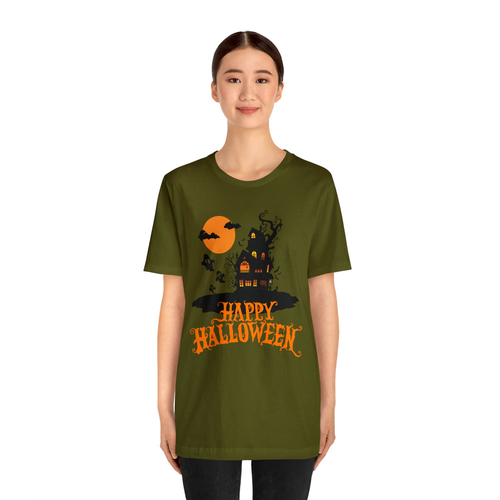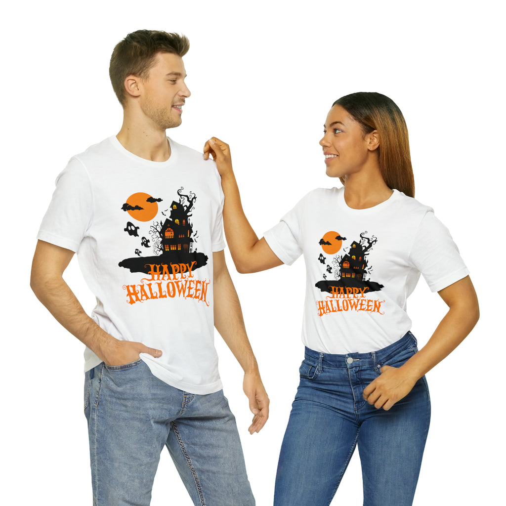 Happy Halloween Haunted House with Bats T-Shirt | Orange and Black Scary Tee | Bella Canvas 3001Unisex | Creepy Short Sleeve Tshirt