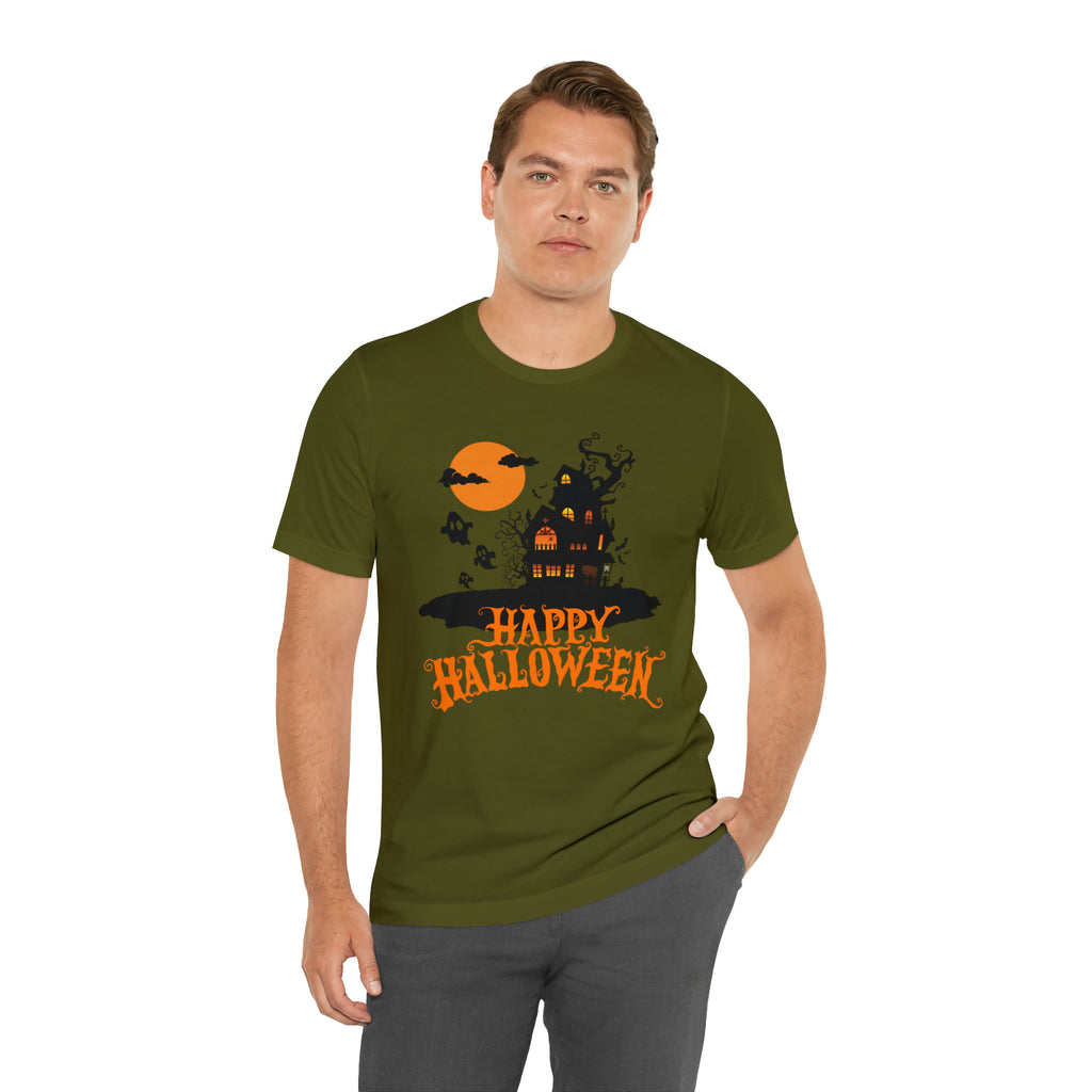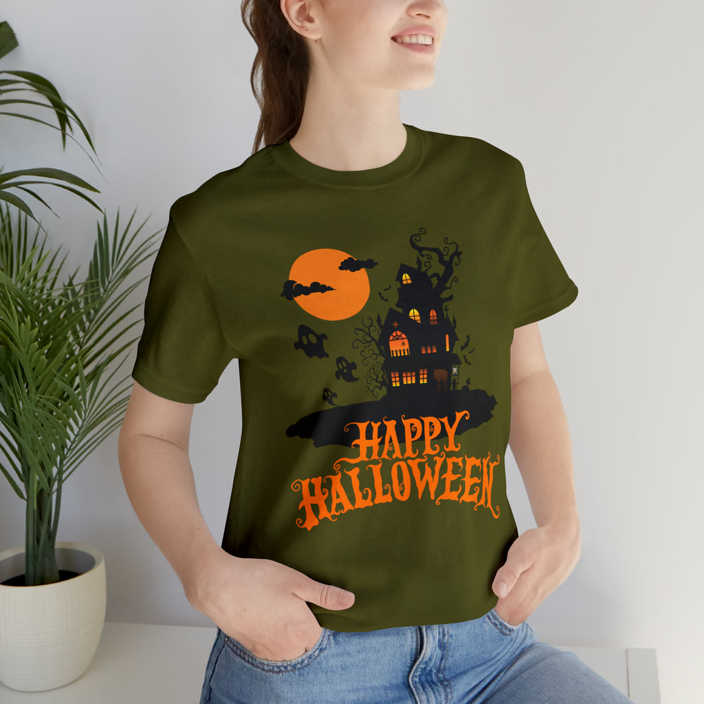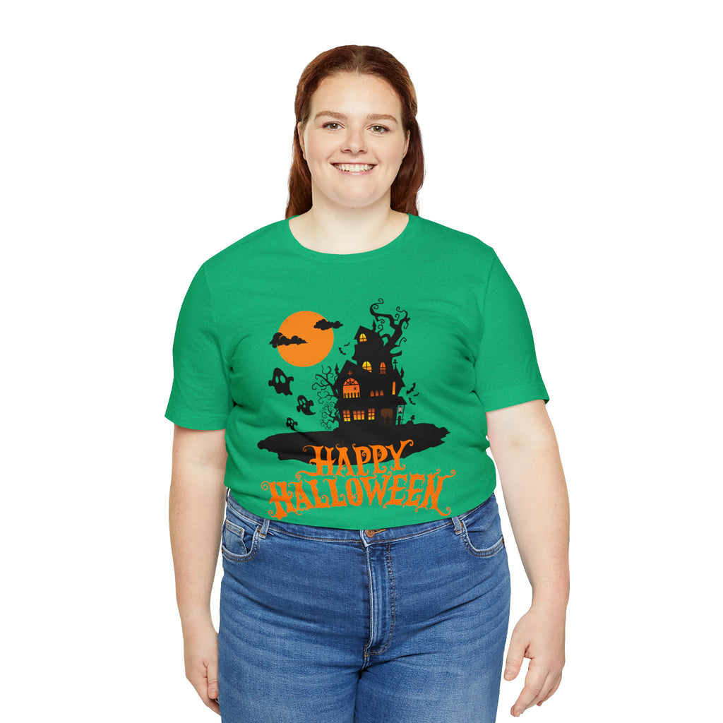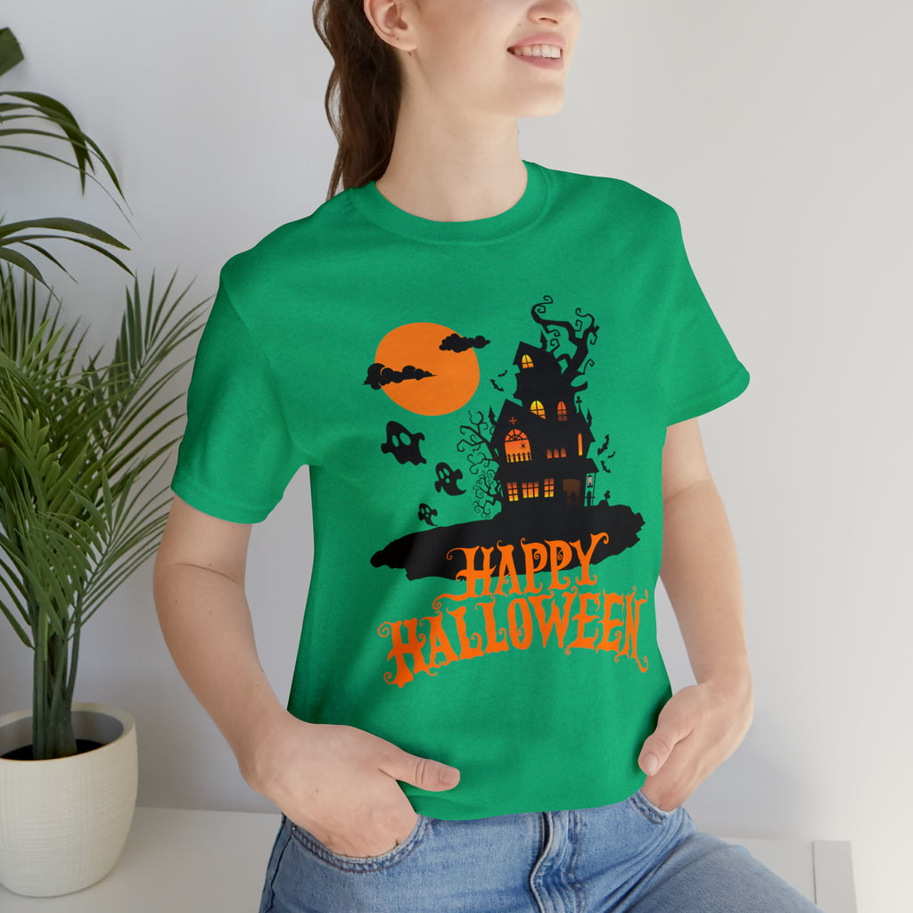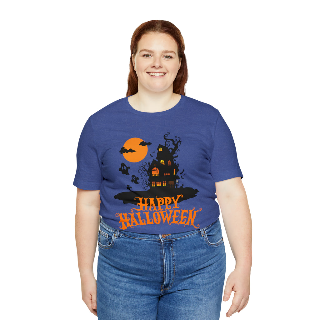 Happy Halloween Haunted House with Bats T-Shirt | Orange and Black Scary Tee | Bella Canvas 3001Unisex | Creepy Short Sleeve Tshirt