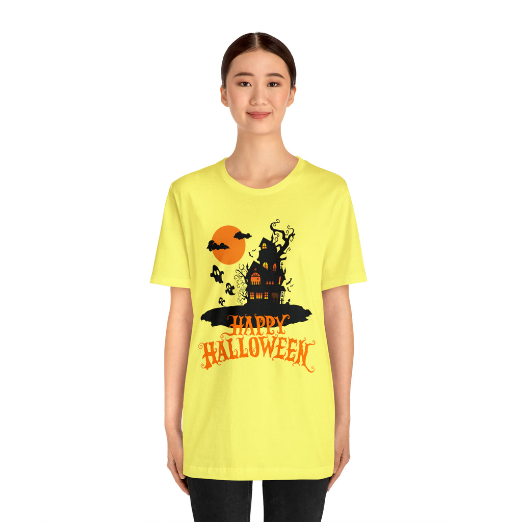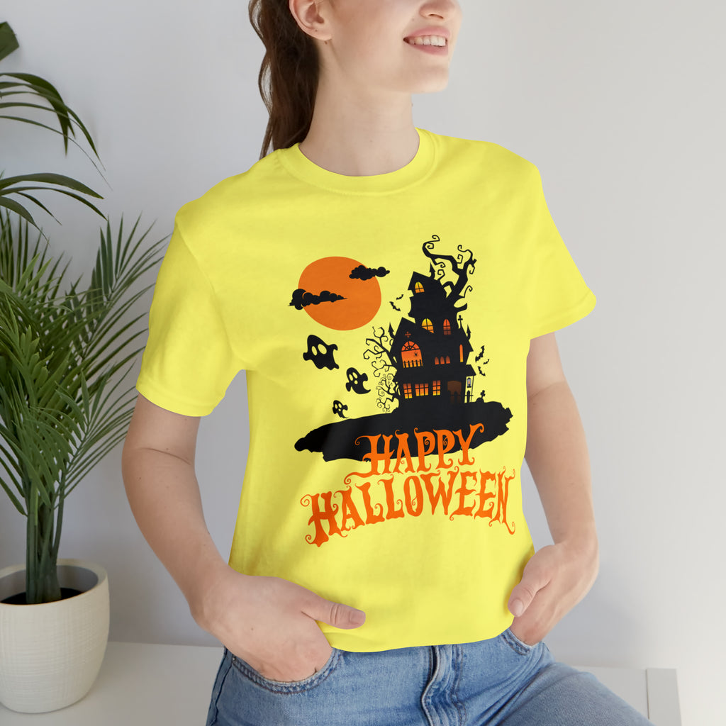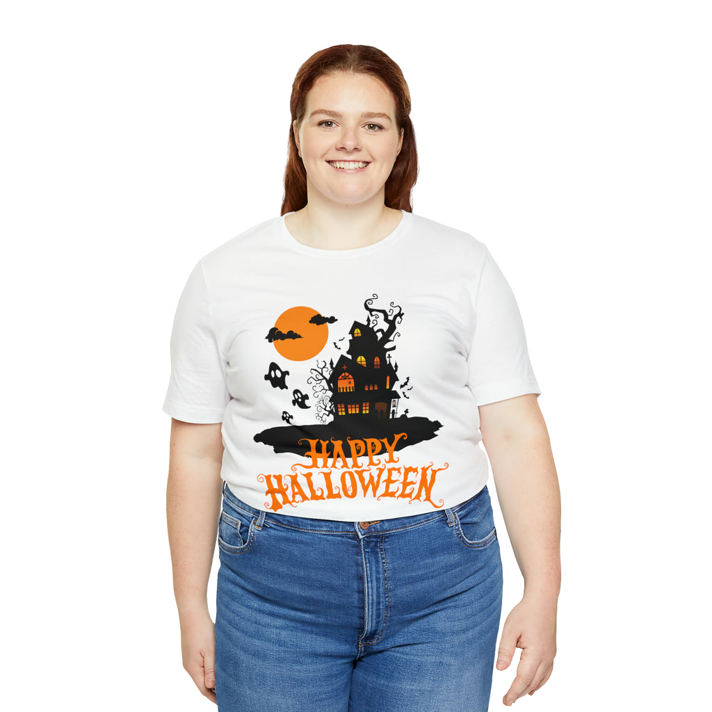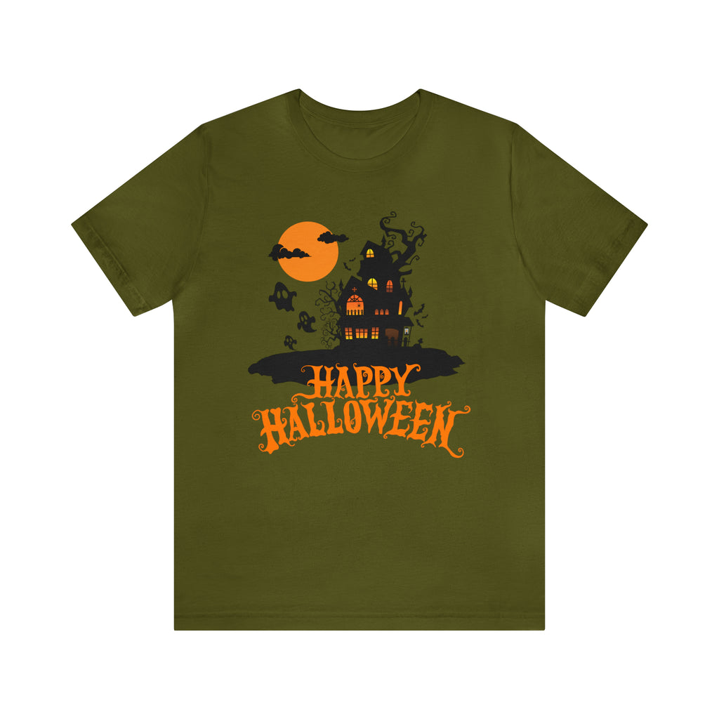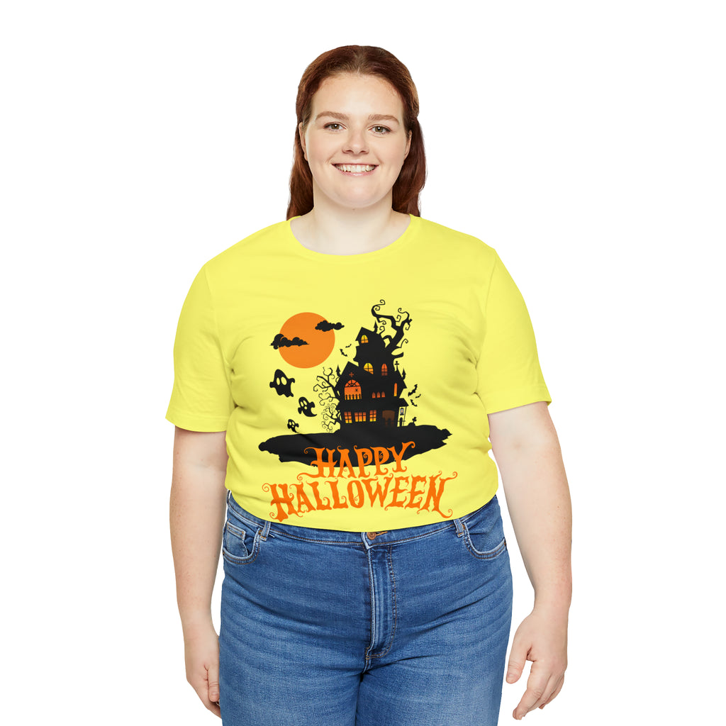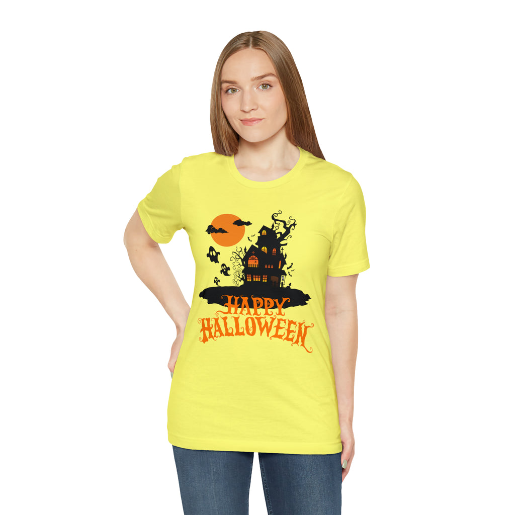 Happy Halloween Haunted House with Bats T-Shirt | Orange and Black Scary Tee | Bella Canvas 3001Unisex | Creepy Short Sleeve Tshirt