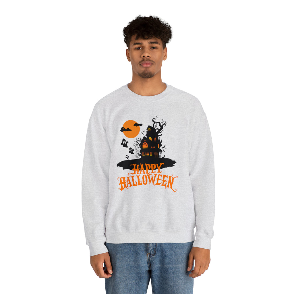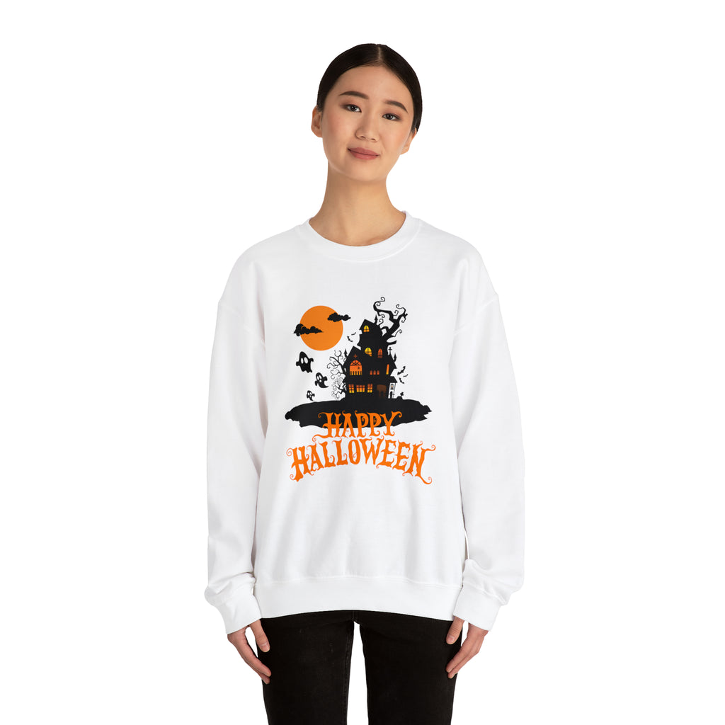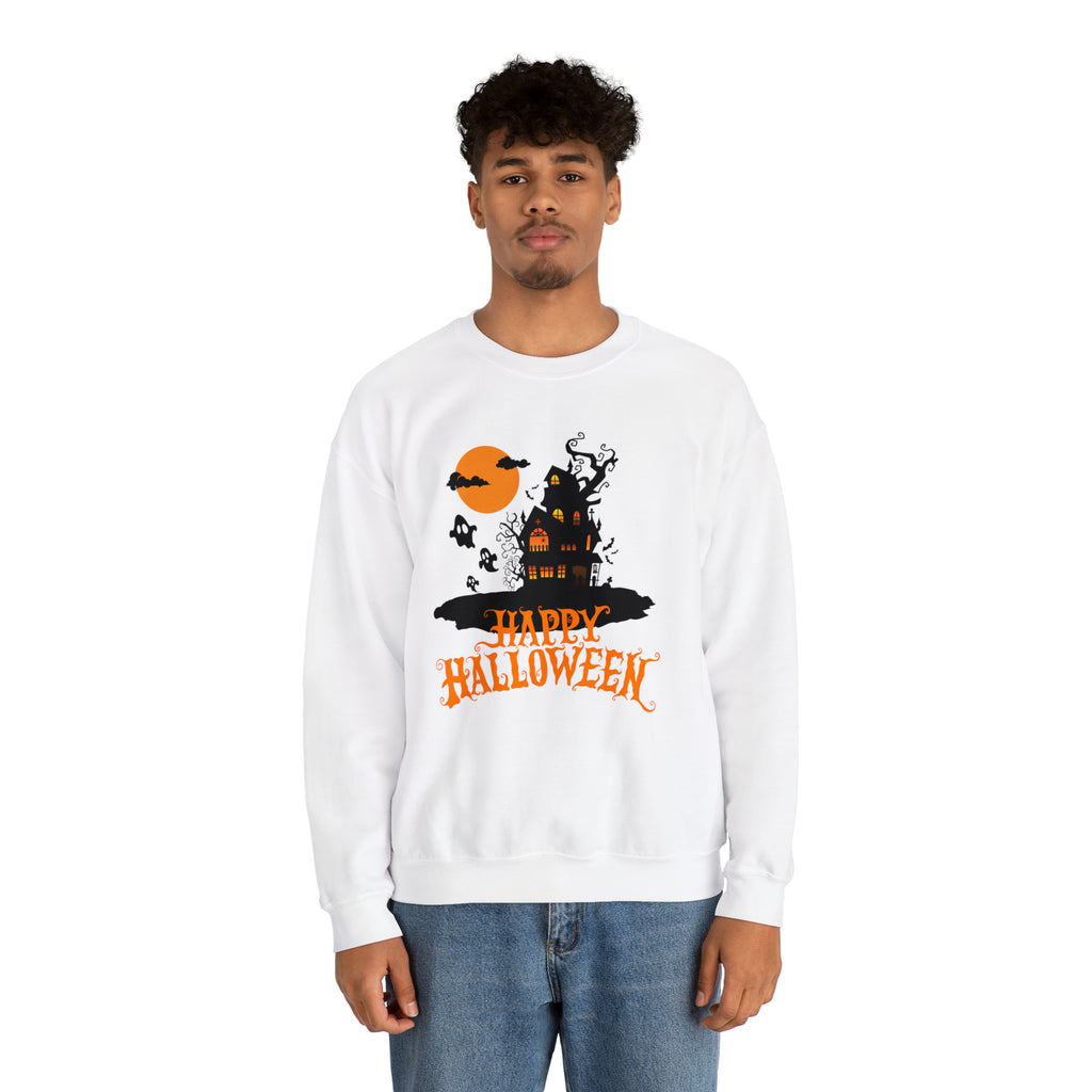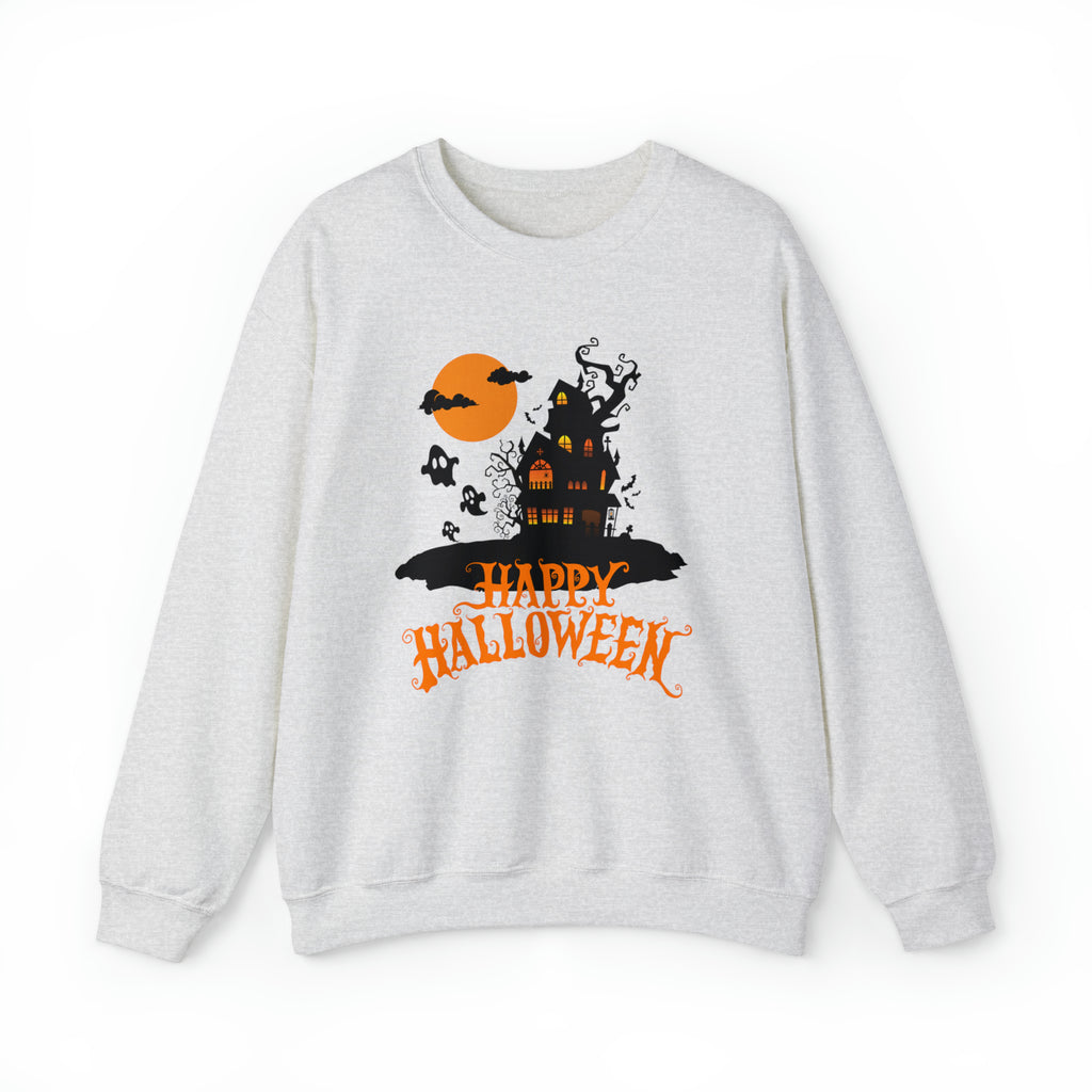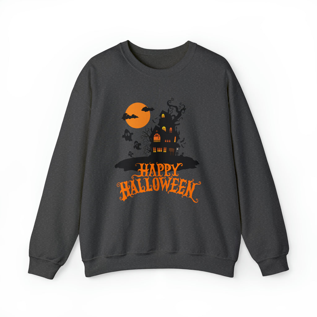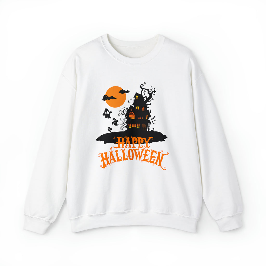 Happy Halloween Scary House Sweatshirt, Haunted Ghost Pullover, Creepy Halloween Crewneck Sweatshirt, Unisex Heavy Blend Sweatshirt