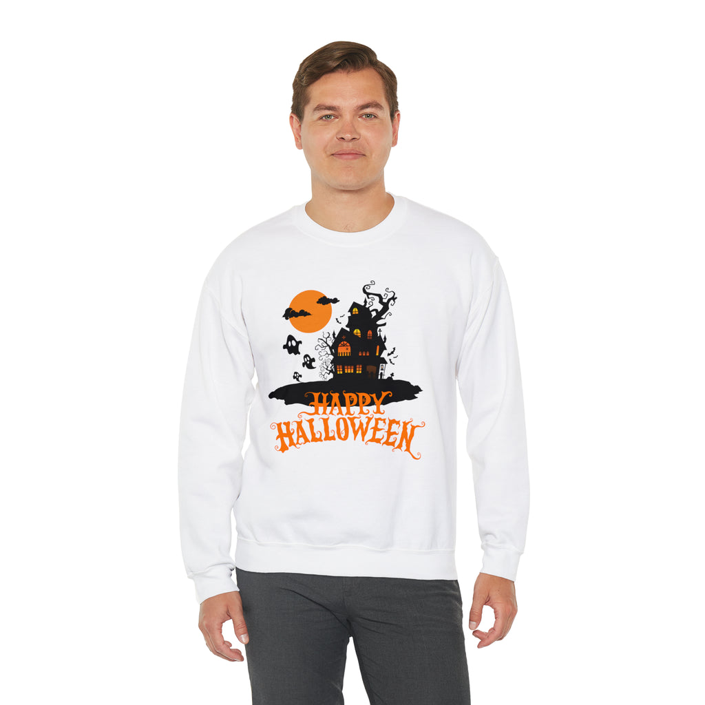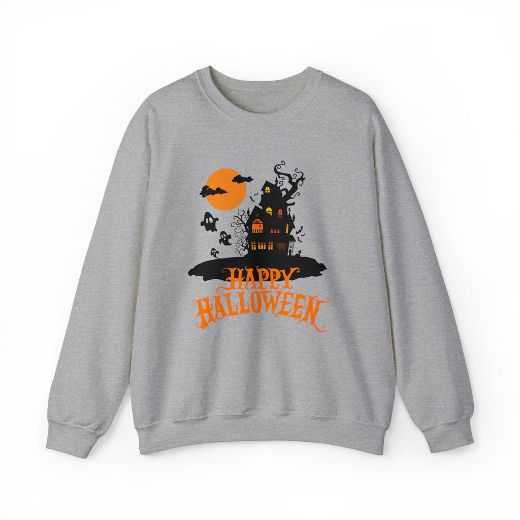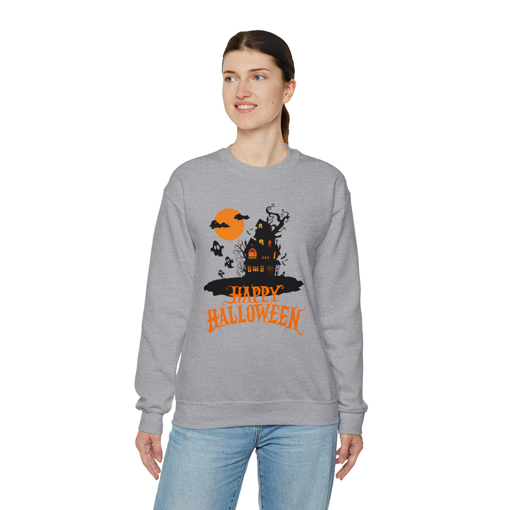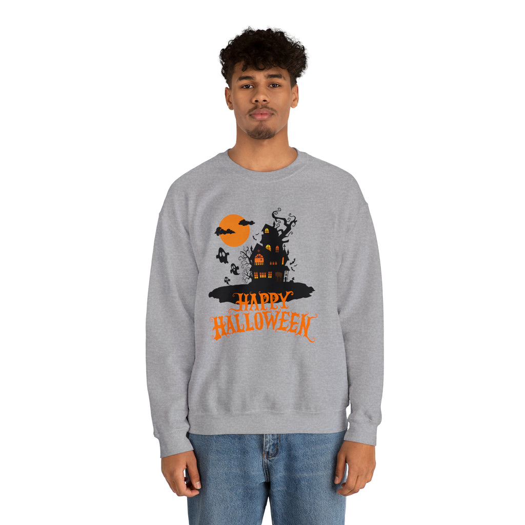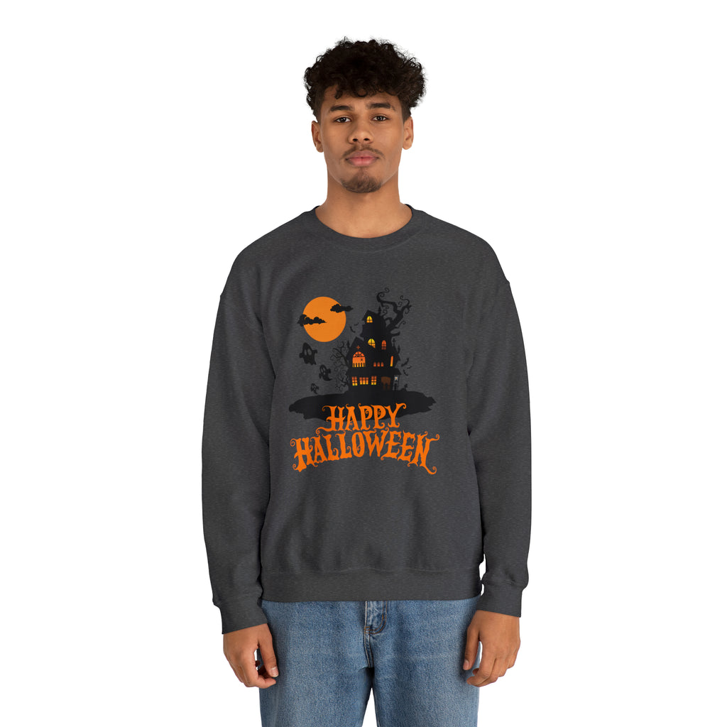 Happy Halloween Scary House Sweatshirt, Haunted Ghost Pullover, Creepy Halloween Crewneck Sweatshirt, Unisex Heavy Blend Sweatshirt
