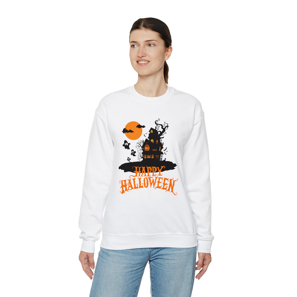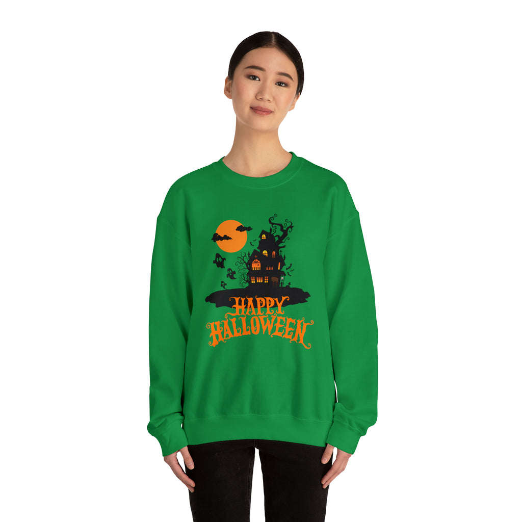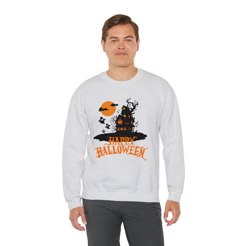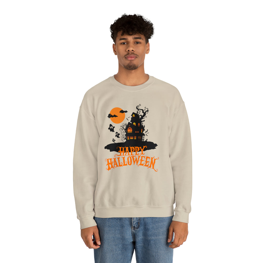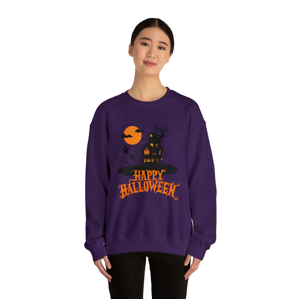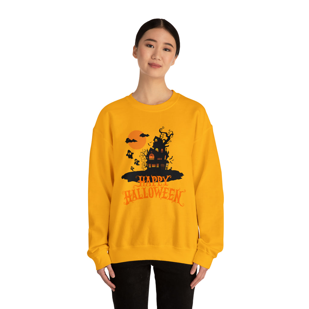 Happy Halloween Scary House Sweatshirt, Haunted Ghost Pullover, Creepy Halloween Crewneck Sweatshirt, Unisex Heavy Blend Sweatshirt