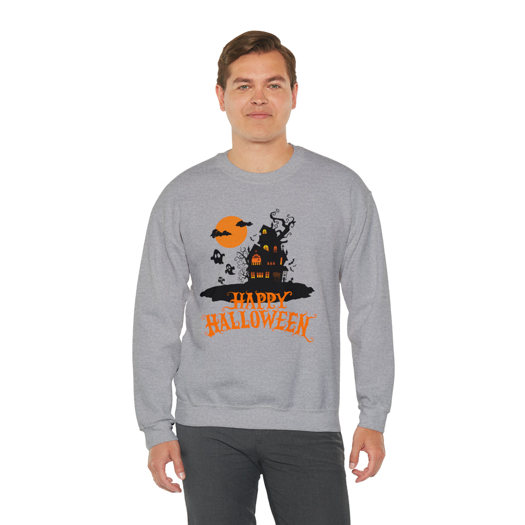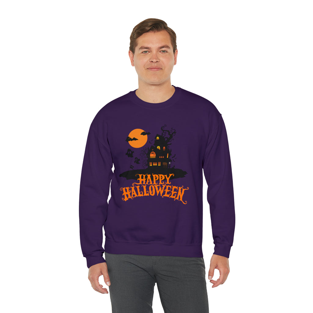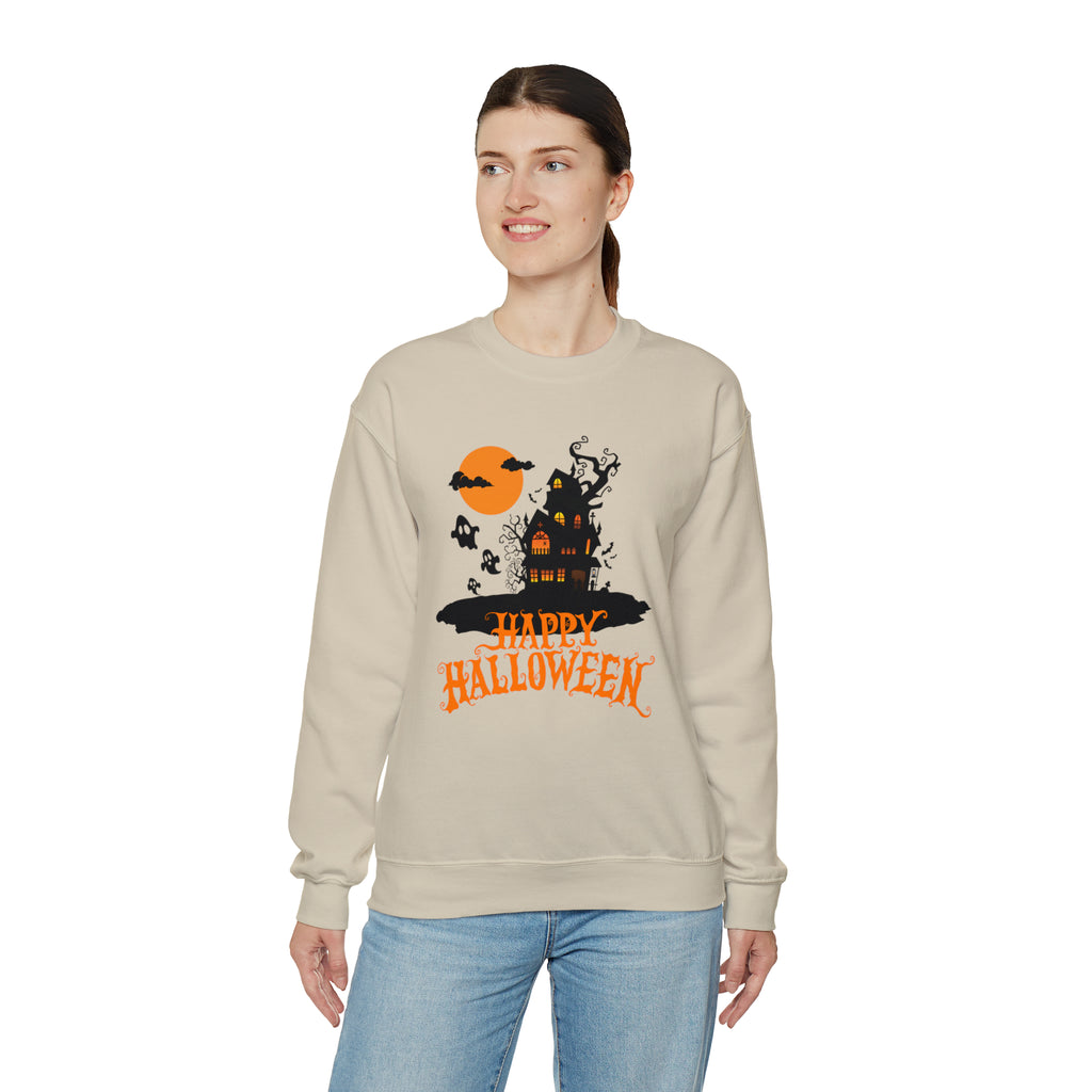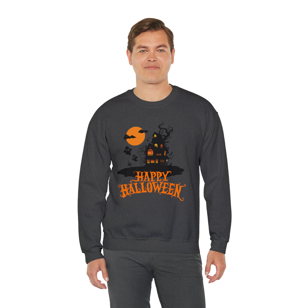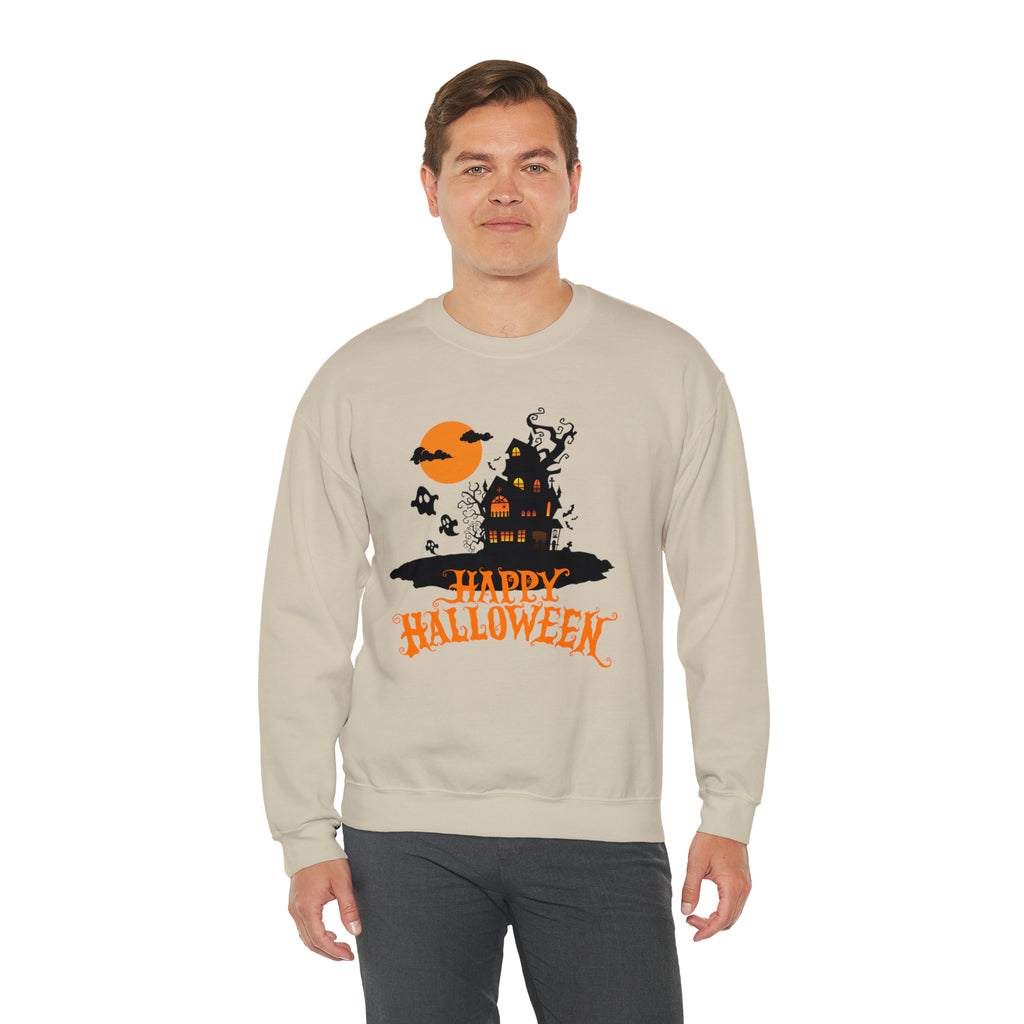Happy Halloween Scary House Sweatshirt, Haunted Ghost Pullover, Creepy Halloween Crewneck Sweatshirt, Unisex Heavy Blend Sweatshirt