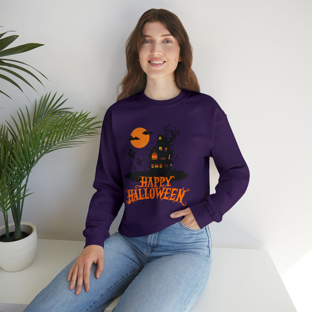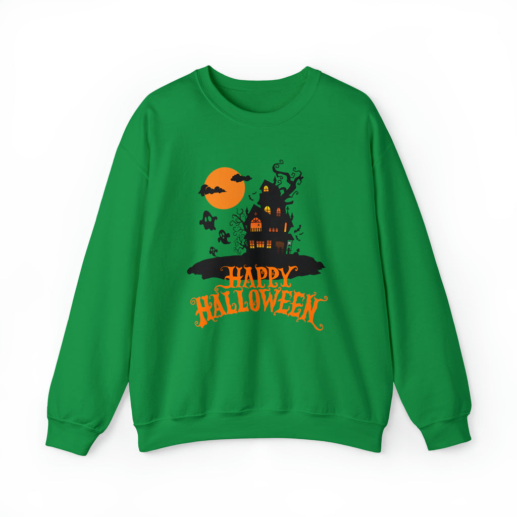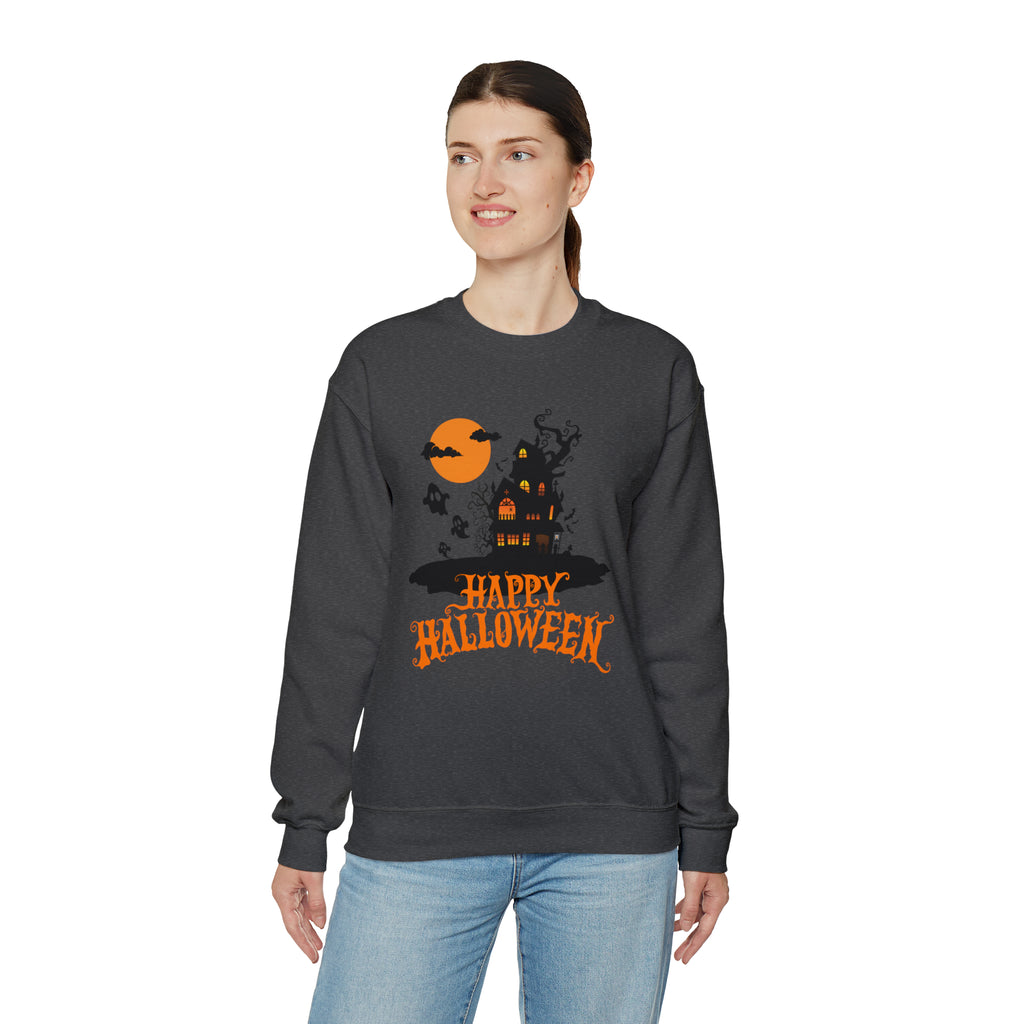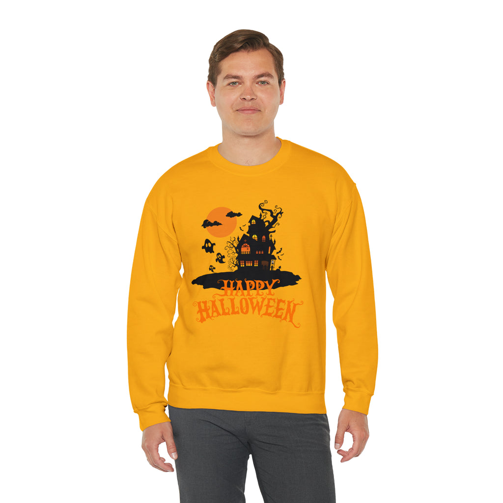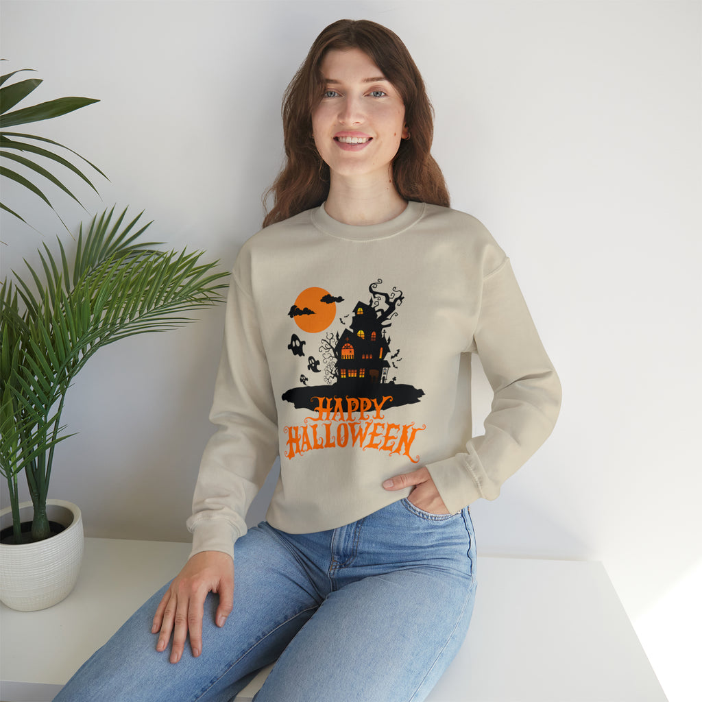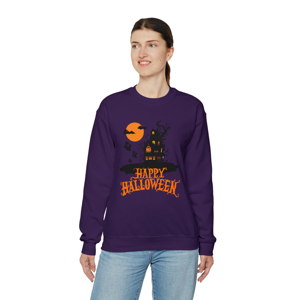 Happy Halloween Scary House Sweatshirt, Haunted Ghost Pullover, Creepy Halloween Crewneck Sweatshirt, Unisex Heavy Blend Sweatshirt