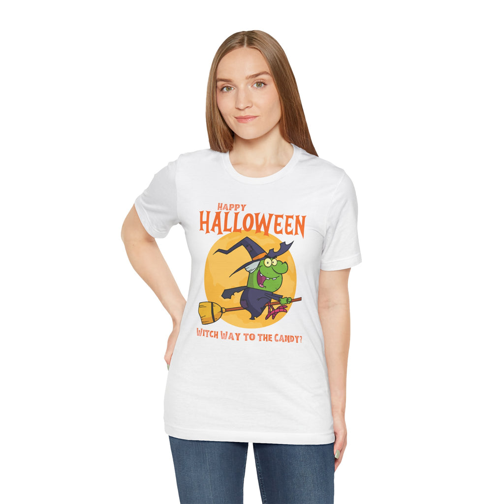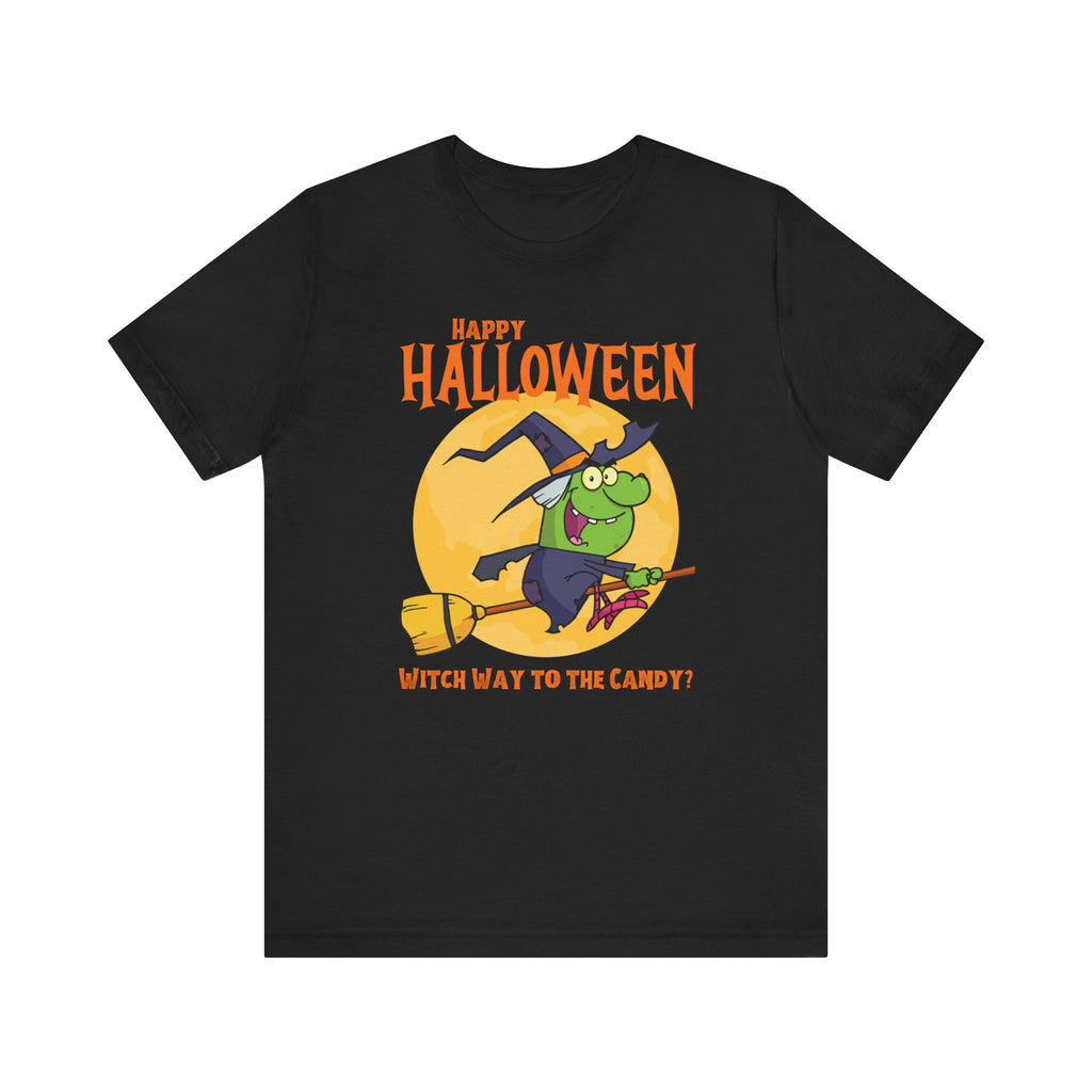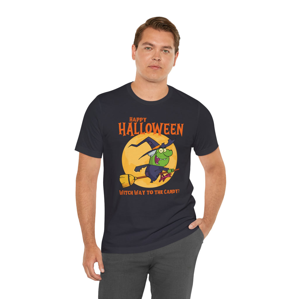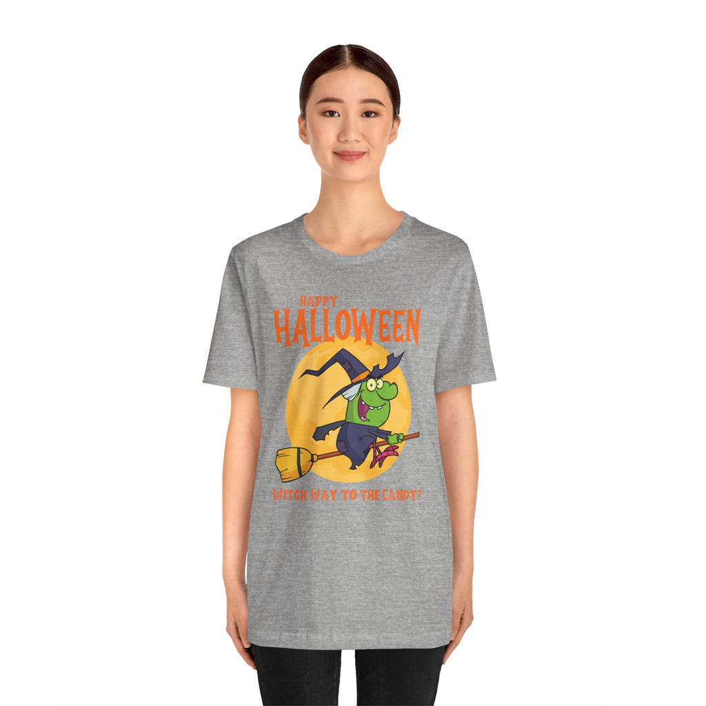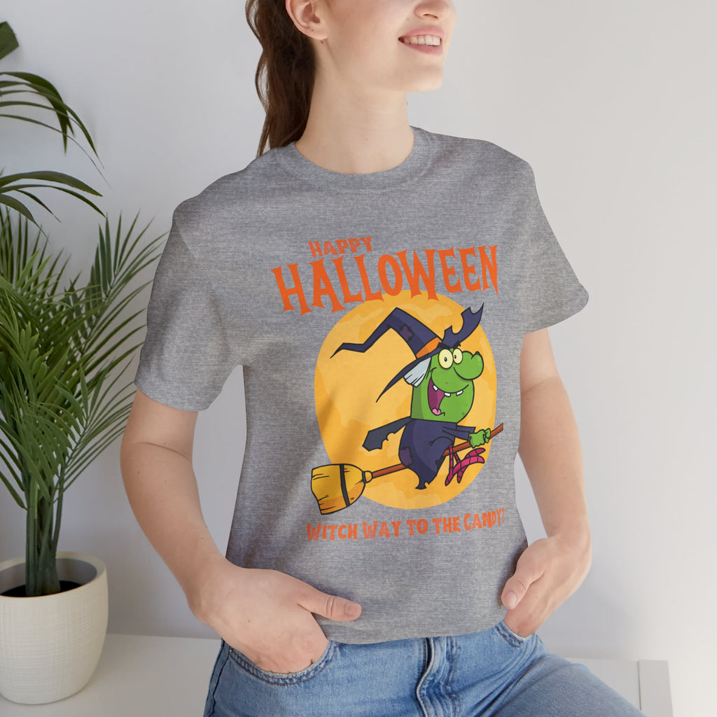 Happy Halloween Witch Way to the Candy T-Shirt | Flying Witch Front of the Moon Tee | Bella Canvas 3001Unisex | Funny Short Sleeve Tshirt