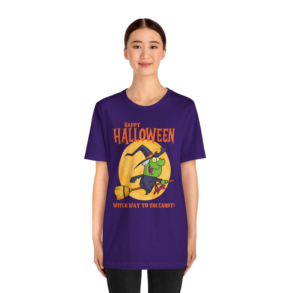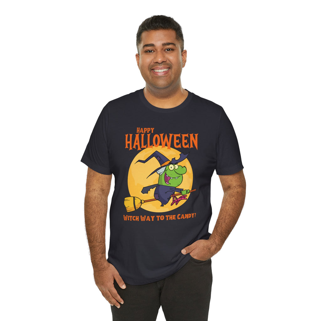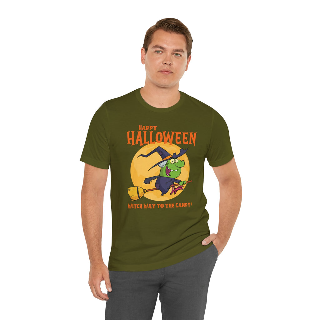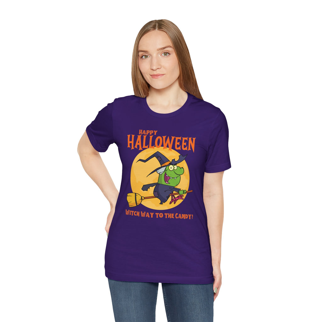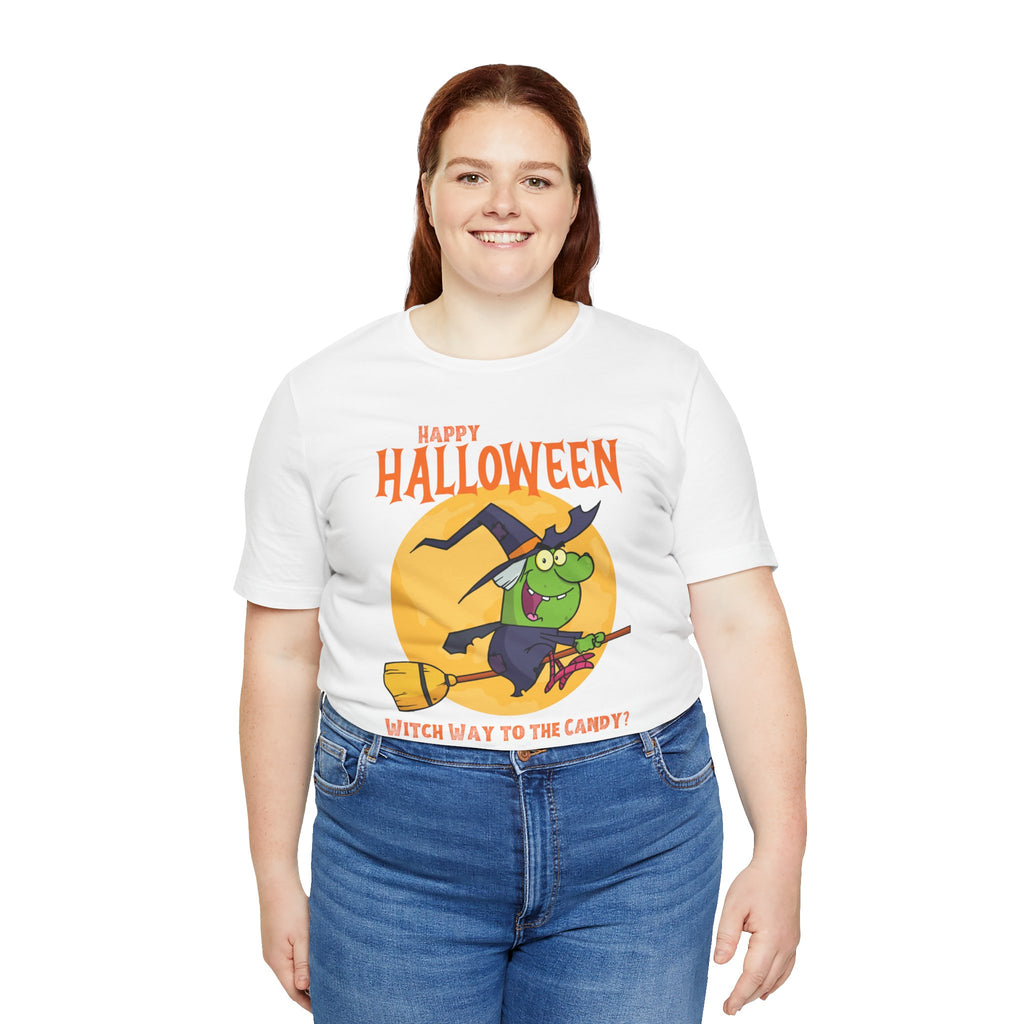 Happy Halloween Witch Way to the Candy T-Shirt | Flying Witch Front of the Moon Tee | Bella Canvas 3001Unisex | Funny Short Sleeve Tshirt