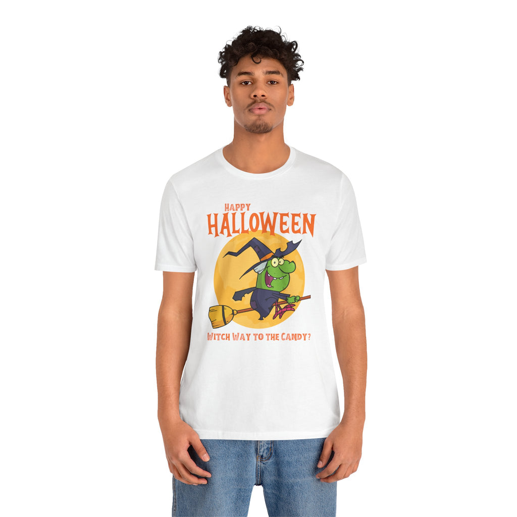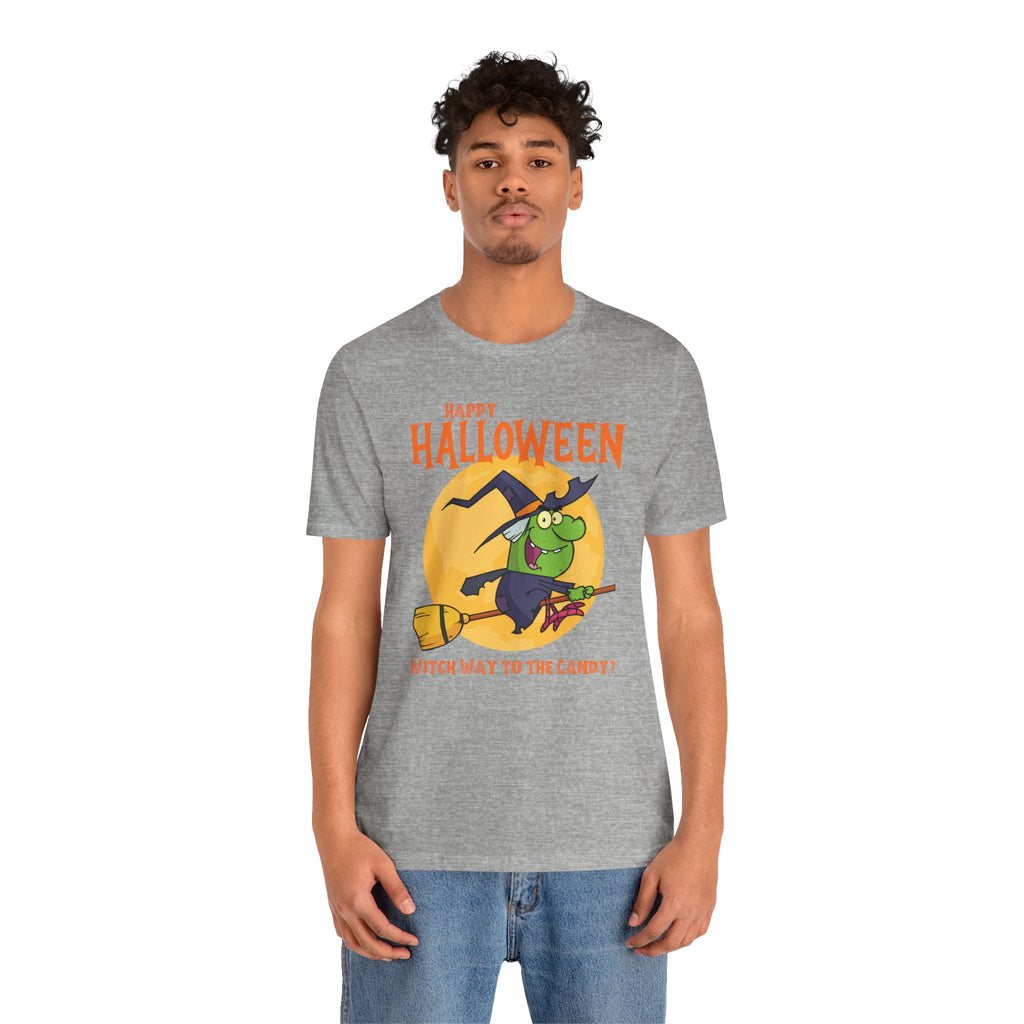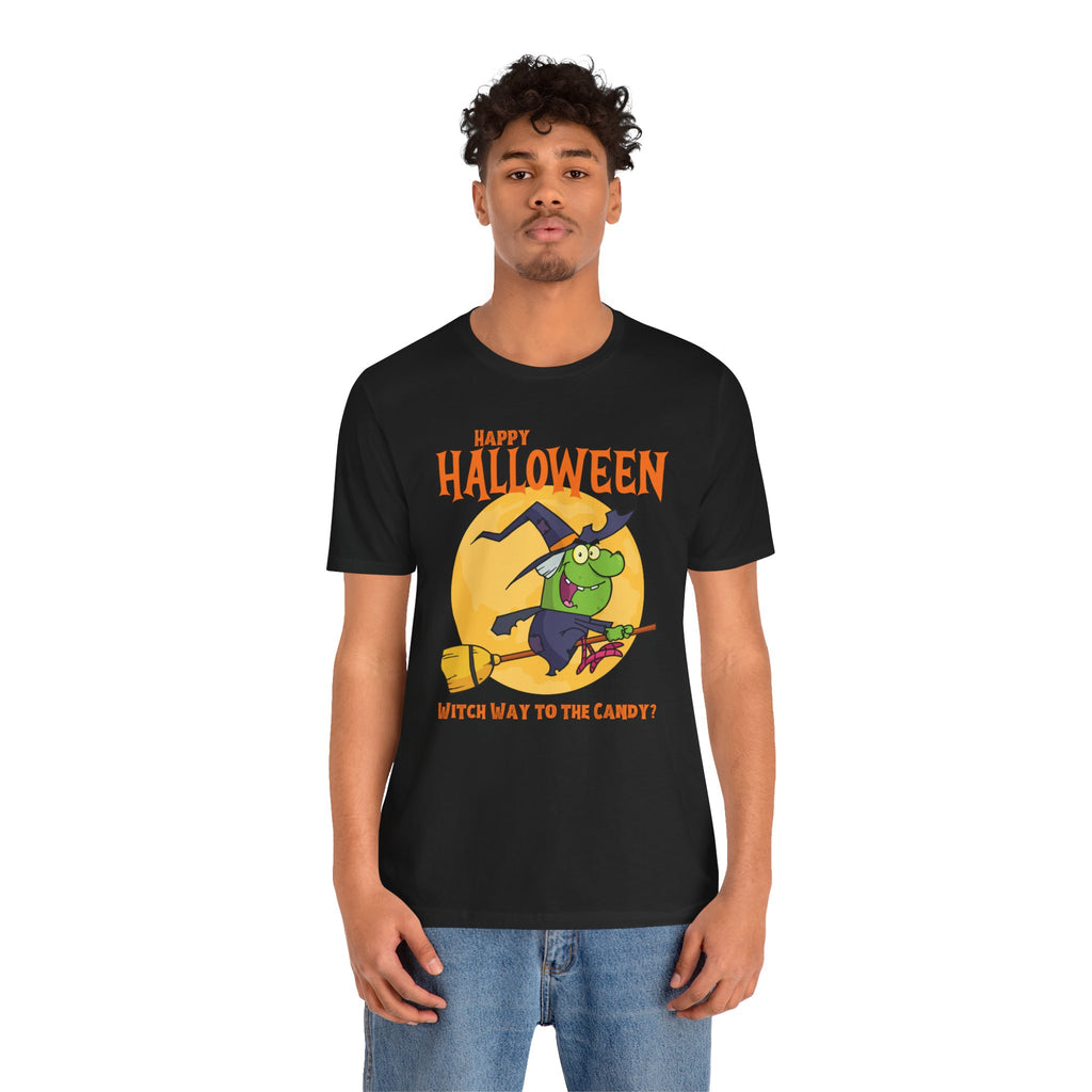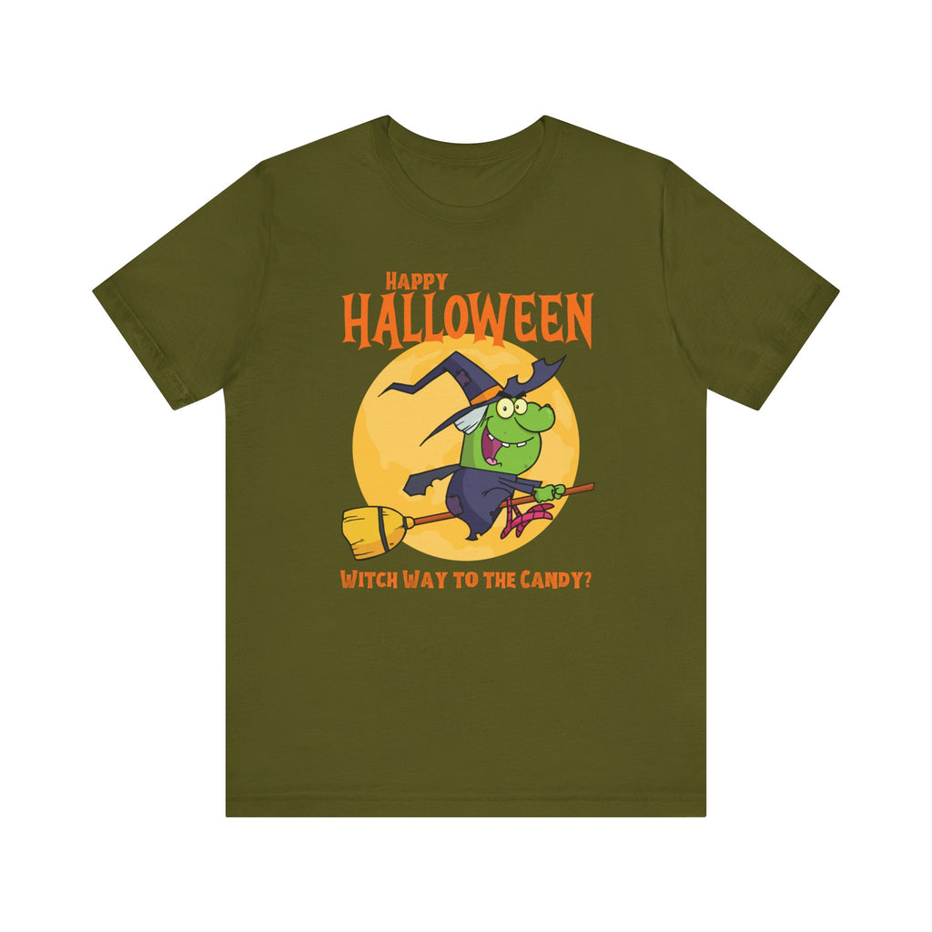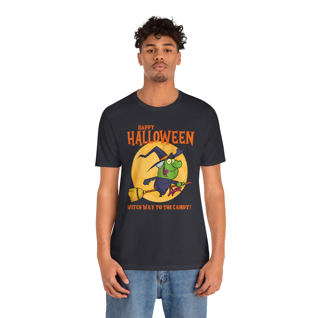 Happy Halloween Witch Way to the Candy T-Shirt | Flying Witch Front of the Moon Tee | Bella Canvas 3001Unisex | Funny Short Sleeve Tshirt