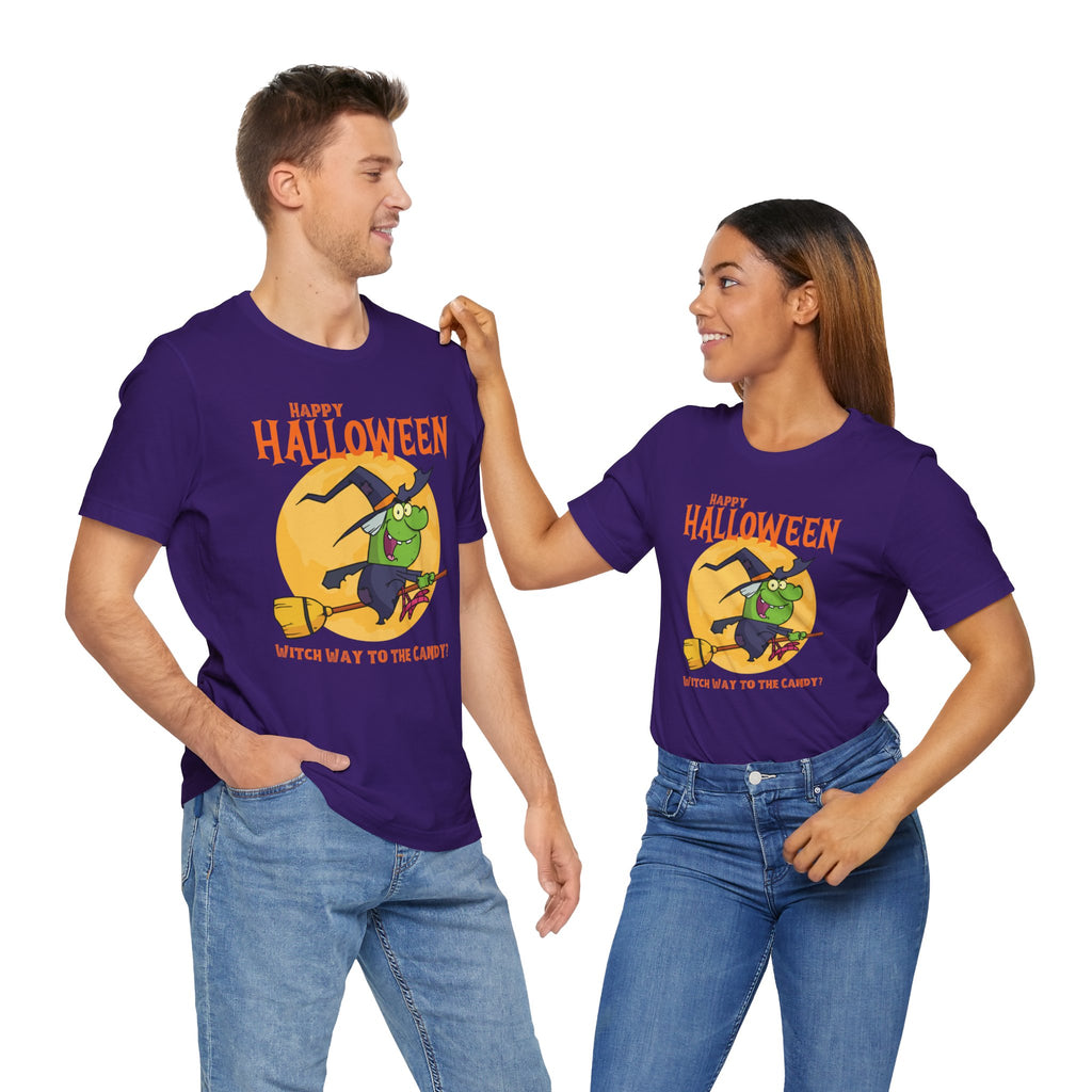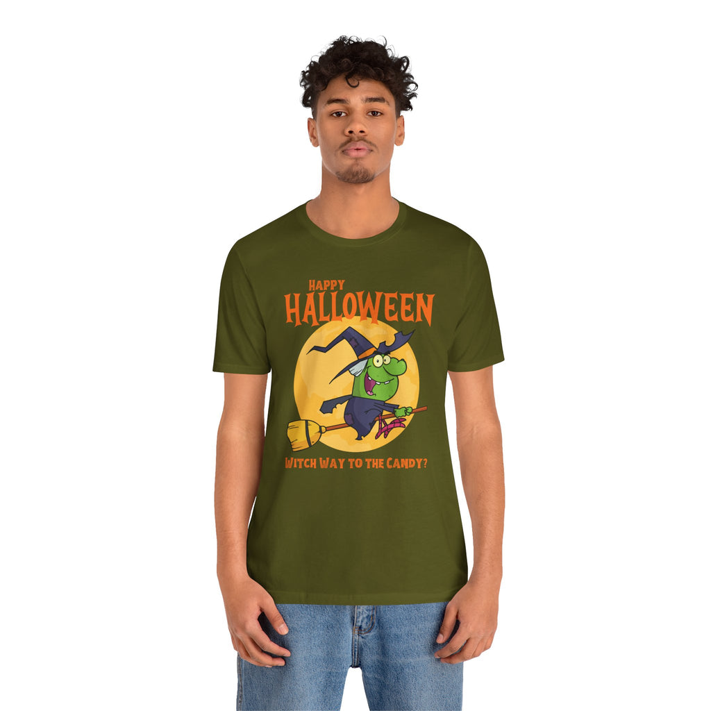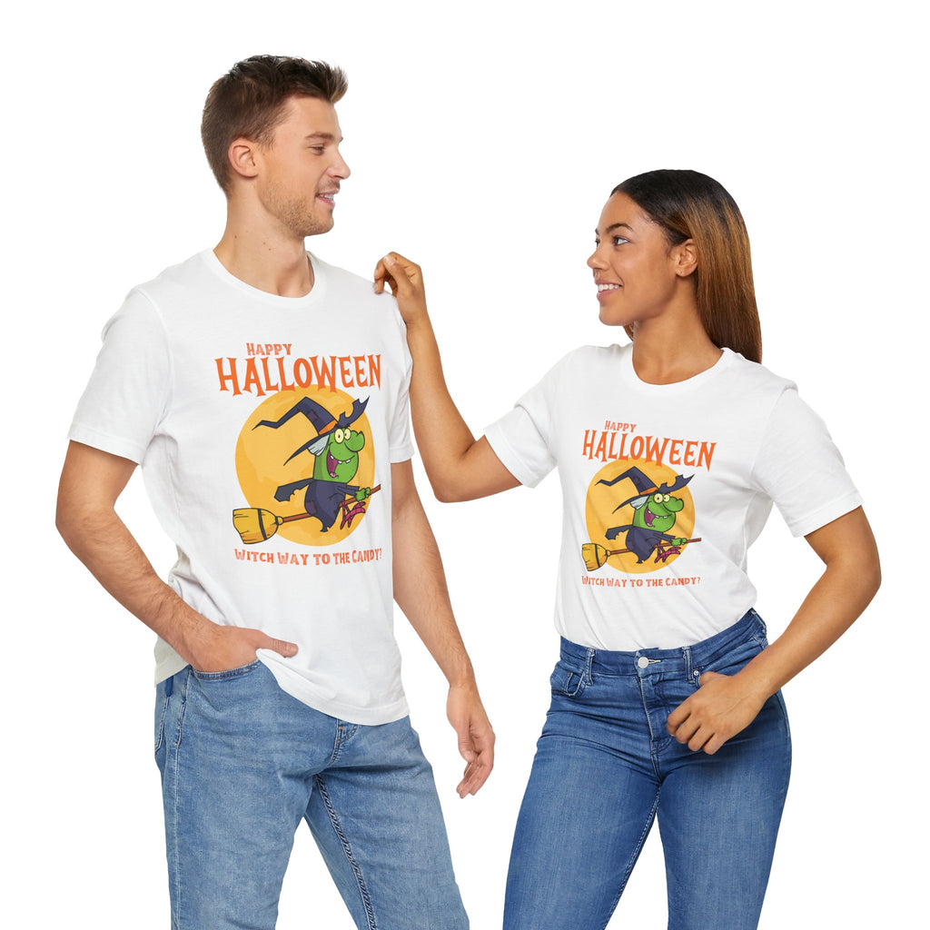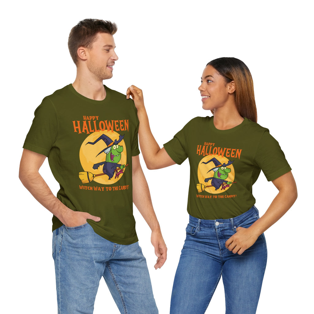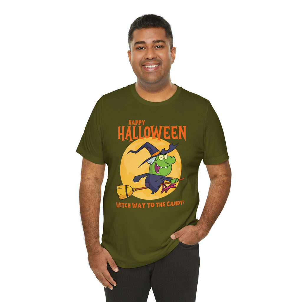 Happy Halloween Witch Way to the Candy T-Shirt | Flying Witch Front of the Moon Tee | Bella Canvas 3001Unisex | Funny Short Sleeve Tshirt