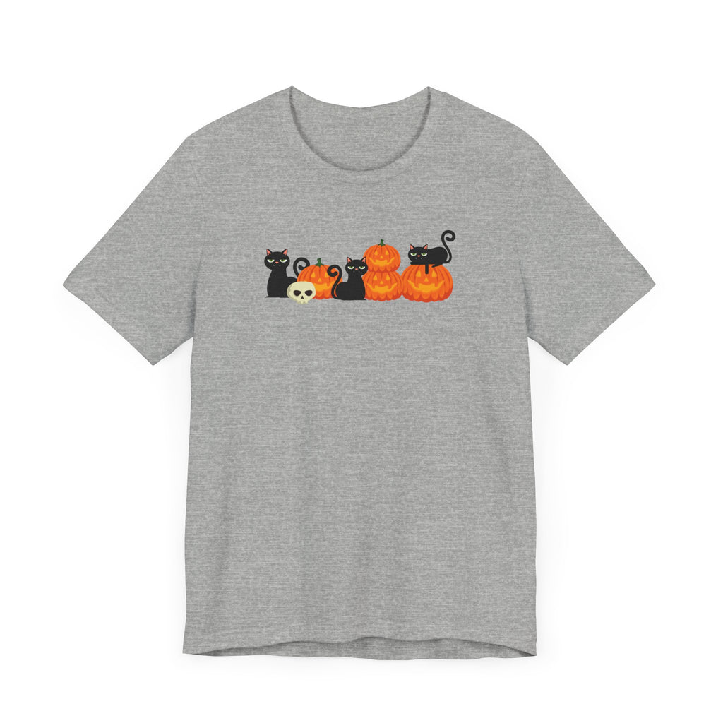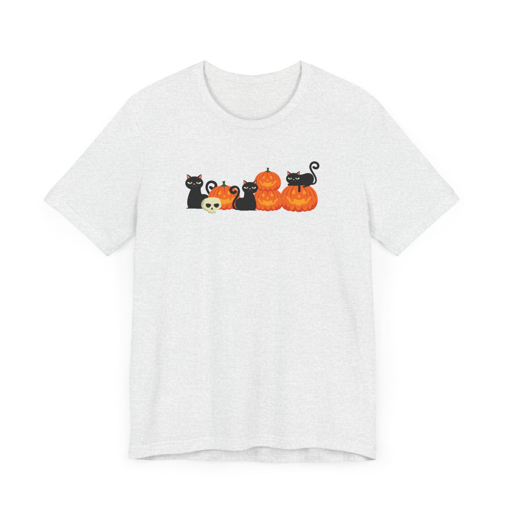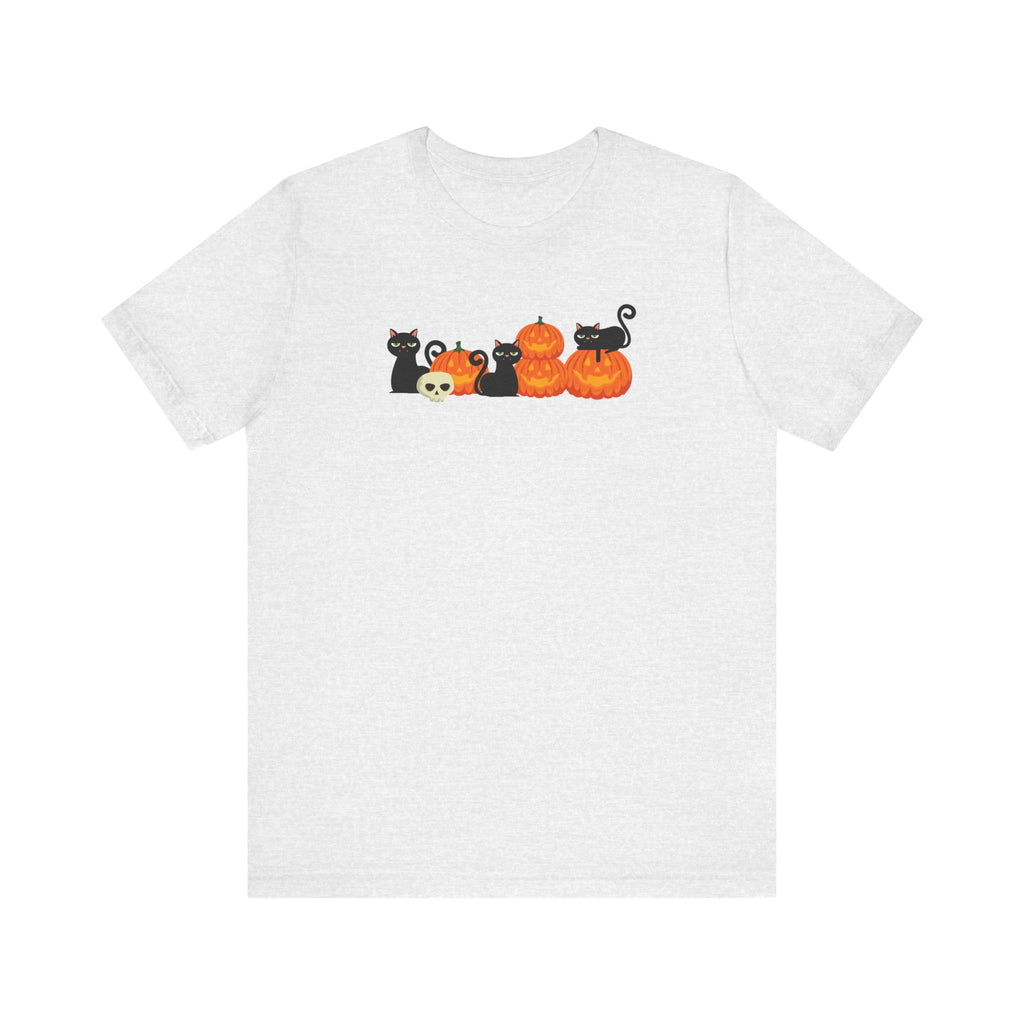 Don't miss out on this opportunity to infuse some fun into your Halloween wardrobe while proudly displaying your love for our feline friends. Our "Pumpkin Cats Halloween T-shirt" is a limited edition, so be sure to grab yours today and get ready to turn heads and elicit smiles this Halloween. Whether you're a trick-or-treater, a partygoer, or just a fan of all things Halloween, this shirt is your ticket to a purr-fectly festive and amusing celebration. Order now and experience Halloween in a whole new light – with cats, humor, and style!This classic unisex jersey short sleeve tee fits like a well-loved favorite. Soft cotton and quality print make users fall in love with it over and over again. These t-shirts have-ribbed knit collars to bolster shaping. The shoulders have taping for better fit over time. Dual side seams hold the garment's shape for longer.