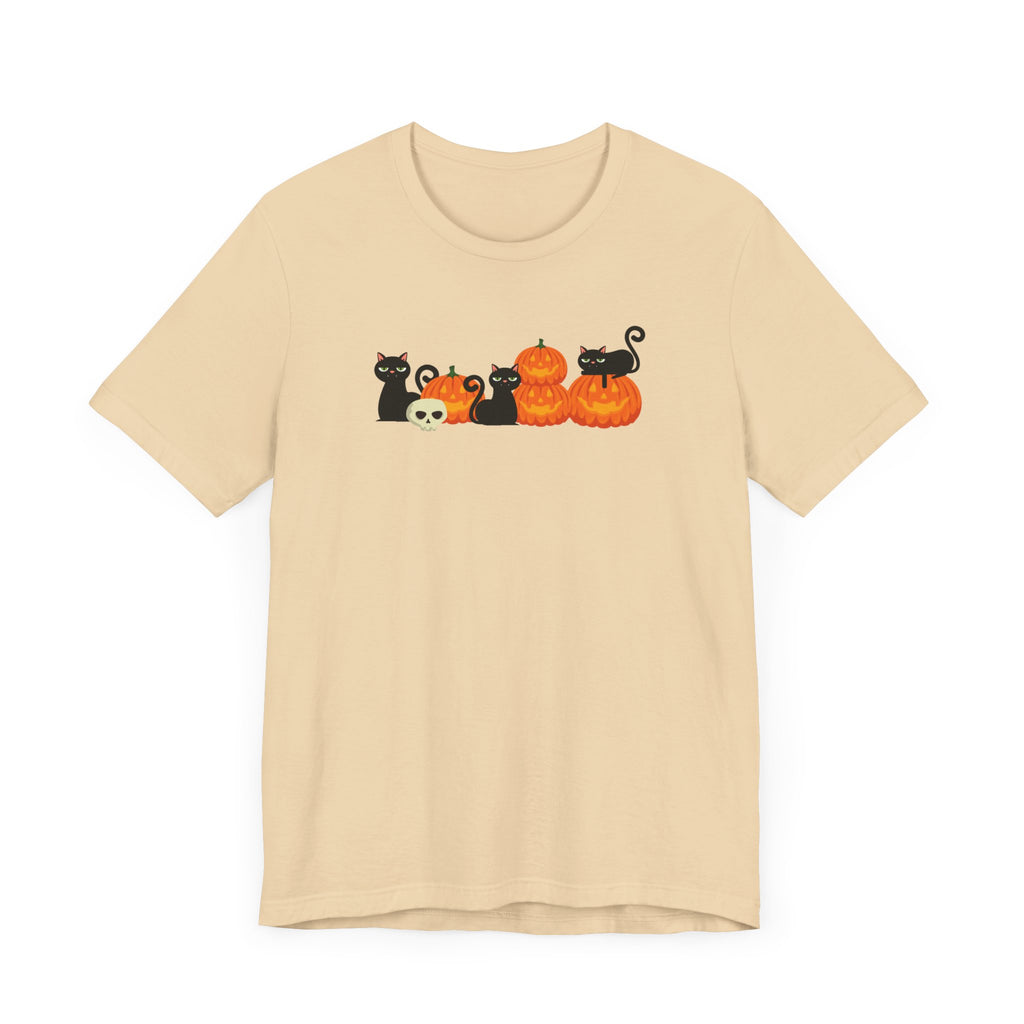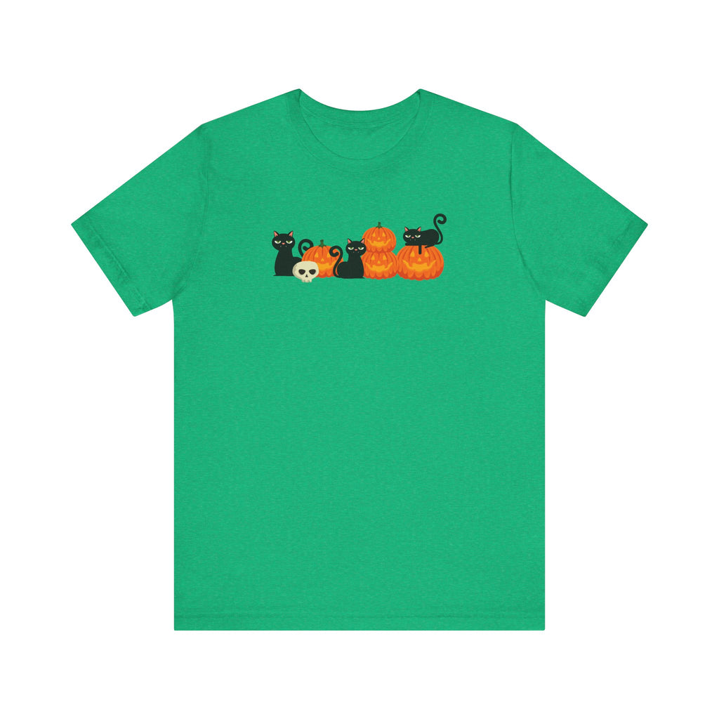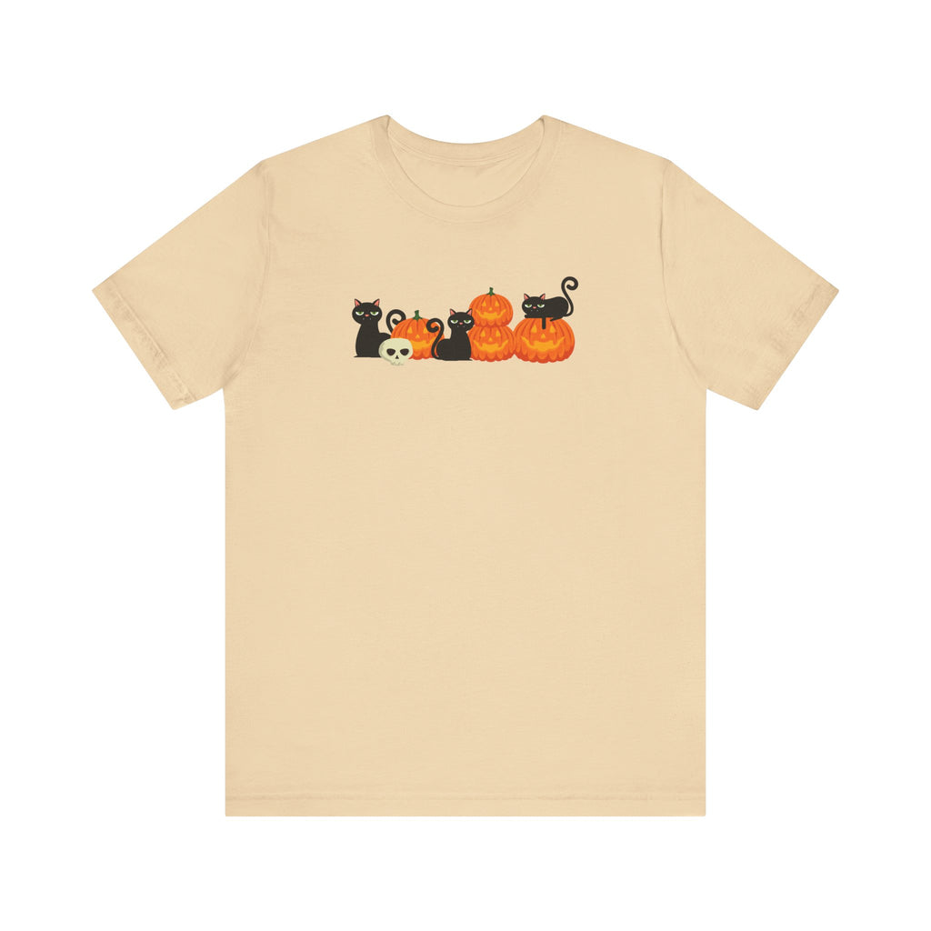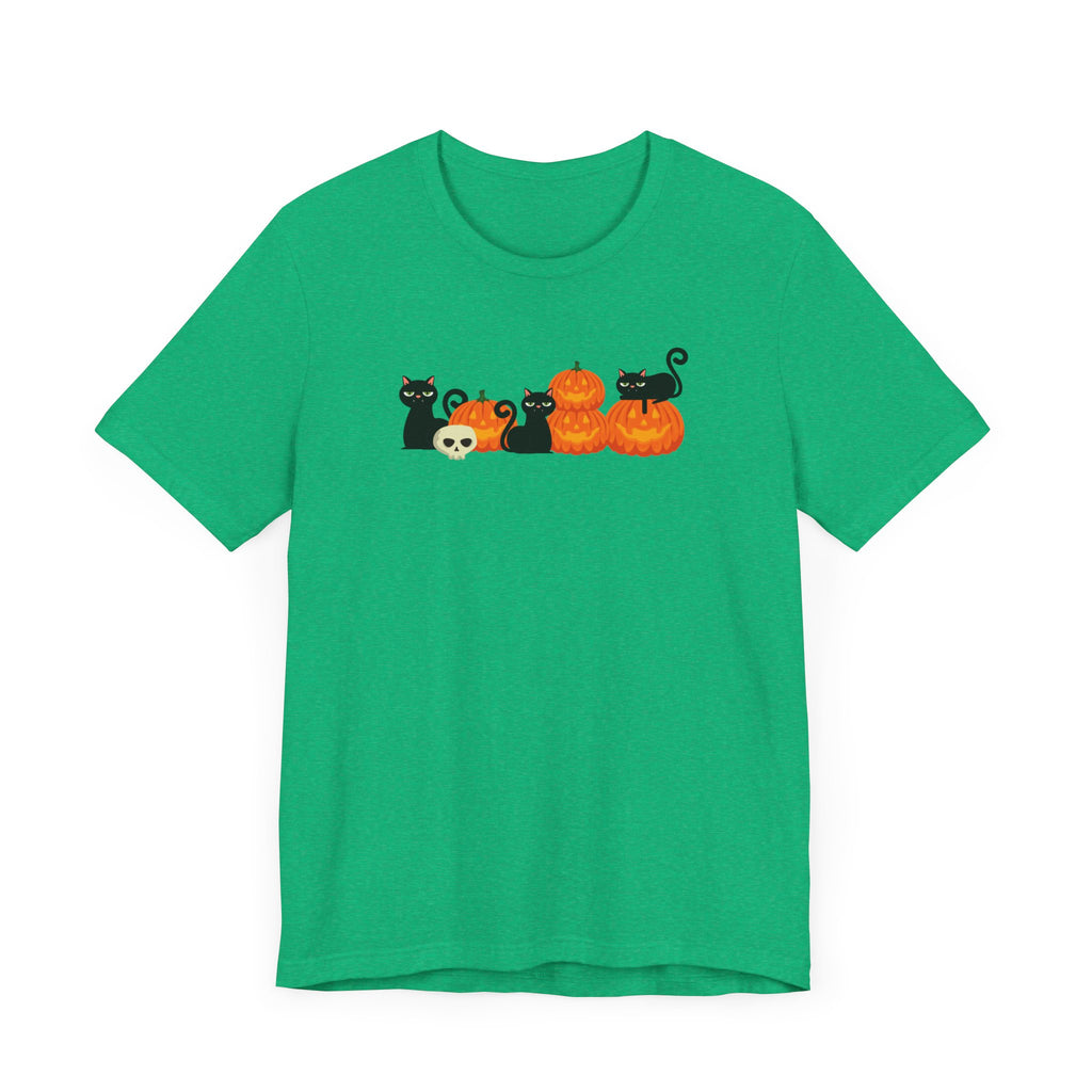 Don't miss out on this opportunity to infuse some fun into your Halloween wardrobe while proudly displaying your love for our feline friends. Our "Pumpkin Cats Halloween T-shirt" is a limited edition, so be sure to grab yours today and get ready to turn heads and elicit smiles this Halloween. Whether you're a trick-or-treater, a partygoer, or just a fan of all things Halloween, this shirt is your ticket to a purr-fectly festive and amusing celebration. Order now and experience Halloween in a whole new light – with cats, humor, and style!This classic unisex jersey short sleeve tee fits like a well-loved favorite. Soft cotton and quality print make users fall in love with it over and over again. These t-shirts have-ribbed knit collars to bolster shaping. The shoulders have taping for better fit over time. Dual side seams hold the garment's shape for longer.