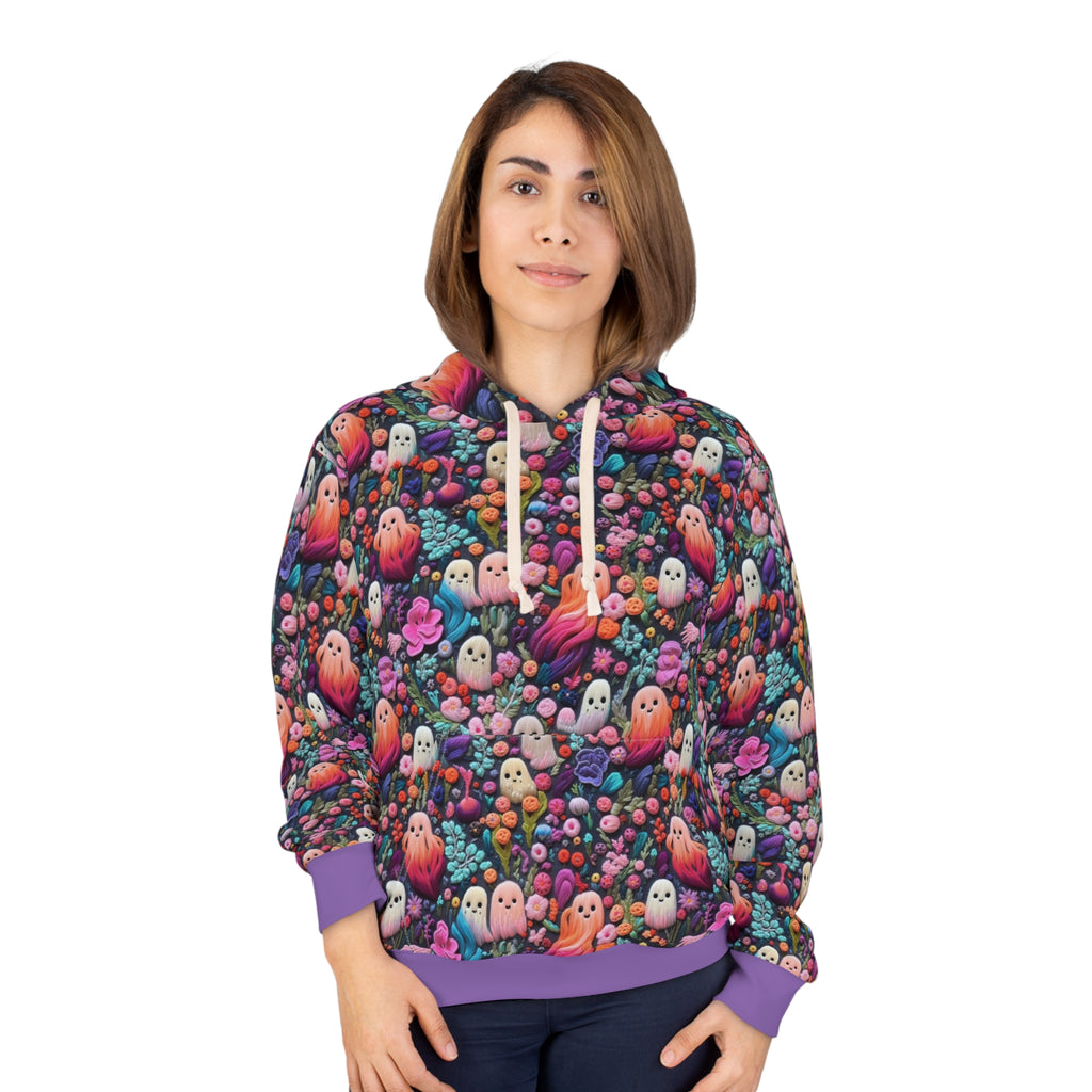 Flower Ghosts Pullover Hoodie with Faux Pink and Purple Embroidery