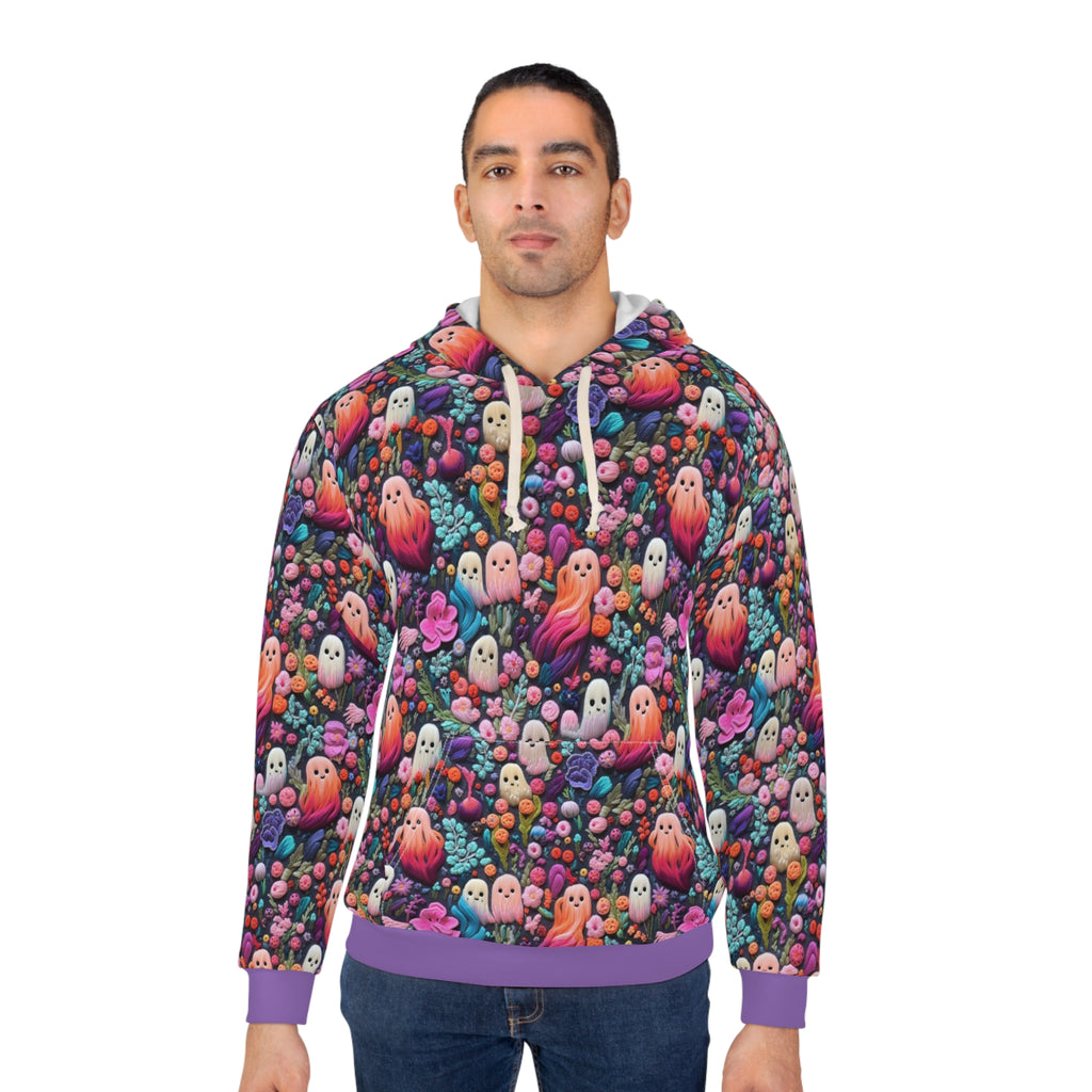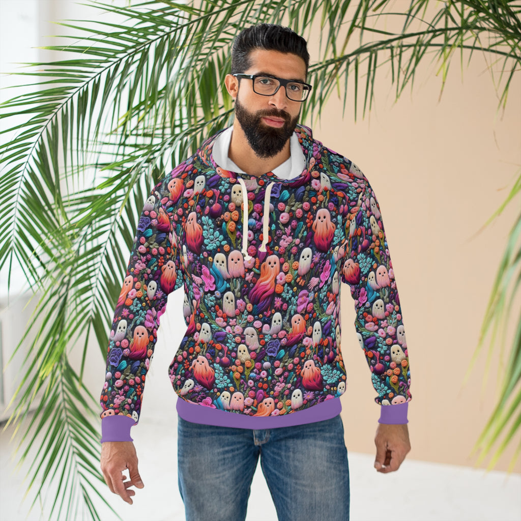Step into a realm of ethereal beauty with our 'Flower Ghosts Pullover Hoodie.' A canvas adorned with Faux Pink and Purple Embroidery, where the spirits of blooms and hues come alive in a poetic dance.