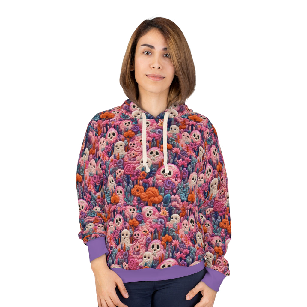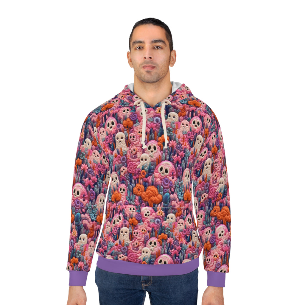 Embrace the spectral wonders of the 'Ghosted Pullover Hoodie,' and let Simulated Embroidery Pattern whisper tales of beauty and mystique. Step into a world where art and fashion converge, and poetry resides in every stitch. Amidst the changing leaves, adorn yourself in style that's as ephemeral and magical as the seasons themselves.