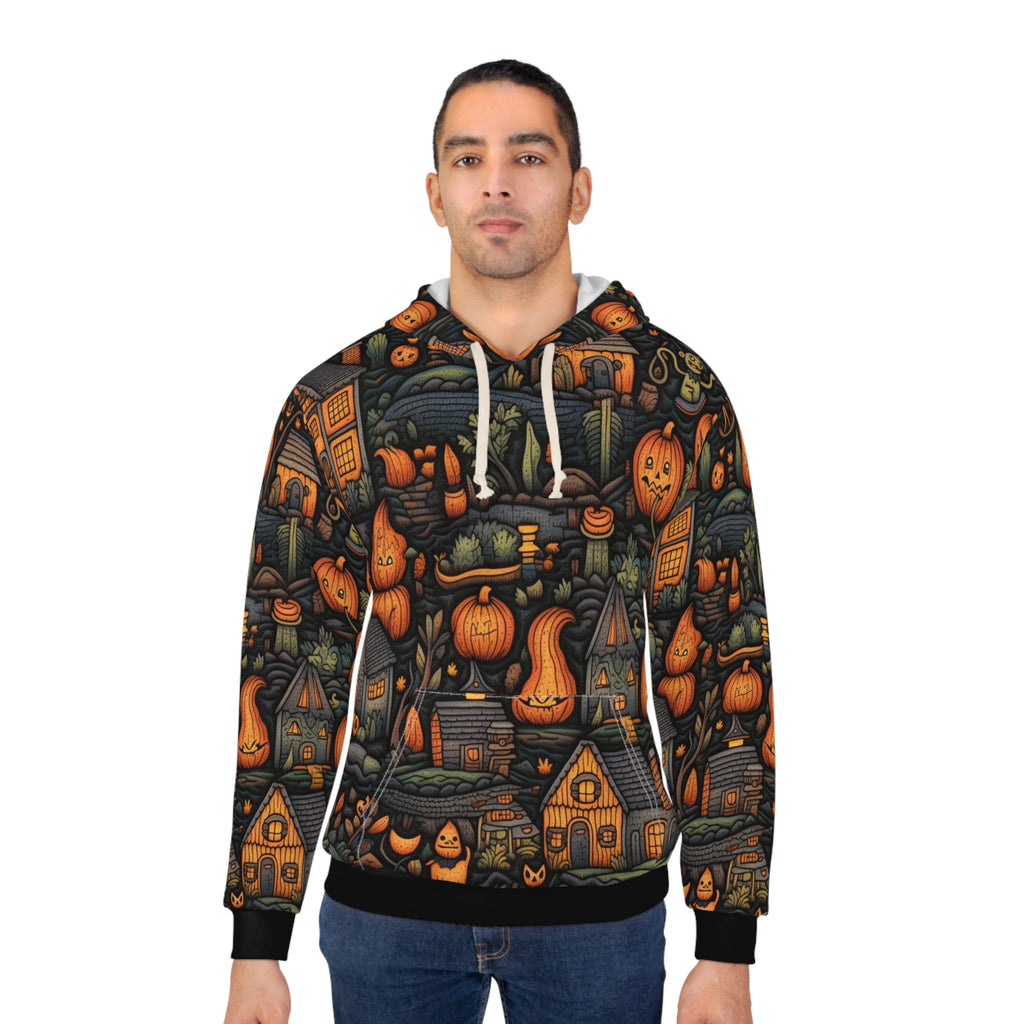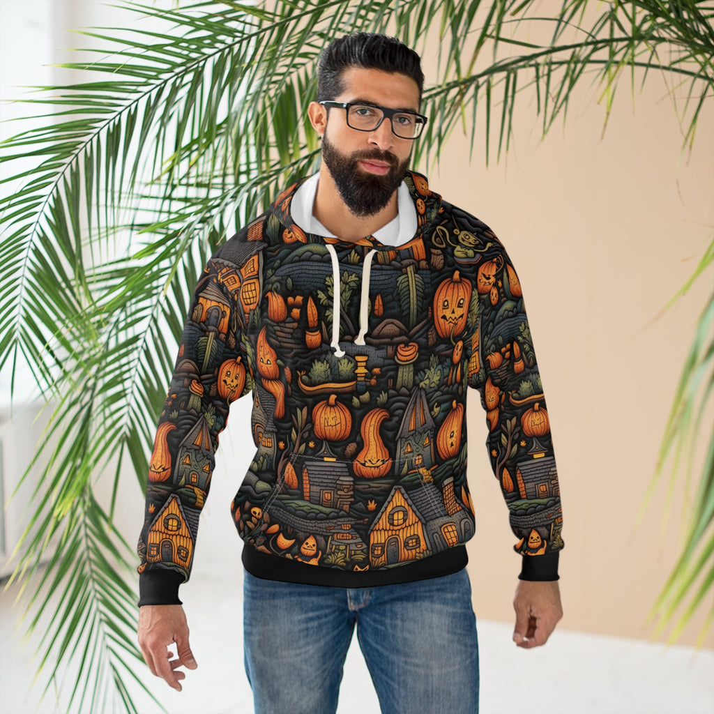Let the Hoodie's design be your guide through the labyrinth of shadows, where patterns meld like stories whispered in the night. A spectral town that mirrors the allure of the season, all enfolded within the warmth of a sweatshirt's embrace.