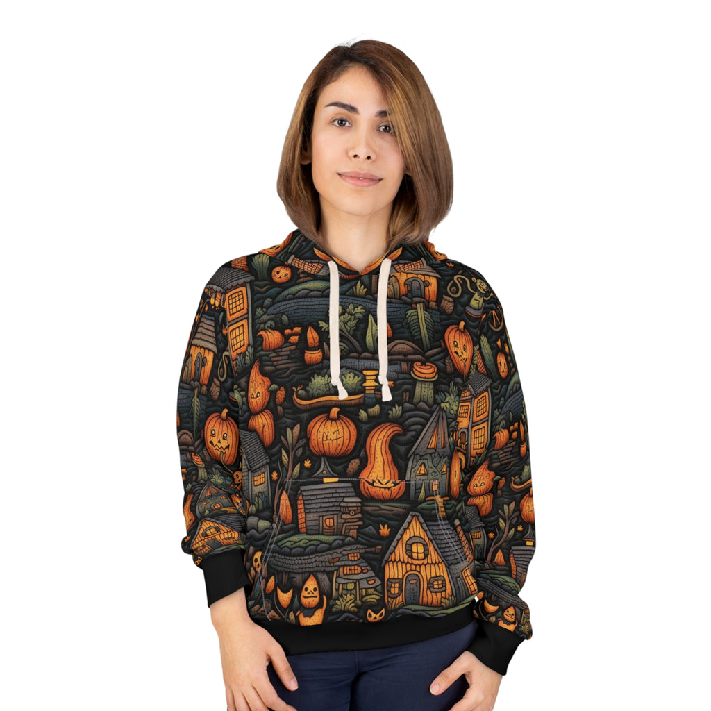 Scary Town Pullover Hoodie, Simulated Embroidery Orange and Blue Pattern, Fall Season Sweatshirt, UnisexPullover Hoodie