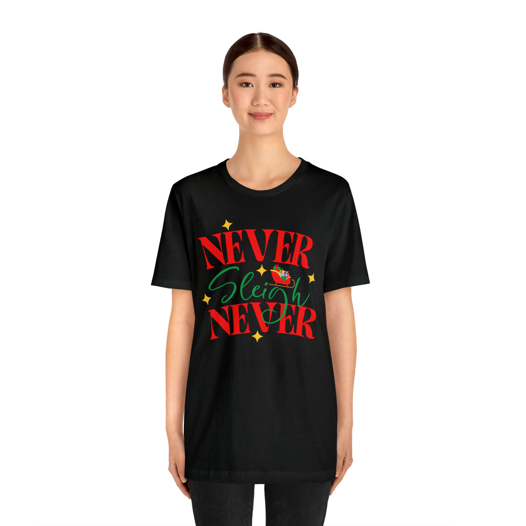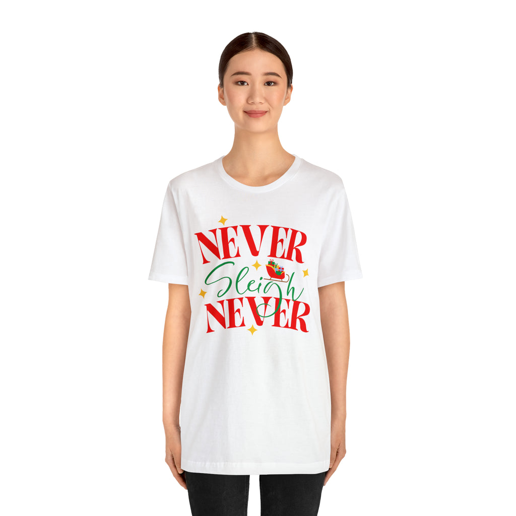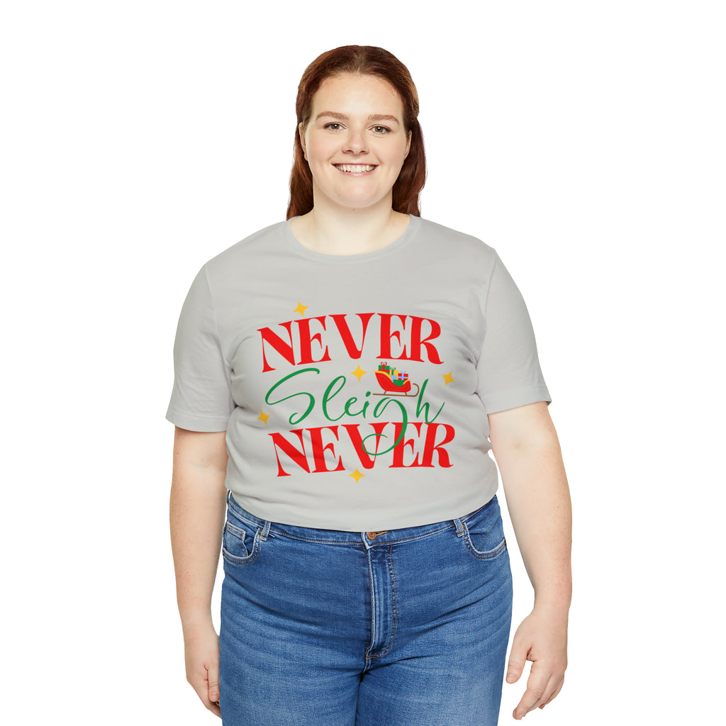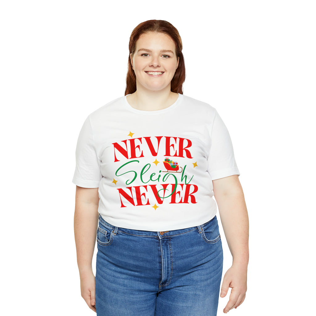 Embrace the holiday spirit with a twist of humor with this witty Christmas tee. The shirt features a clever play on words, saying "Never Sleigh Never Merry Christmas," adding a lighthearted and fun touch to the season. Get ready to spread smiles and laughter wherever you go with this delightful T-shirt!