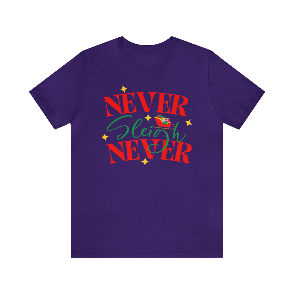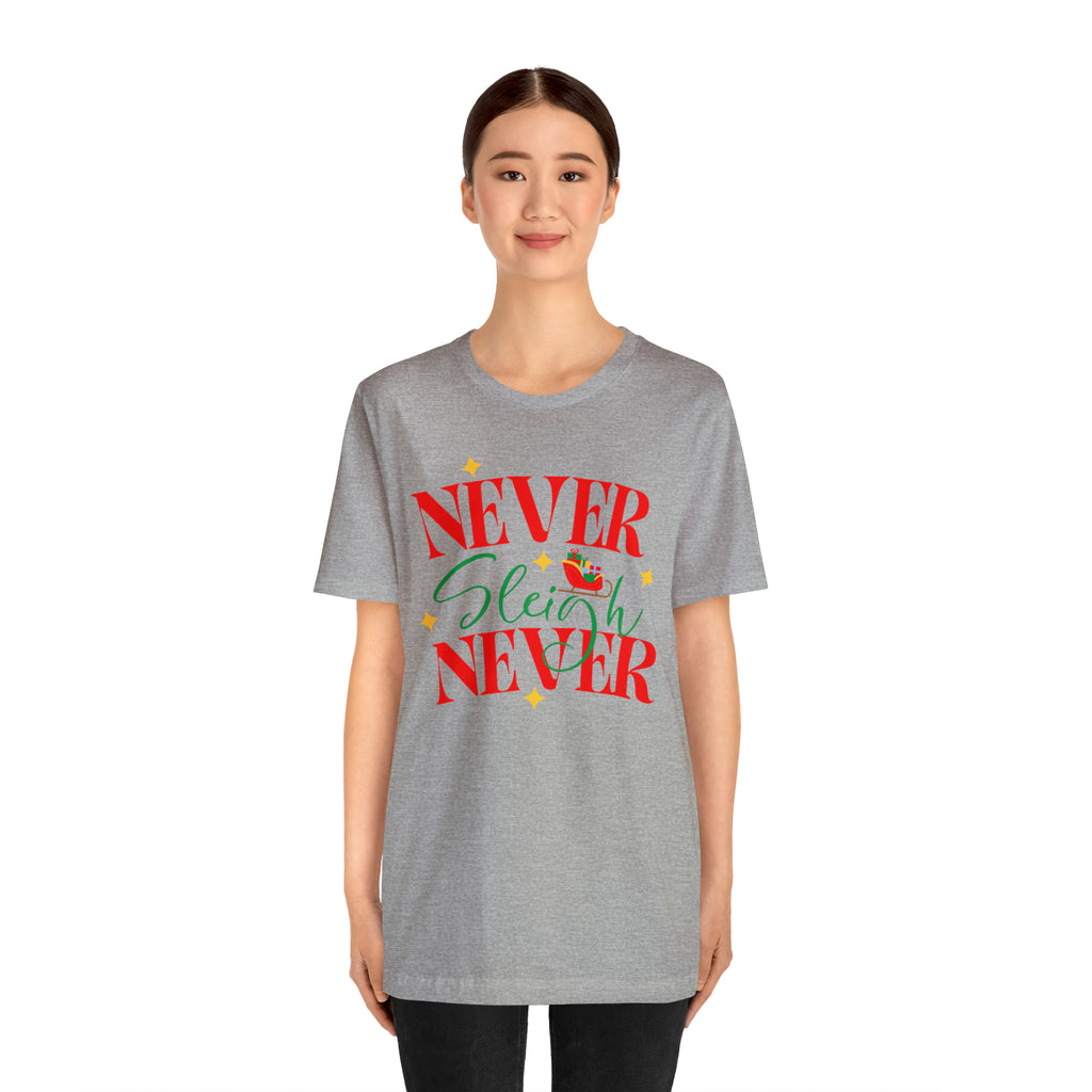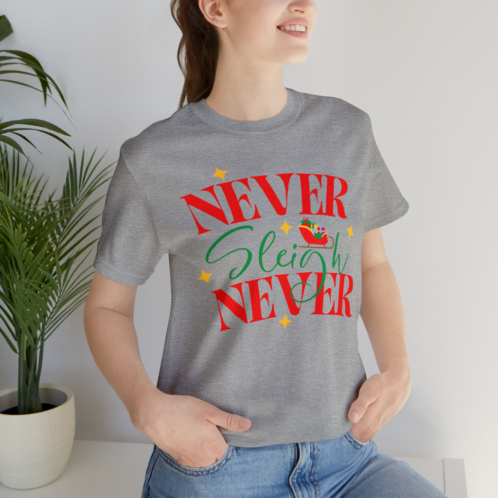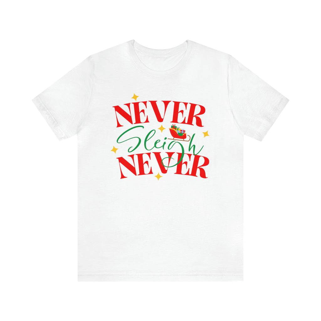 Embrace the holiday spirit with a twist of humor with this witty Christmas tee. The shirt features a clever play on words, saying "Never Sleigh Never Merry Christmas," adding a lighthearted and fun touch to the season. Get ready to spread smiles and laughter wherever you go with this delightful T-shirt!