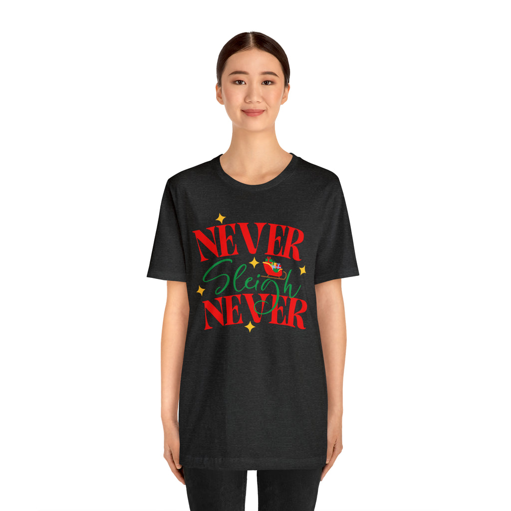 Celebrate the most wonderful time of the year with our "Never Sleigh Never Merry Christmas" T-Shirt. It's not just a shirt; it's a conversation starter and a mood-lifter during the holiday season. Wear it proudly and let the laughter and festive vibes follow you wherever you go!