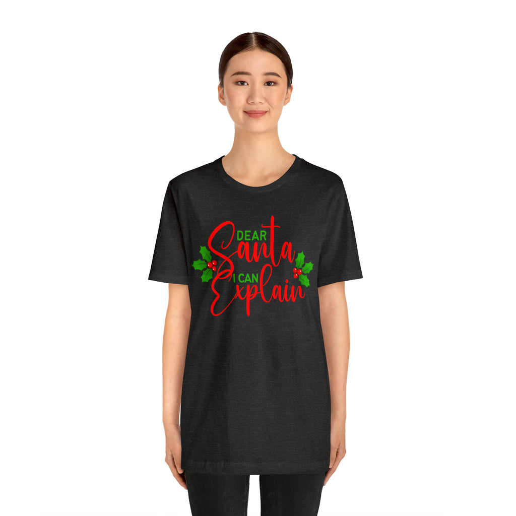 Get ready for some holiday laughs with this humorous Christmas tee. The shirt features a witty message saying "Santa I Can Explain," playfully suggesting that there might be some funny stories to tell. The festive charm of the tee captures the essence of Christmas, making it a must-have for creating cherished holiday memories filled with laughter.